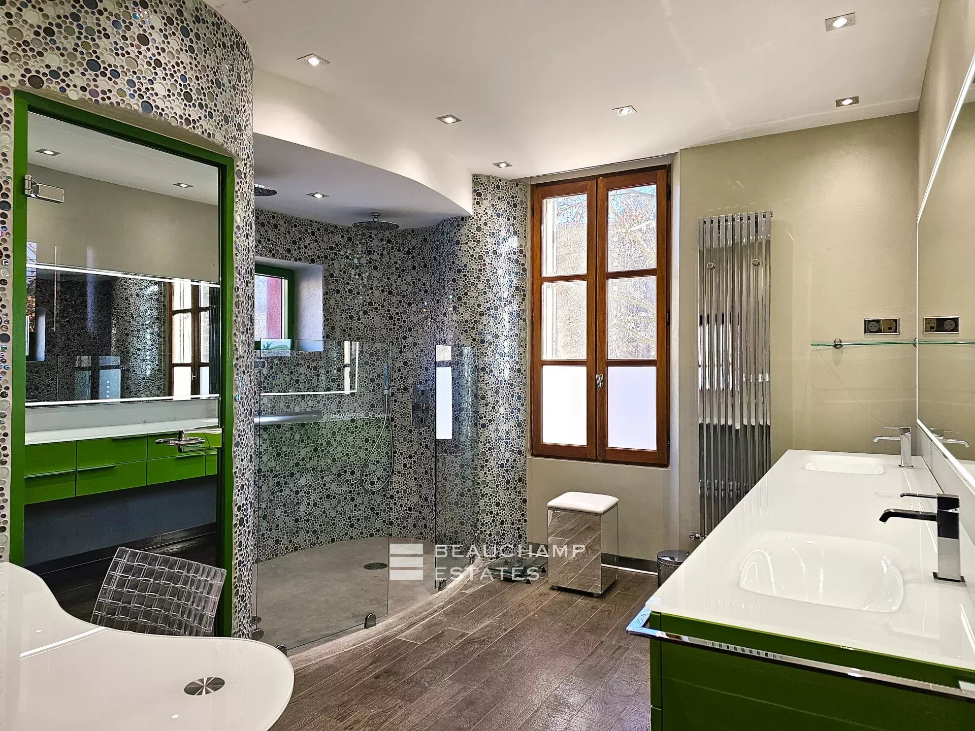 Its warm-toned façade, punctuated by generous openings and celadon green shutters, rises over three levels beneath a traditional canal tile roof, highlighting its timeless character.