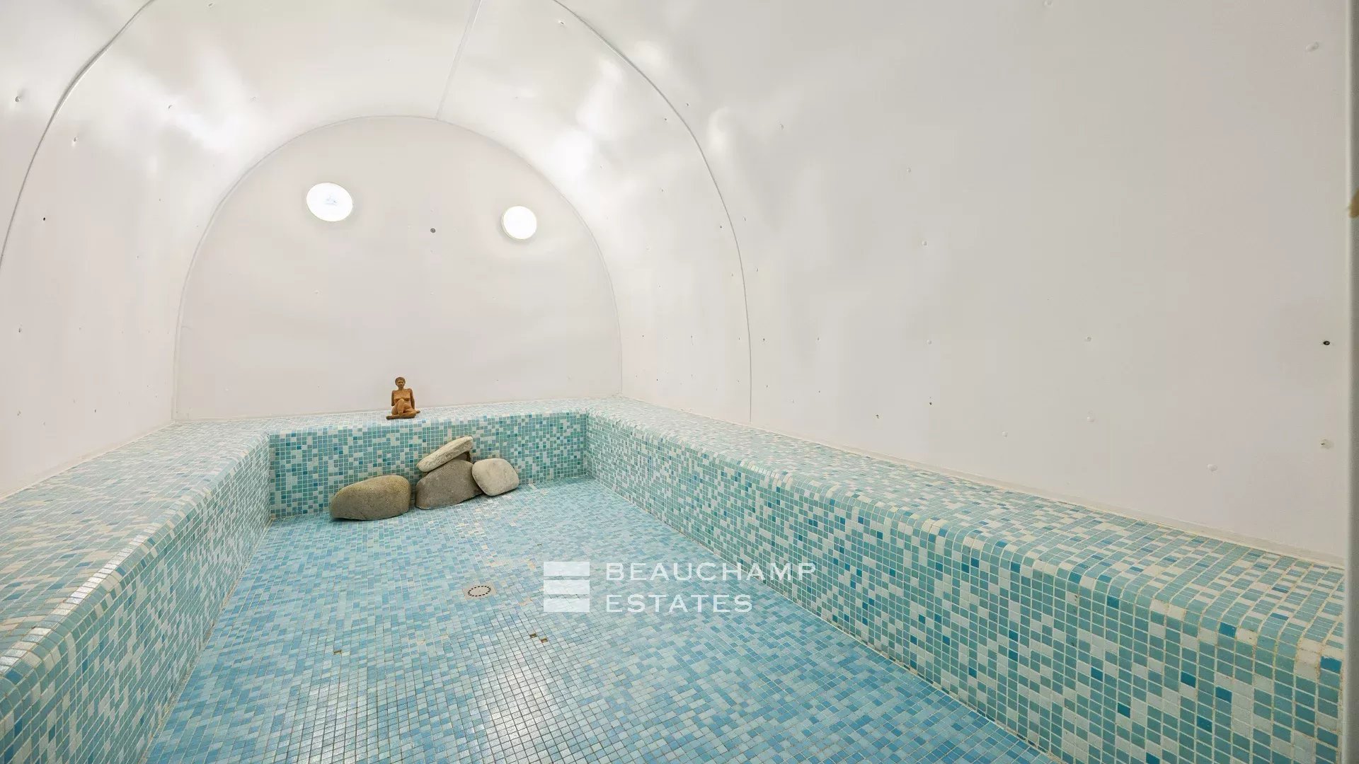 The property features 12 bedrooms, along with a 4-room guest house. It boasts a full wellness area including a swimming pool, sauna, jacuzzi, hammam, solarium, and a fitness room, as well as a consecrated chapel.