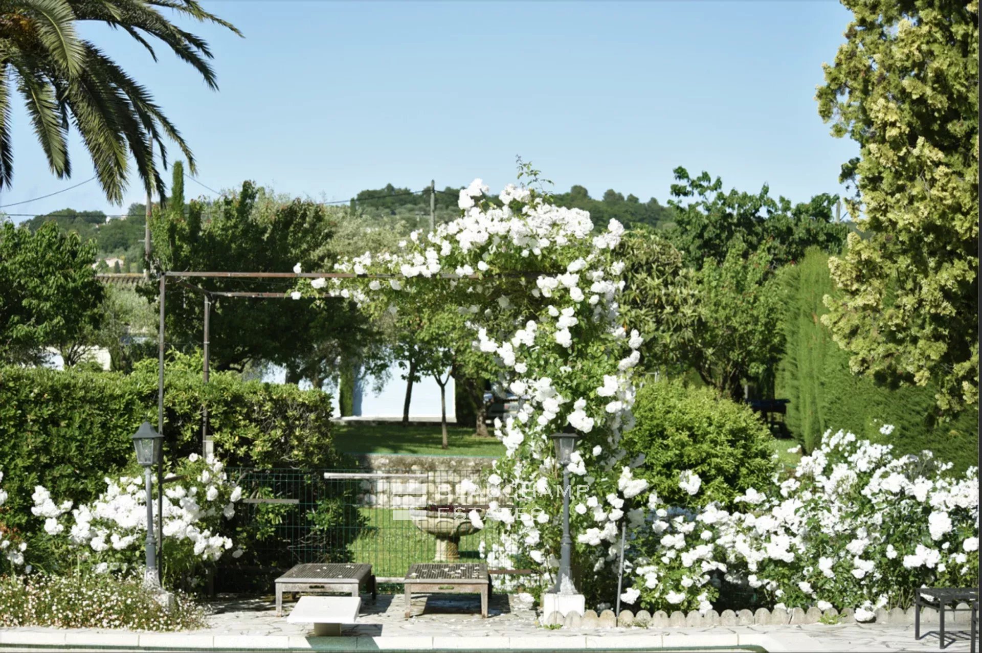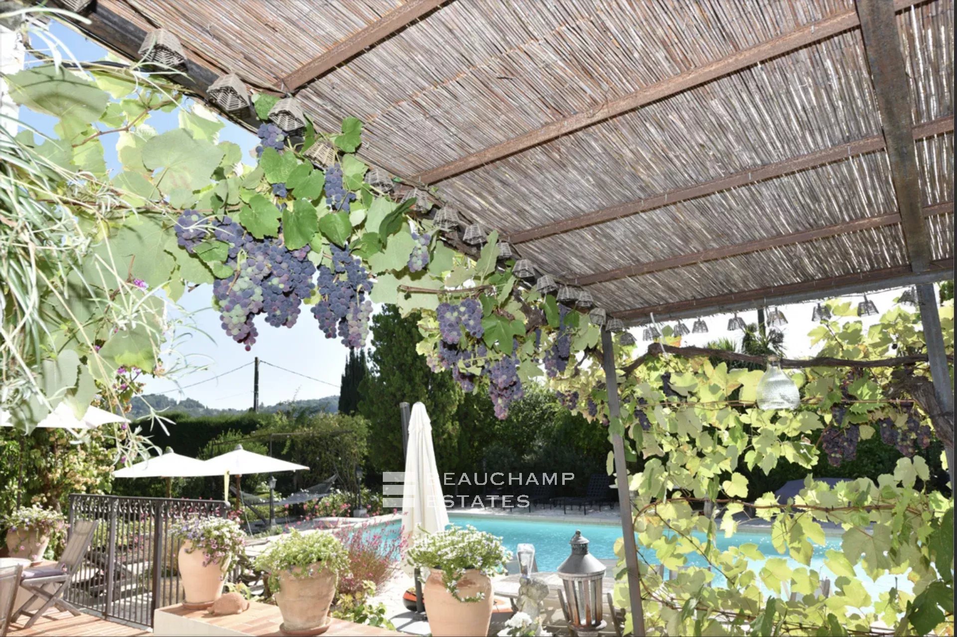 stone paved terrace in a discrete setting. There is a pool house with a barbecue spit and fridges.