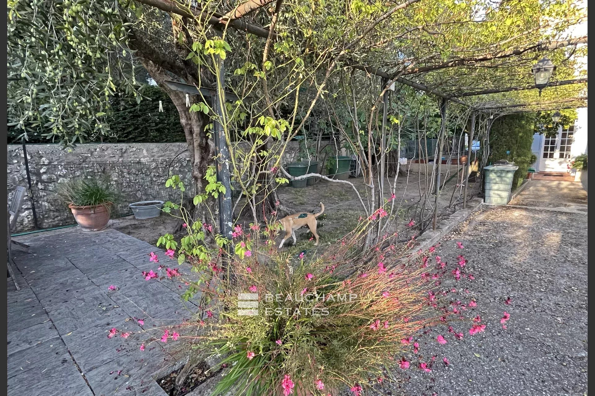 dining room have five French doors opening onto a charming, south facing terrace with a lovely vine