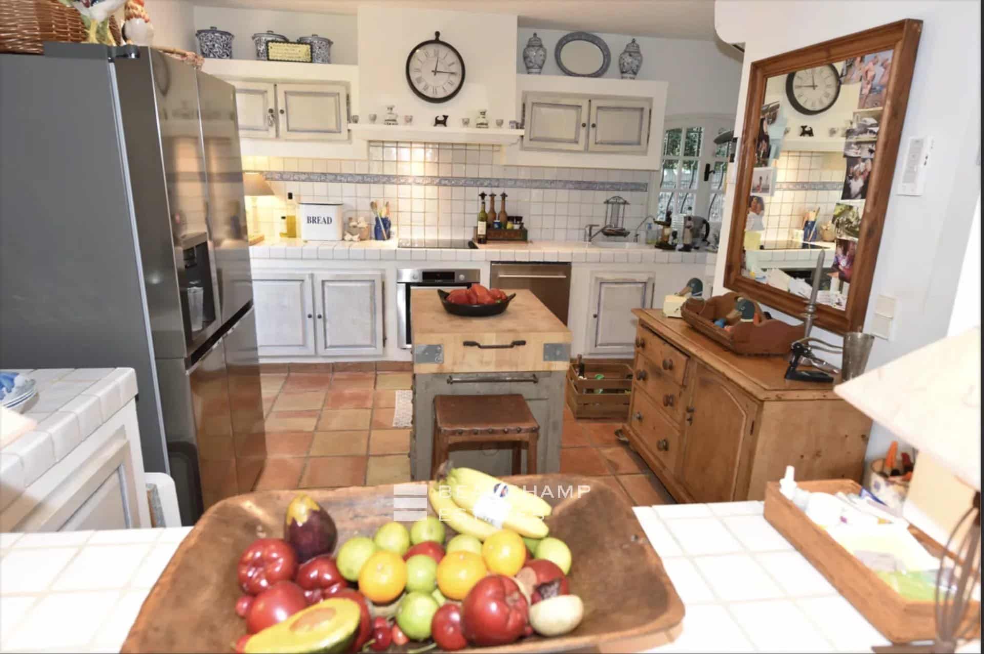 Provencal kitchen, TV room and office, all open plan with dimmer lighting. The sitting room and the