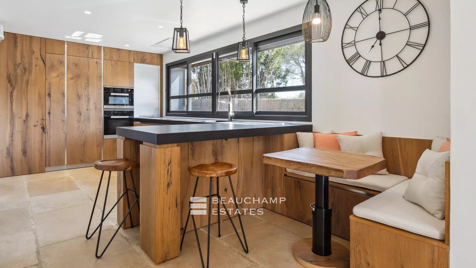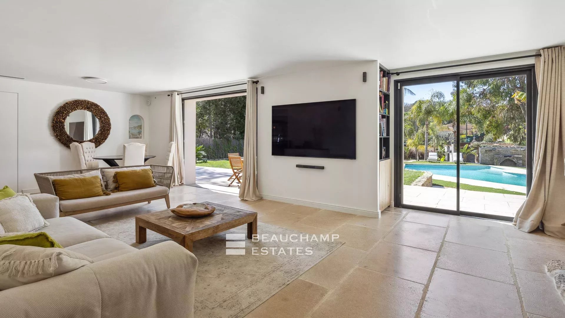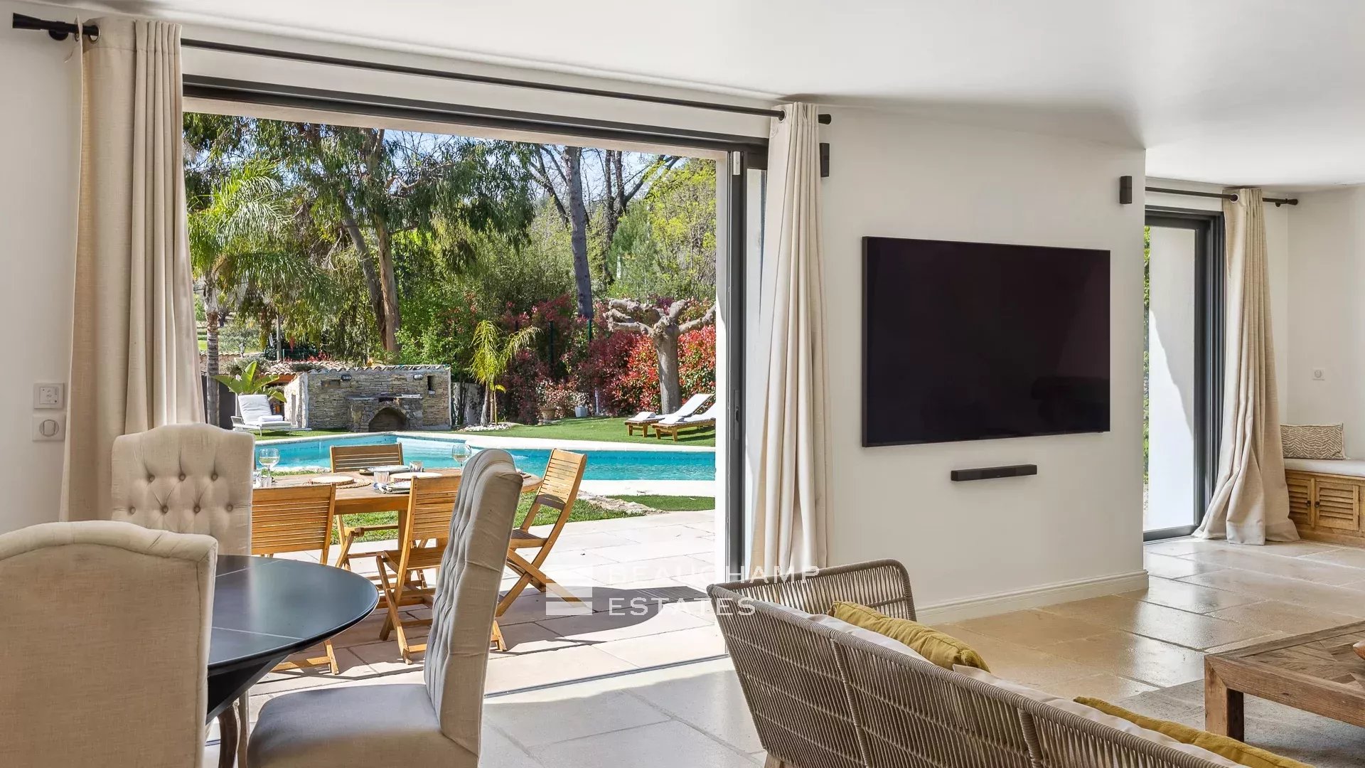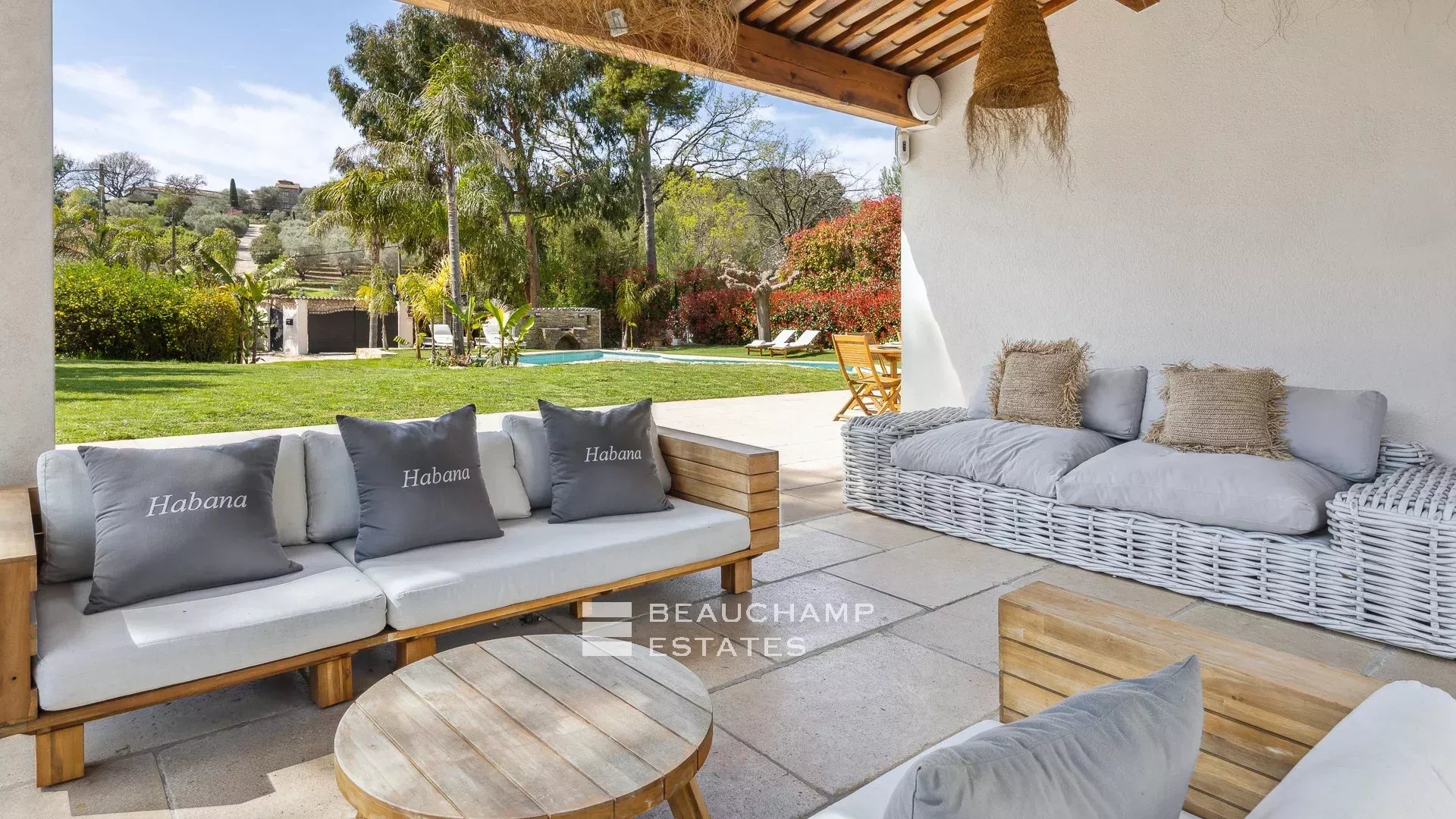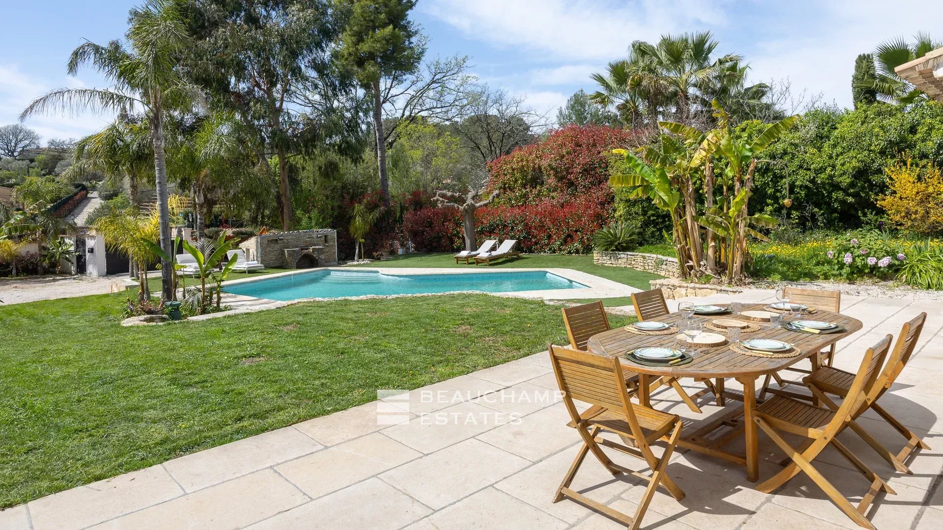 Outdoor spaces include a superb swimming pool with sunbeds, a covered outdoor dining area