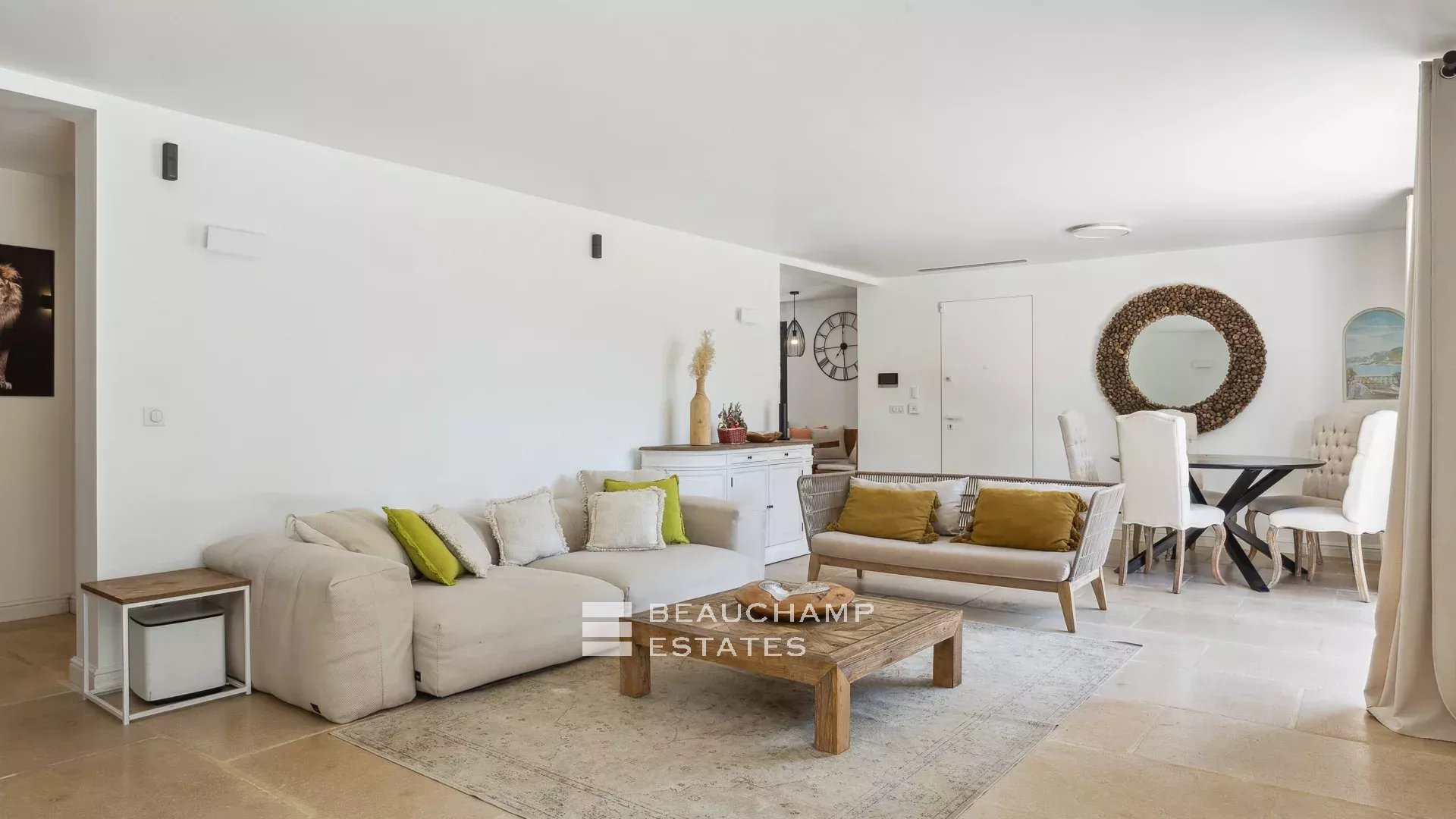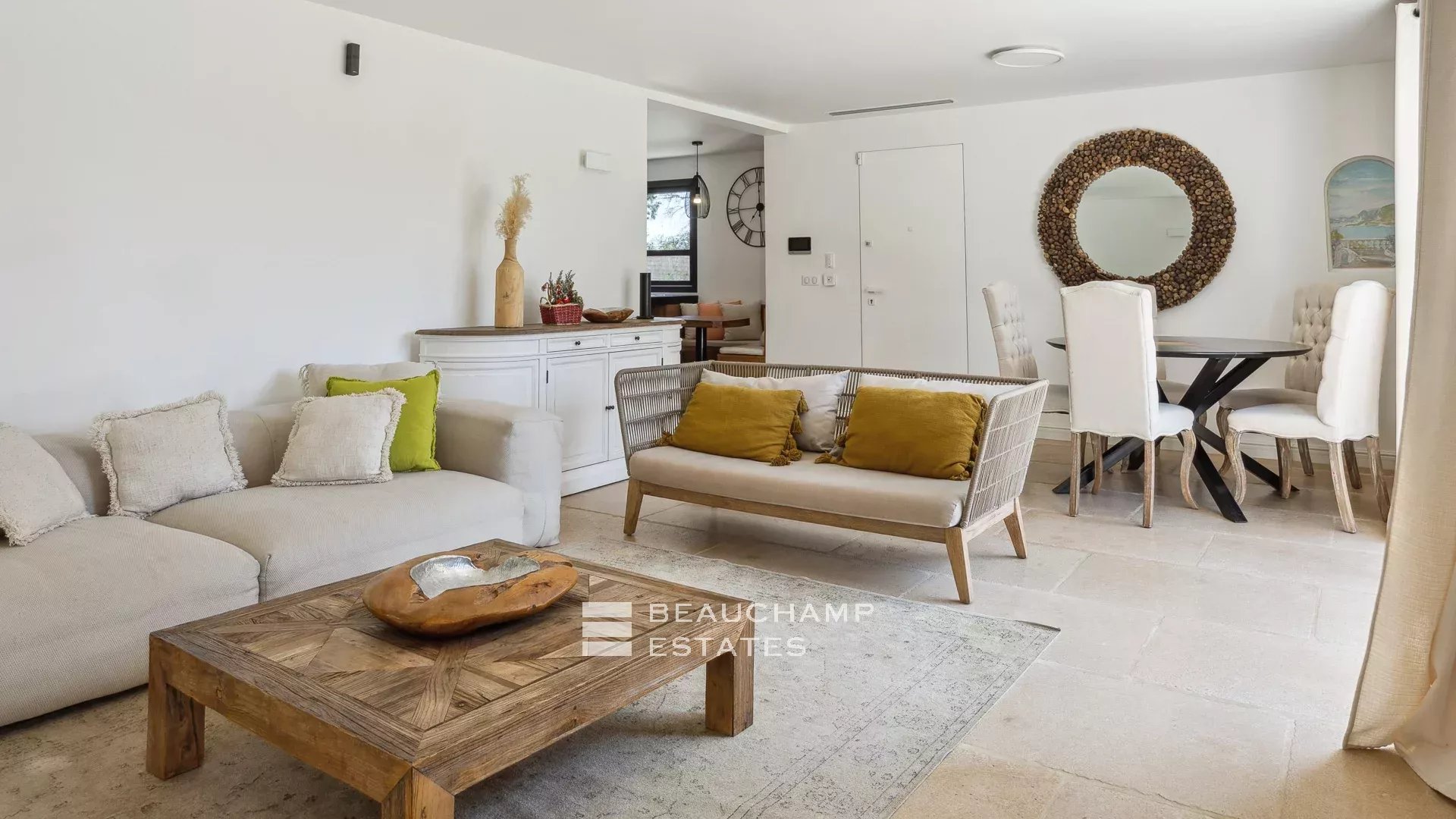 - Bright living room with lounge and dining area, opening onto the main terrace