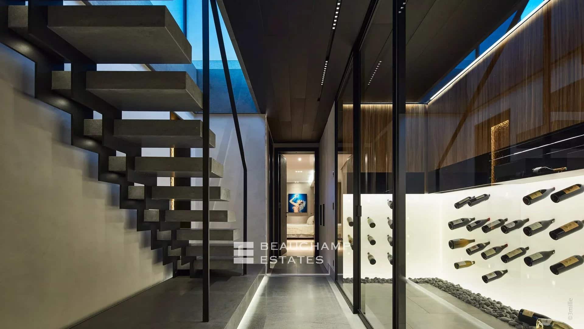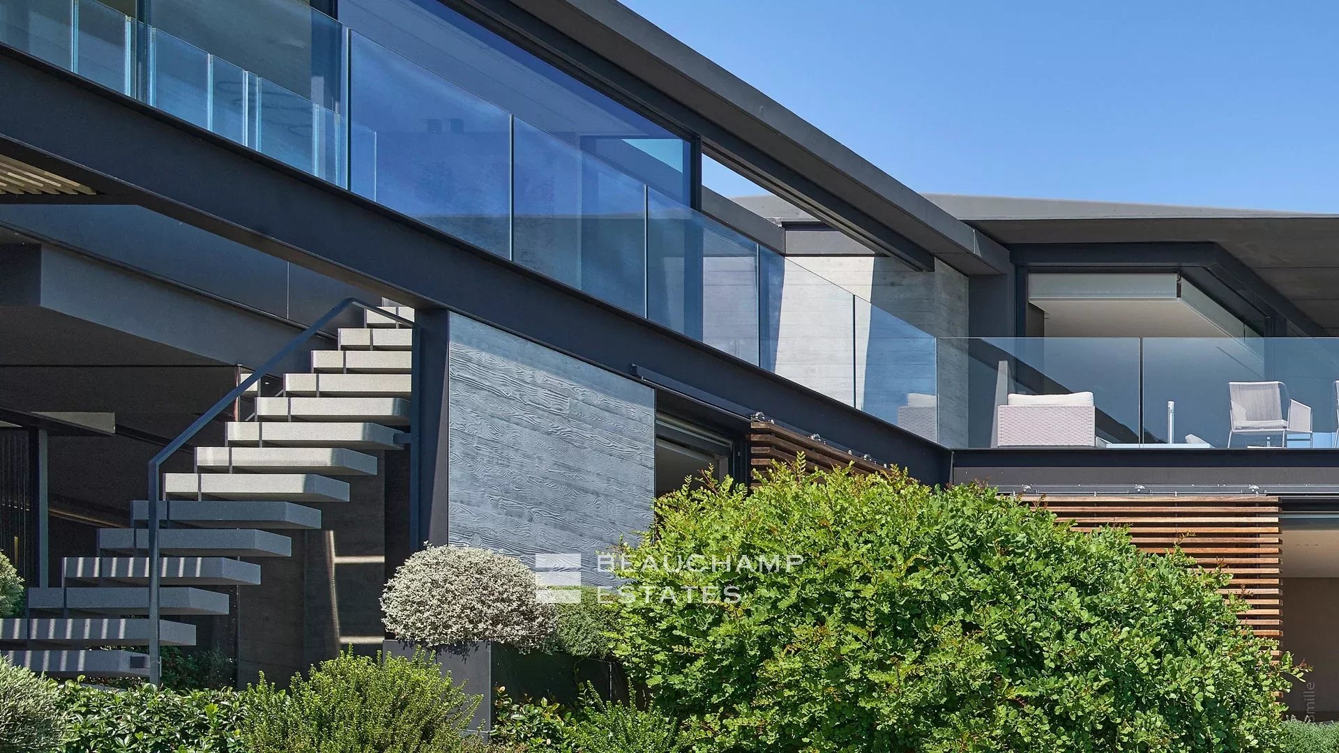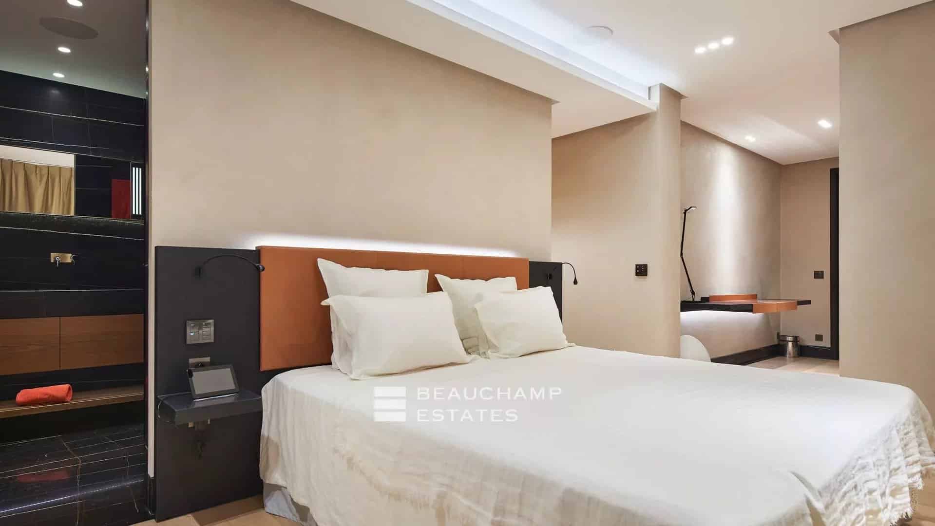 500 meters from the beaches and 10 minutes by car from St-Tropez, it is a jewel of modern architecture marked by concrete, glass, water and stone, as remarkable for its technical prowess as for the harmony of its interiors and its garden.