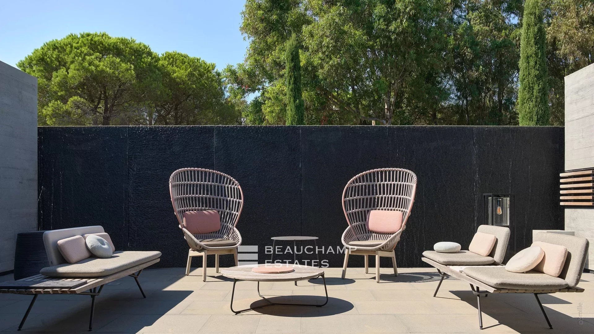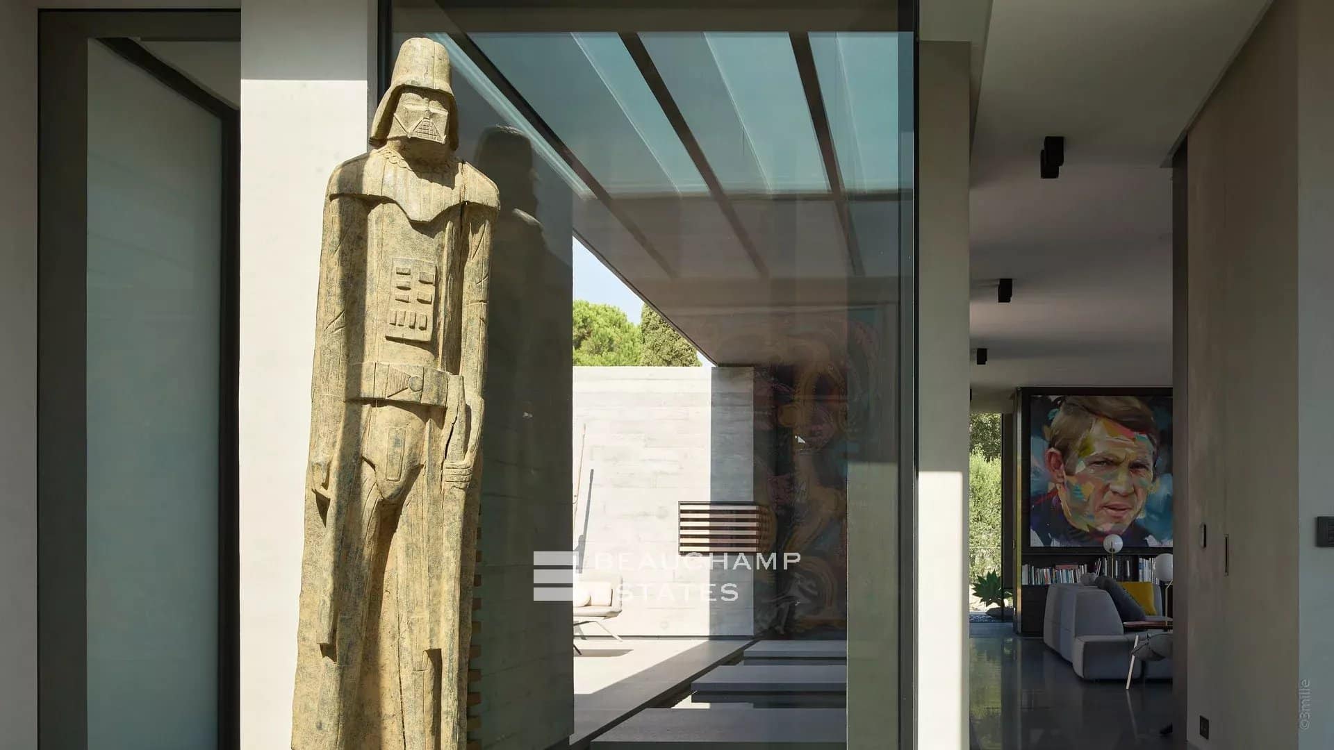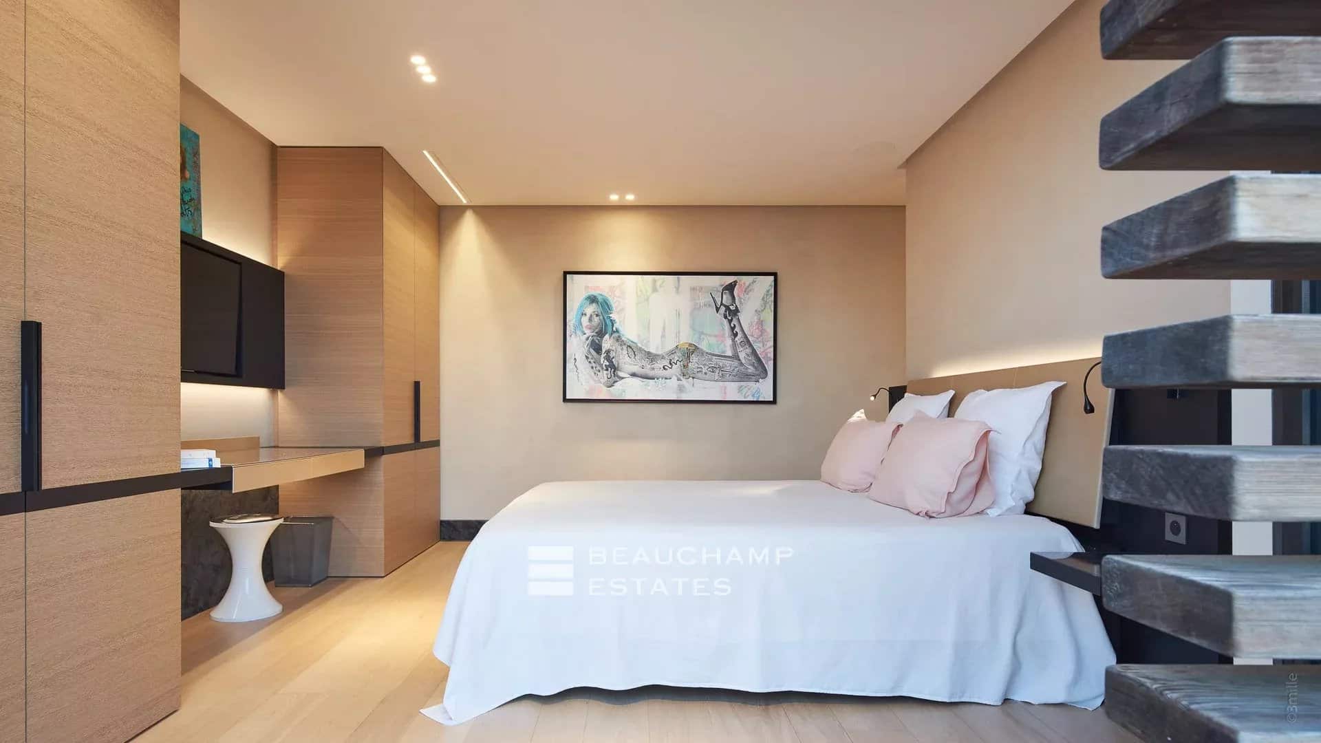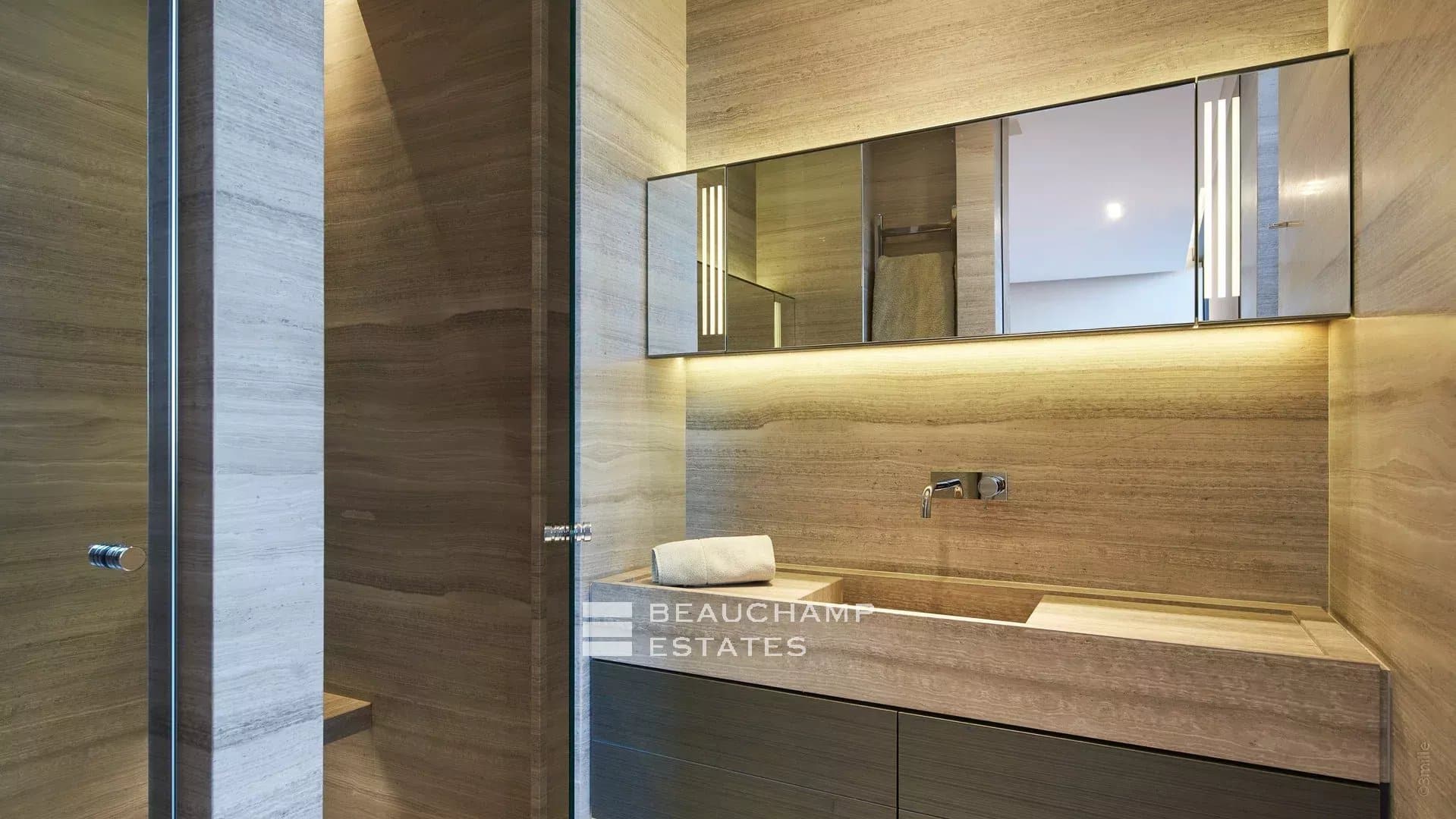 500 meters from the beaches and 10 minutes by car from St-Tropez, it is a jewel of modern architecture marked by concrete, glass, water and stone, as remarkable for its technical prowess as for the harmony of its interiors and its garden.