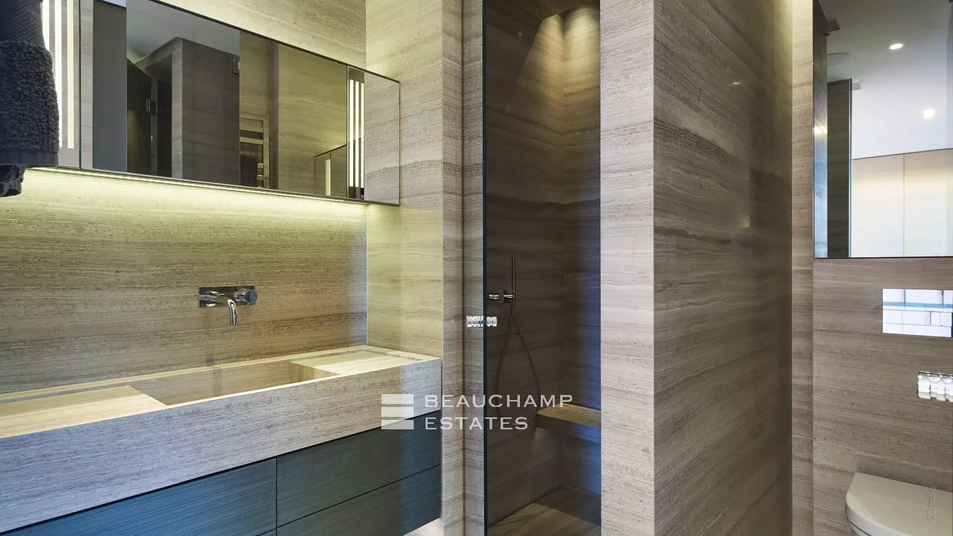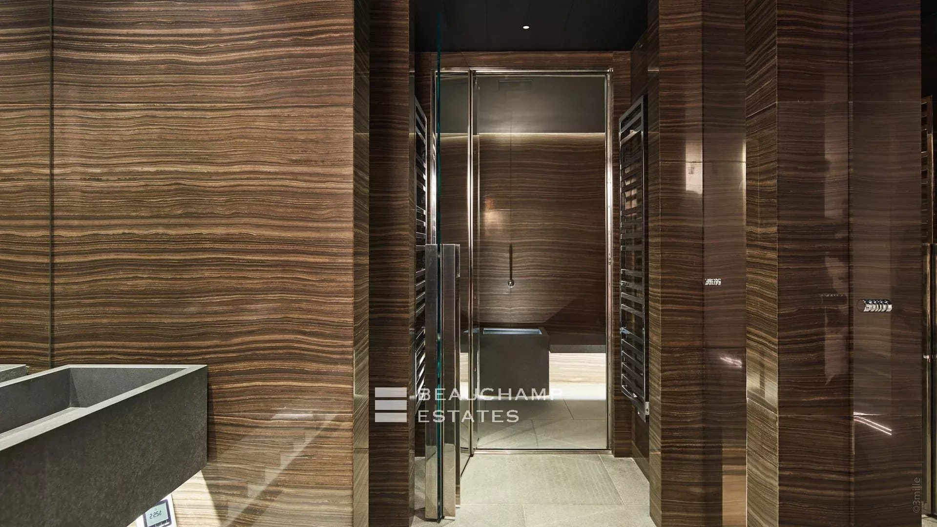 • Large heated mirror pool in black granite with counter-current swimming and massage nozzles