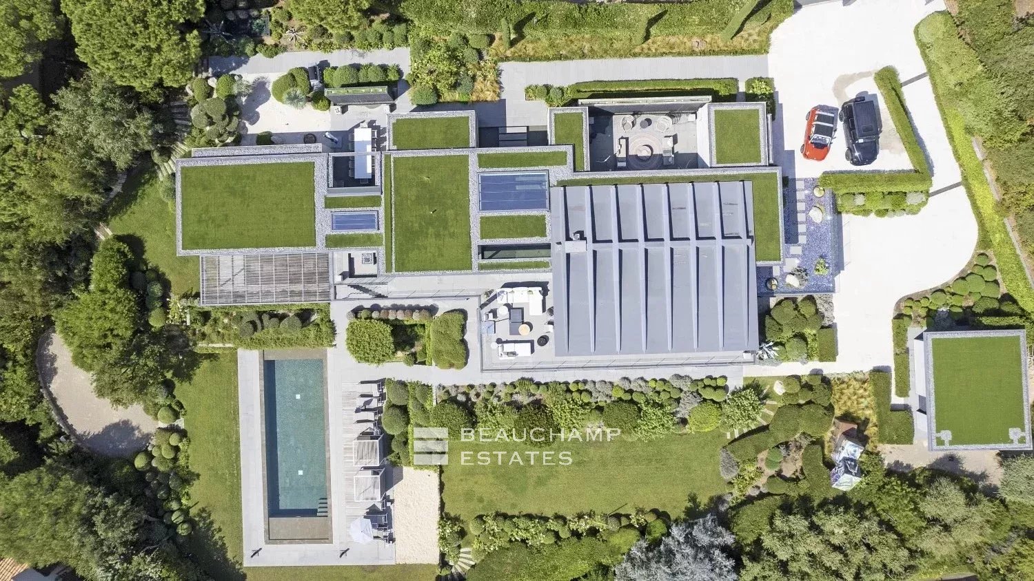 Arranged on two levels, it offers a total surface area of 650 m² on a Mediterranean garden of 3 900 m² and is composed as follows: