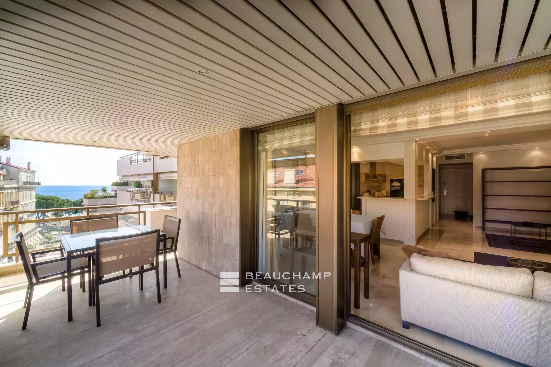 - Large veranda and terrace overlooking the streets of Cannes : complete with table and seating for up to four