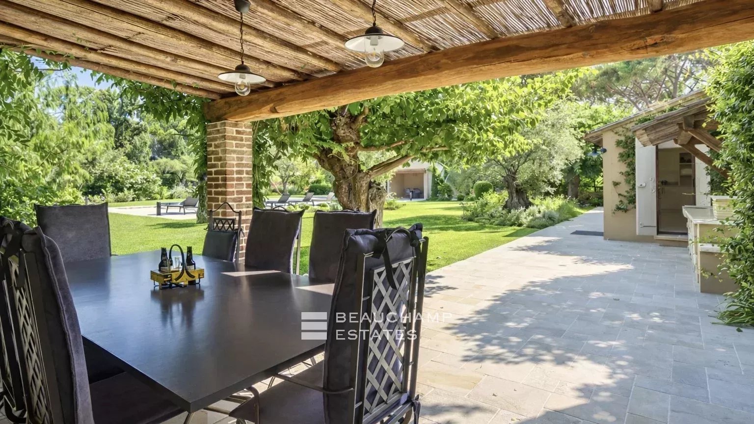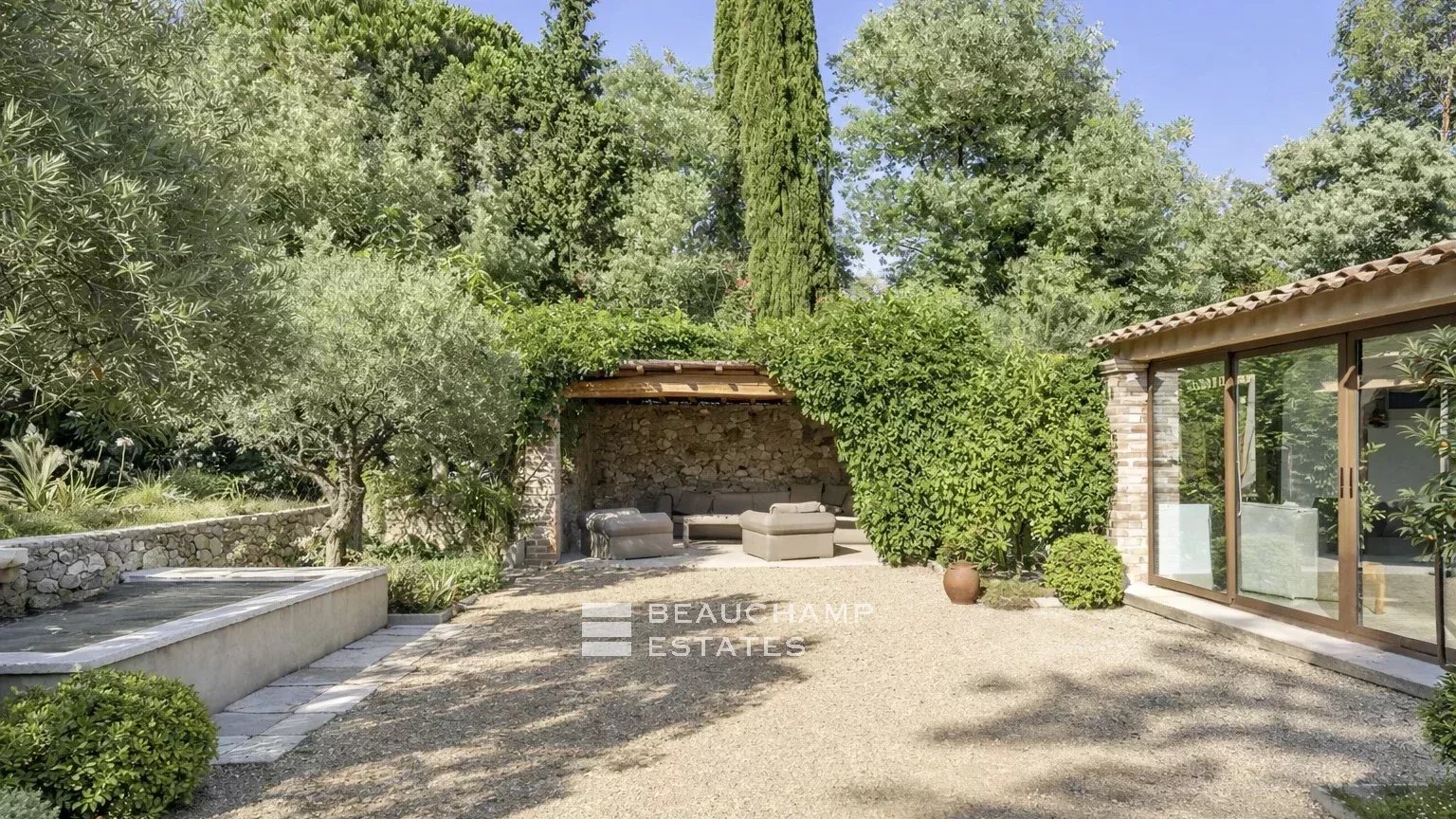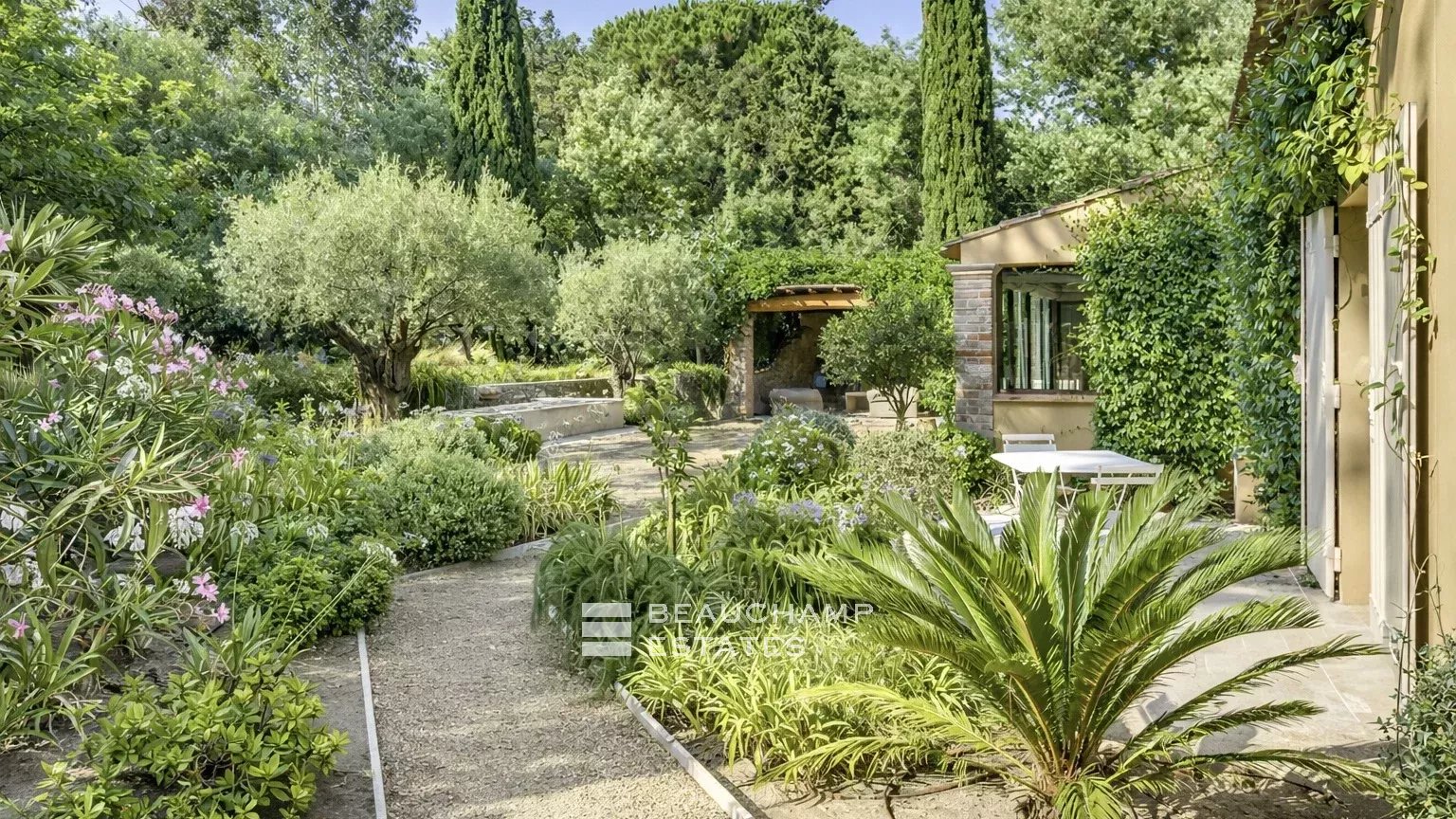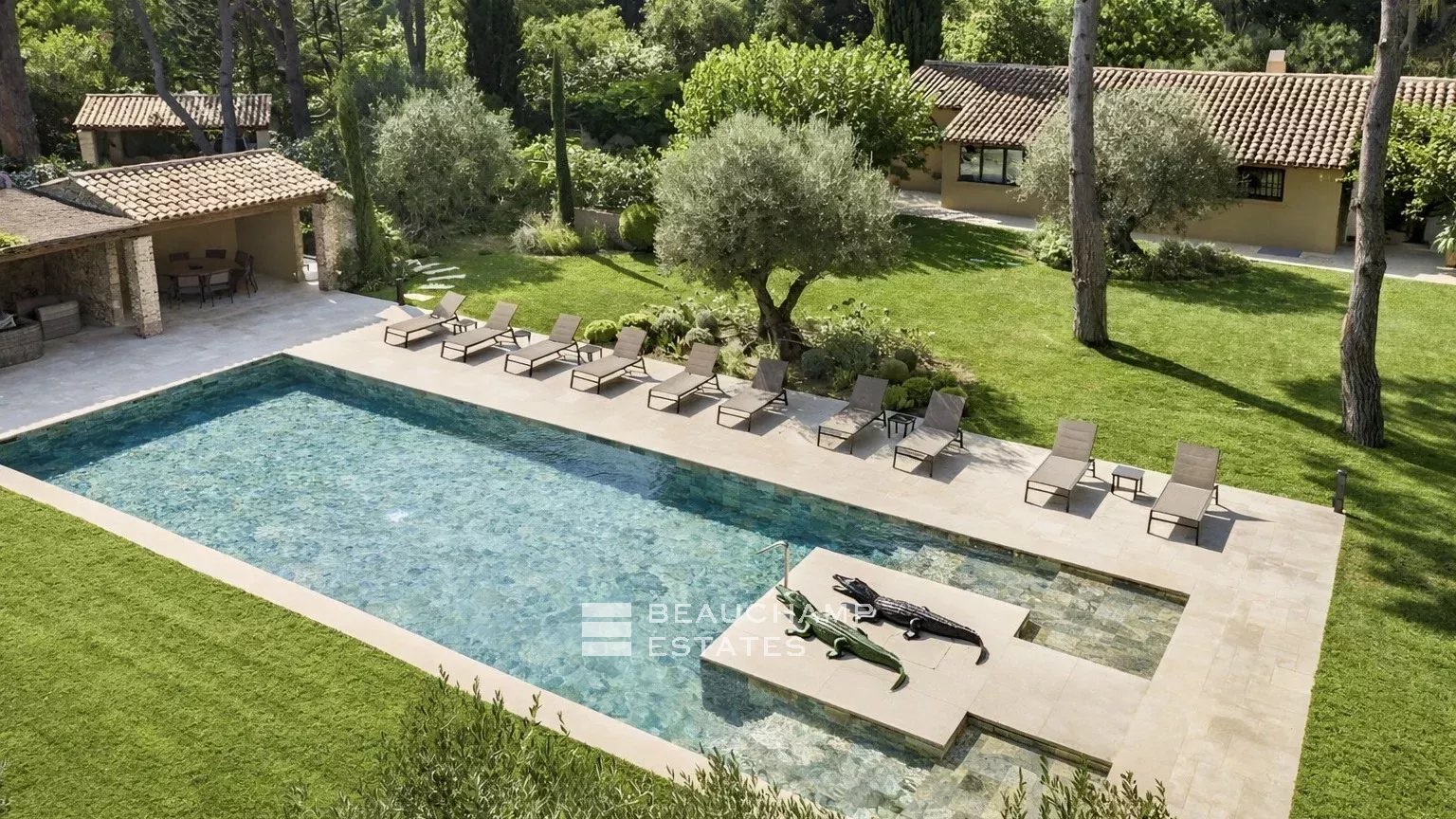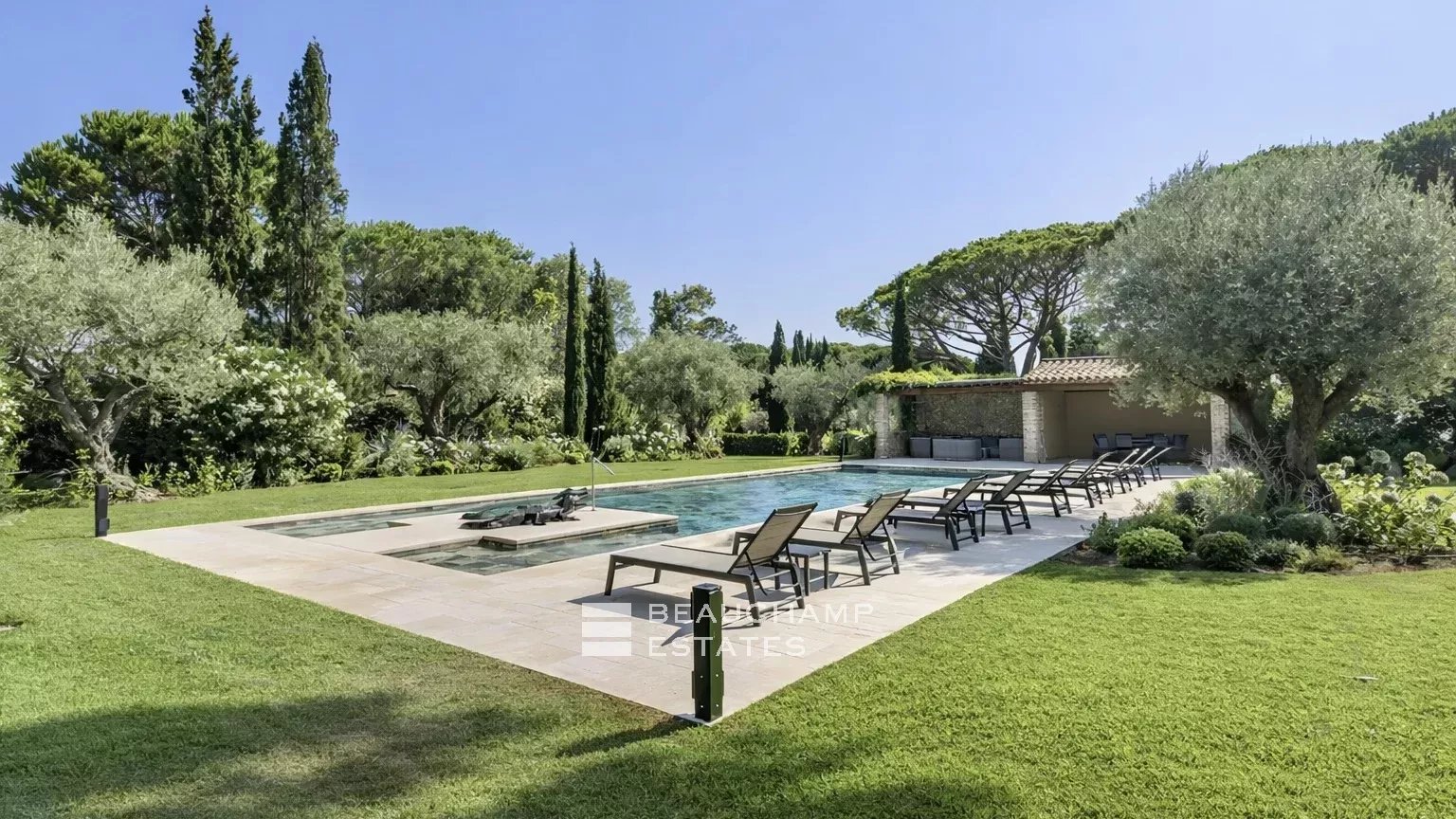 The beautifully landscaped Mediterranean garden surrounds a stunning 5 × 20 m swimming pool equipped with massage jets. A pool house with a shaded pergola extends this relaxation area. A barbecue corner and a dining area beneath a natural pergola invite you to enjoy warm summer evenings.