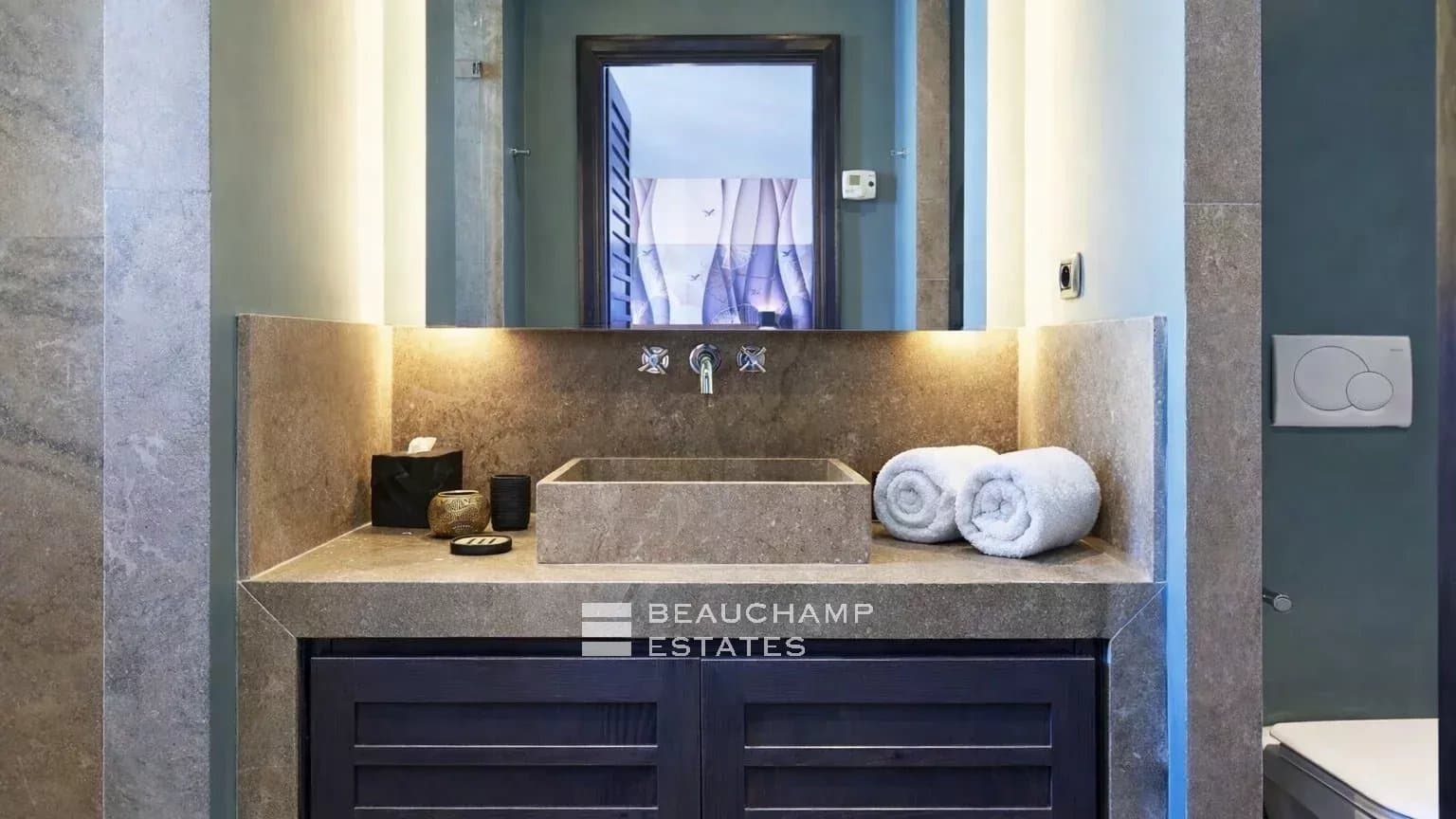 Spacious and finished to the highest standards, the property features seven en-suite bedrooms, each with its own bathroom or shower room and toilet, as well as numerous terraces, one of which is equipped with a jacuzzi. The living areas include a generous double living room with fireplace, a reception area, a dining room, and a fully equipped kitchen.