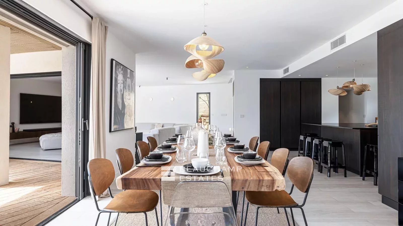 - A spacious, bright living room with open-plan fitted kitchen and access to the main terrace