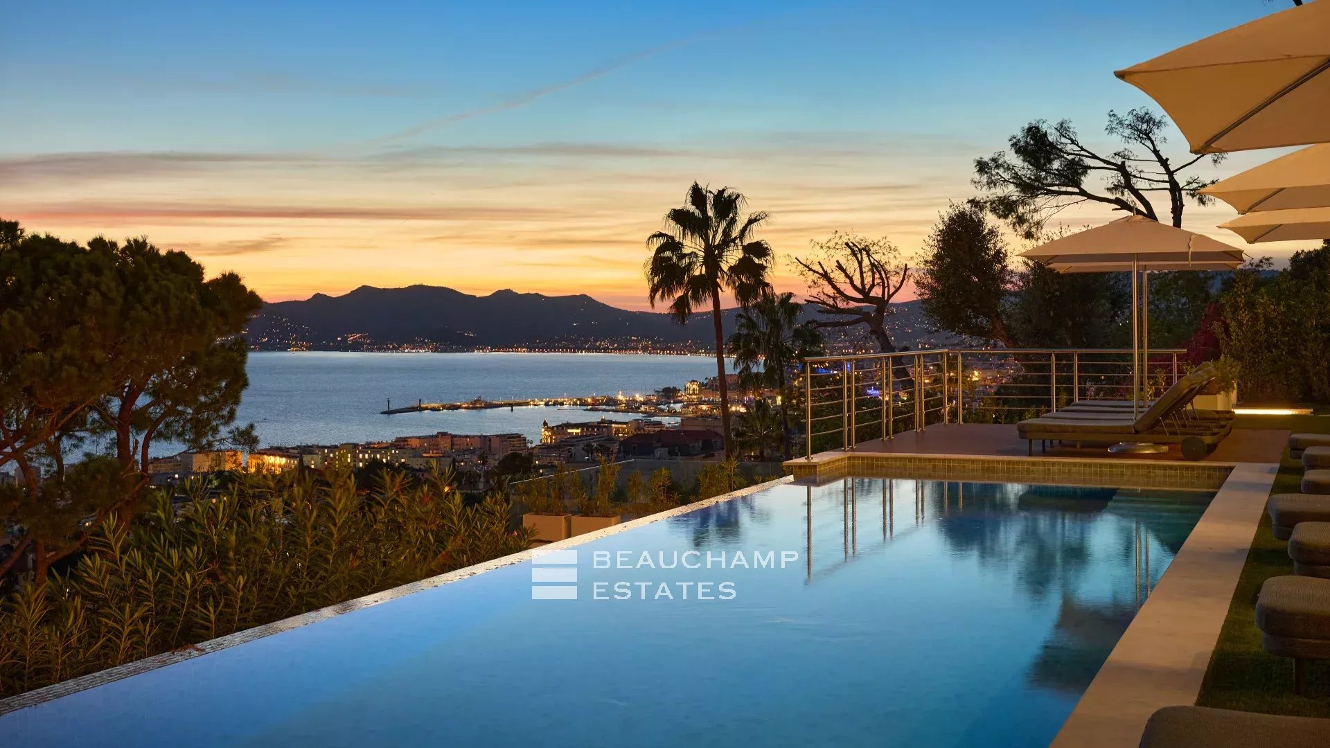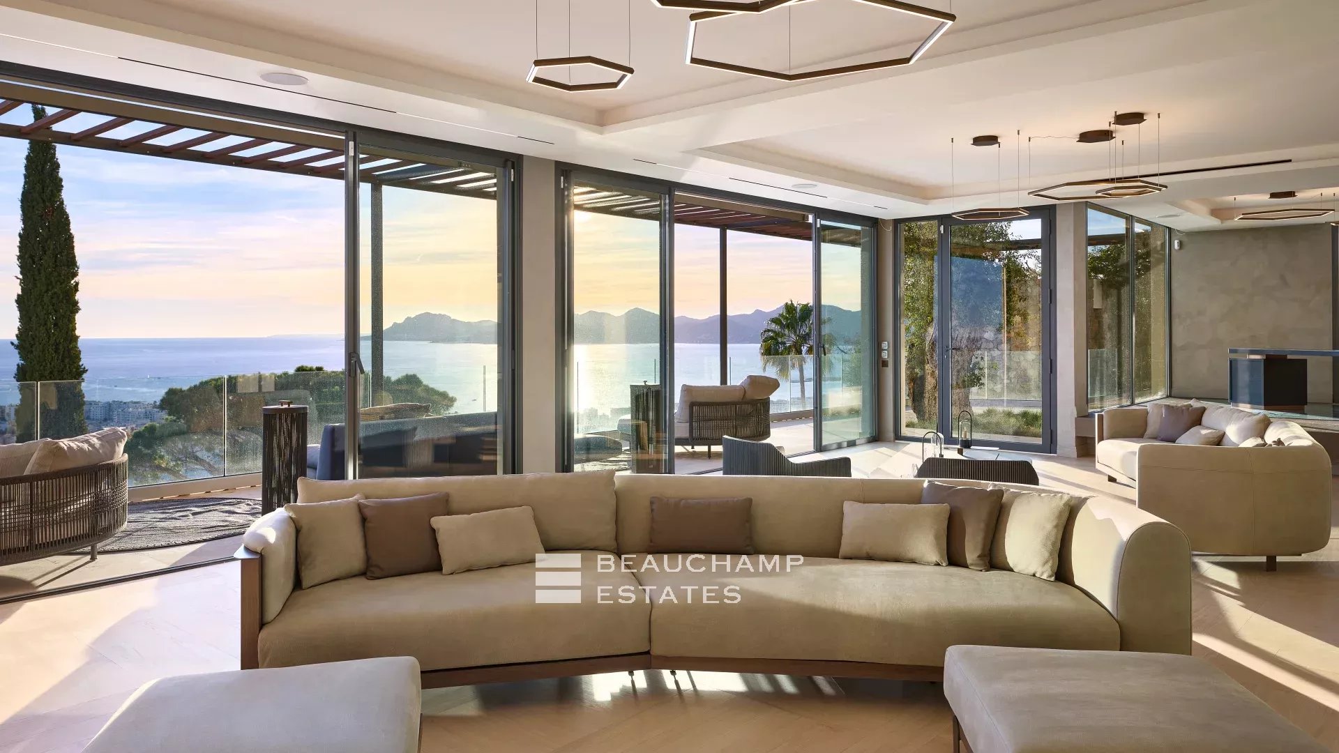 Located on the heights of Cannes, discover this magnificent contemporary villa with meticulous amenities, offering breathtaking views of the Bay of Cannes, the Esterel hills, and overlooking the Lérins Islands.