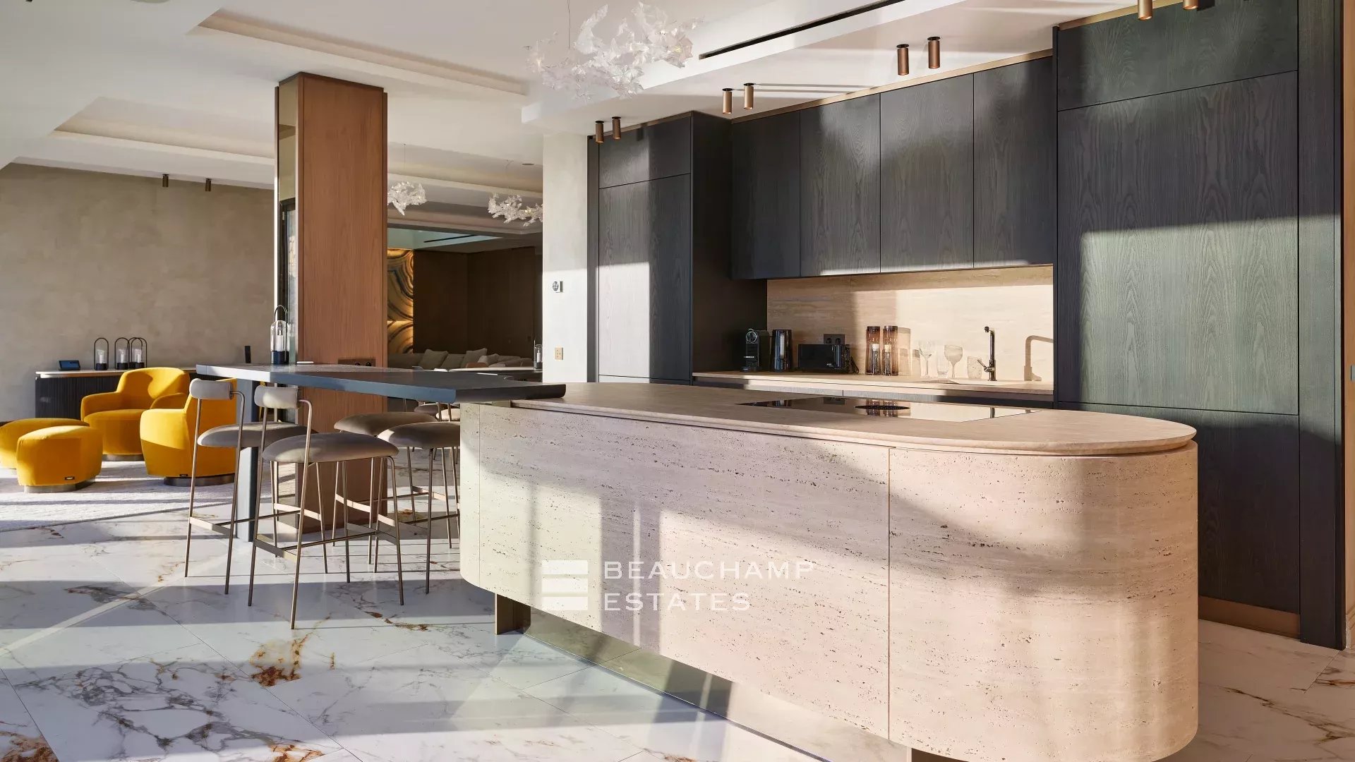 - A spacious living room with an equipped open kitchen