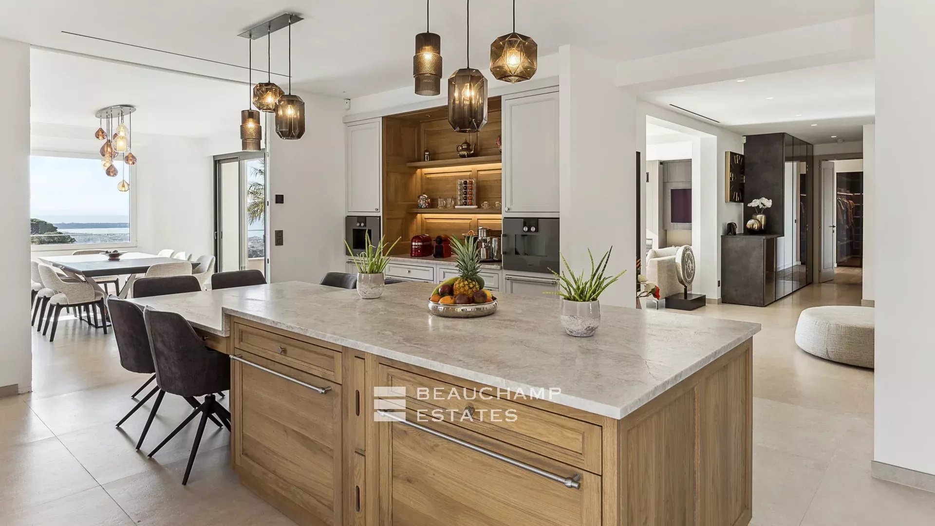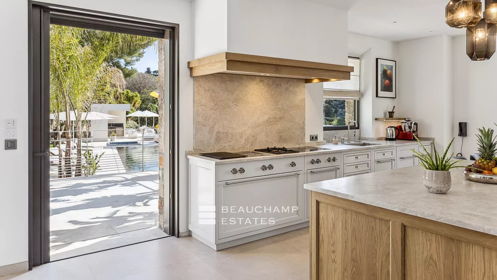 The villa offers a fully equipped kitchen with high-end materials and appliances, opening onto a dining area. The living spaces are bathed in natural light thanks to large bay windows leading to a pleasant terrace.