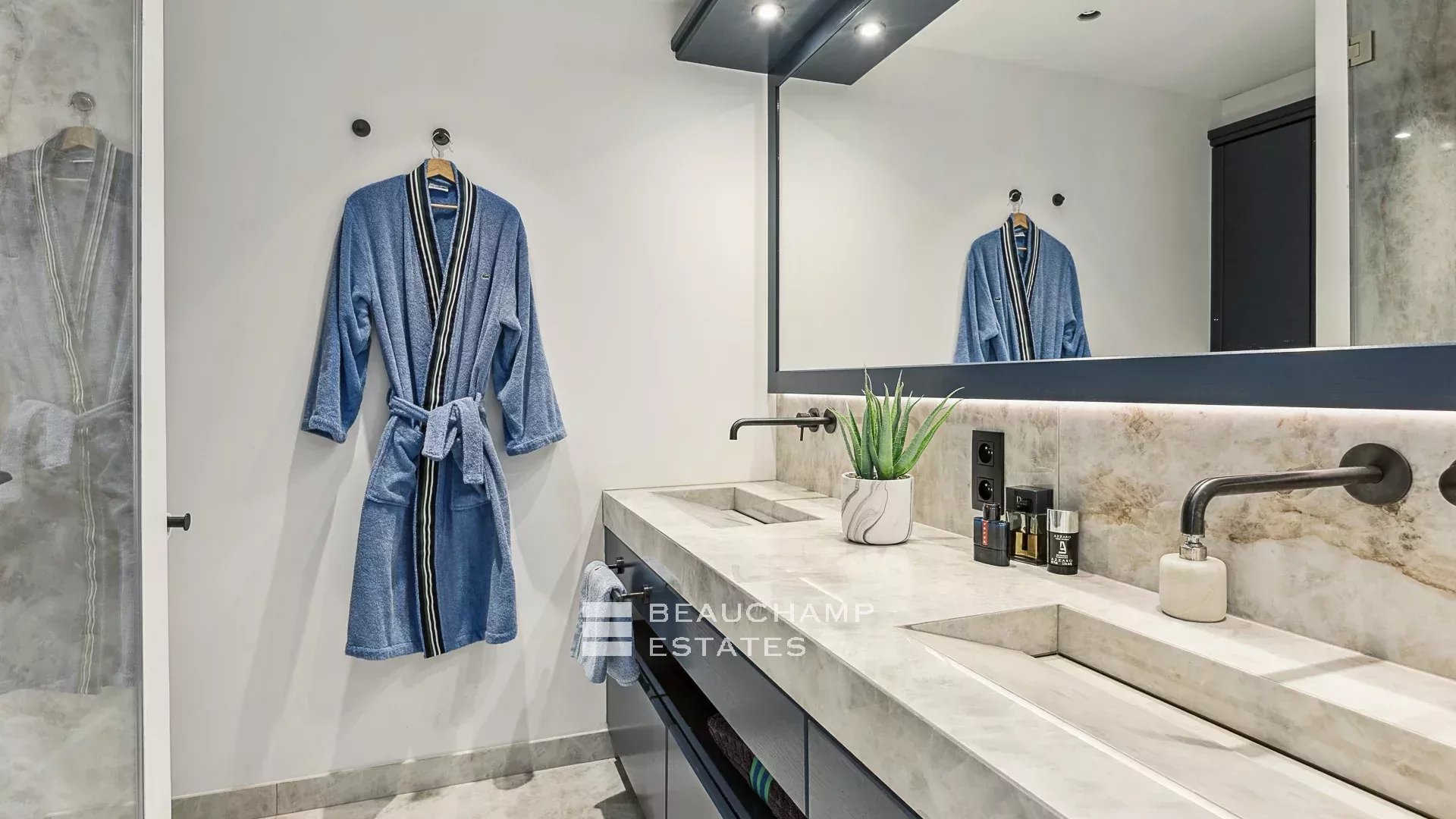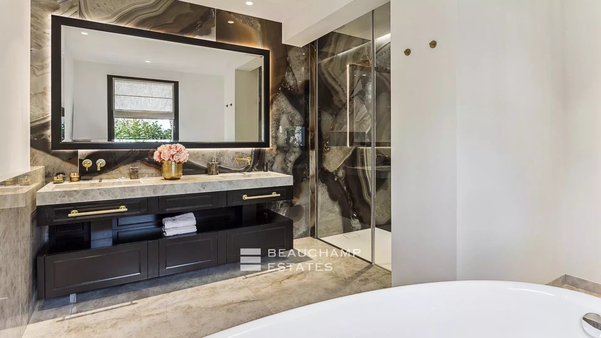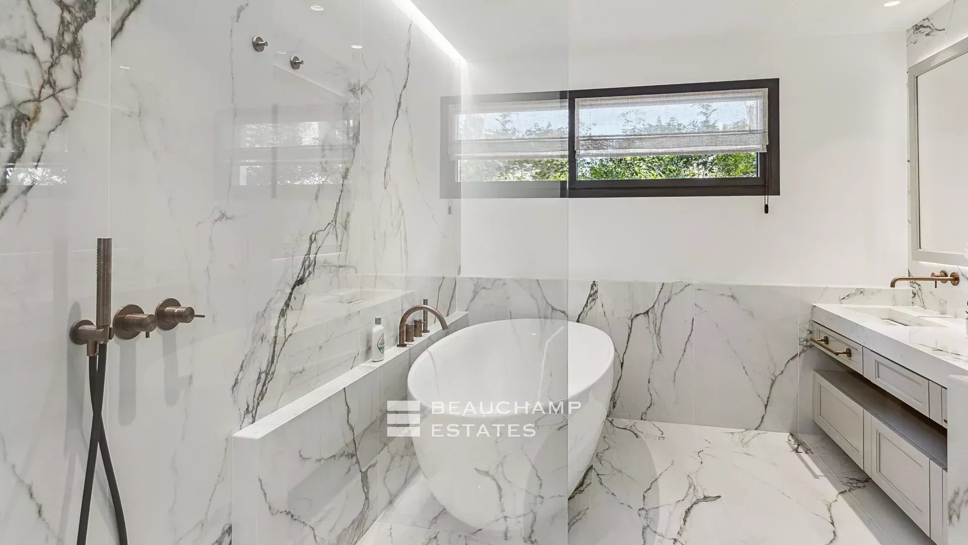 It features five en-suite bedrooms, each with its own bathroom and an elegant office space, perfect for work or reading. The master bedroom stands out with a spacious dressing room and a refined bathroom with a bathtub and an Italian shower.