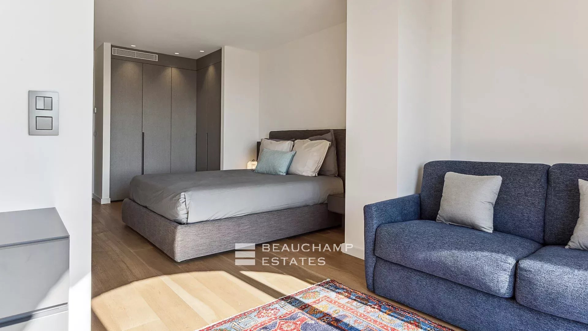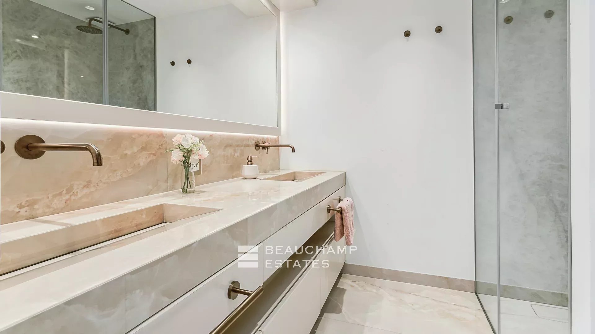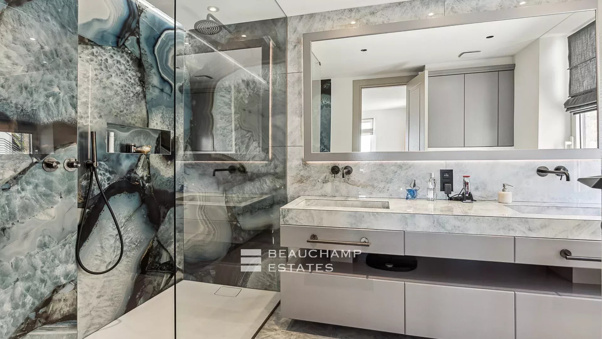 It features five en-suite bedrooms, each with its own bathroom and an elegant office space, perfect for work or reading. The master bedroom stands out with a spacious dressing room and a refined bathroom with a bathtub and an Italian shower.