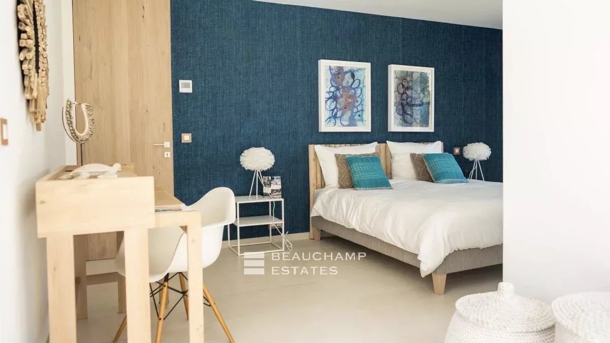 Villa was built in 2021 in a seaside and natural style; The decoration in shades of white, blue and turquoise and the natural wood and driftwood finishes are a real ode to nature and the sea. The villa is located in the heart of the bay of Pampelonne a few steps from the beach and offers a nice sea view.