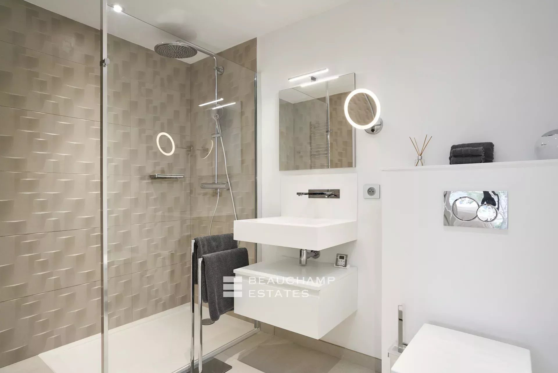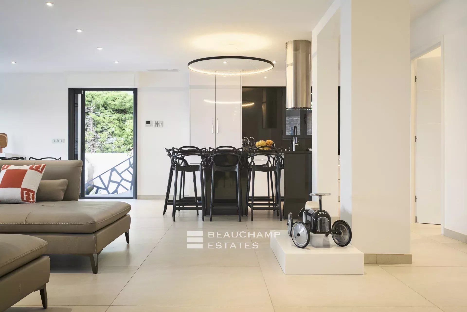 In the very quiet and residential area of Croix des Gardes, close to the beaches and all amenities, this newly renovated property enjoys a superb panoramic sea view. The 315 m2 villa consists of:
