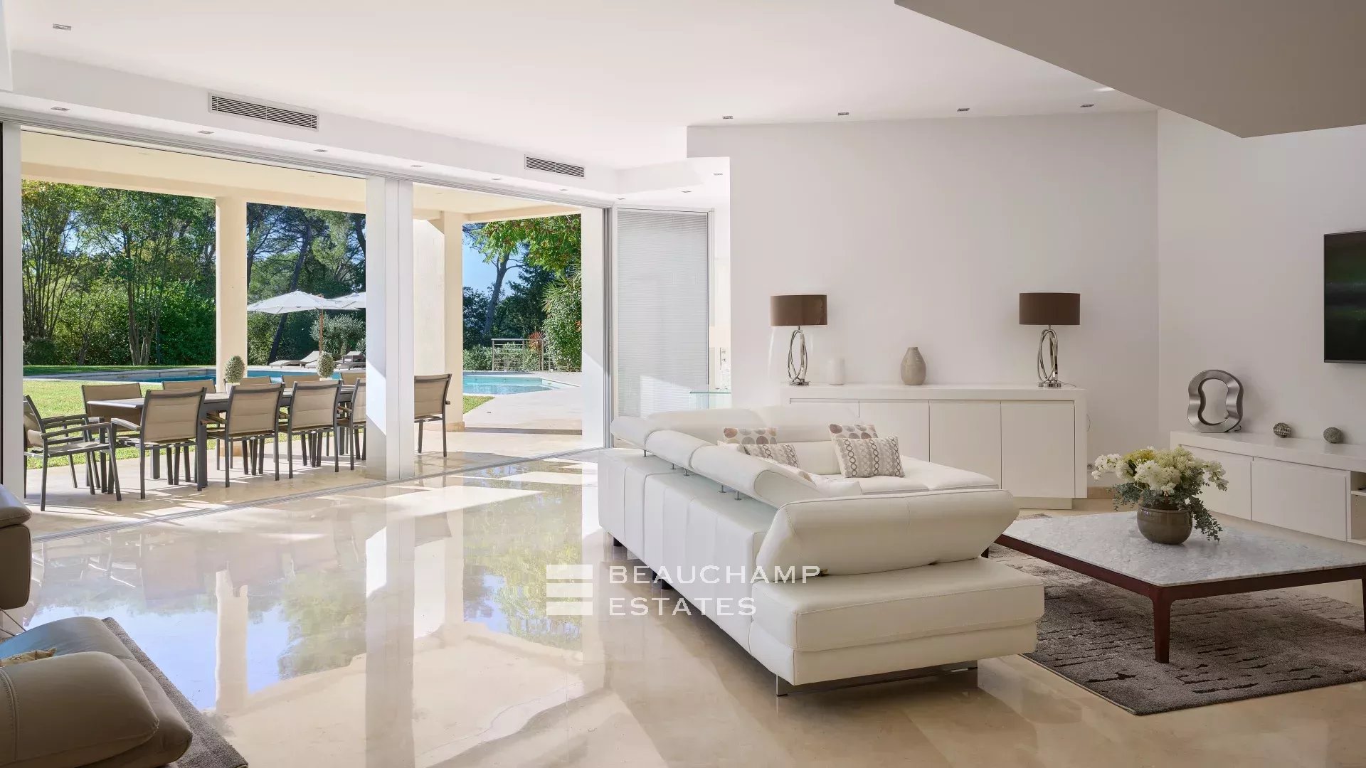 - Spacious living room opening onto a terrace facing the pool, dining room, wine and cigar cellar.