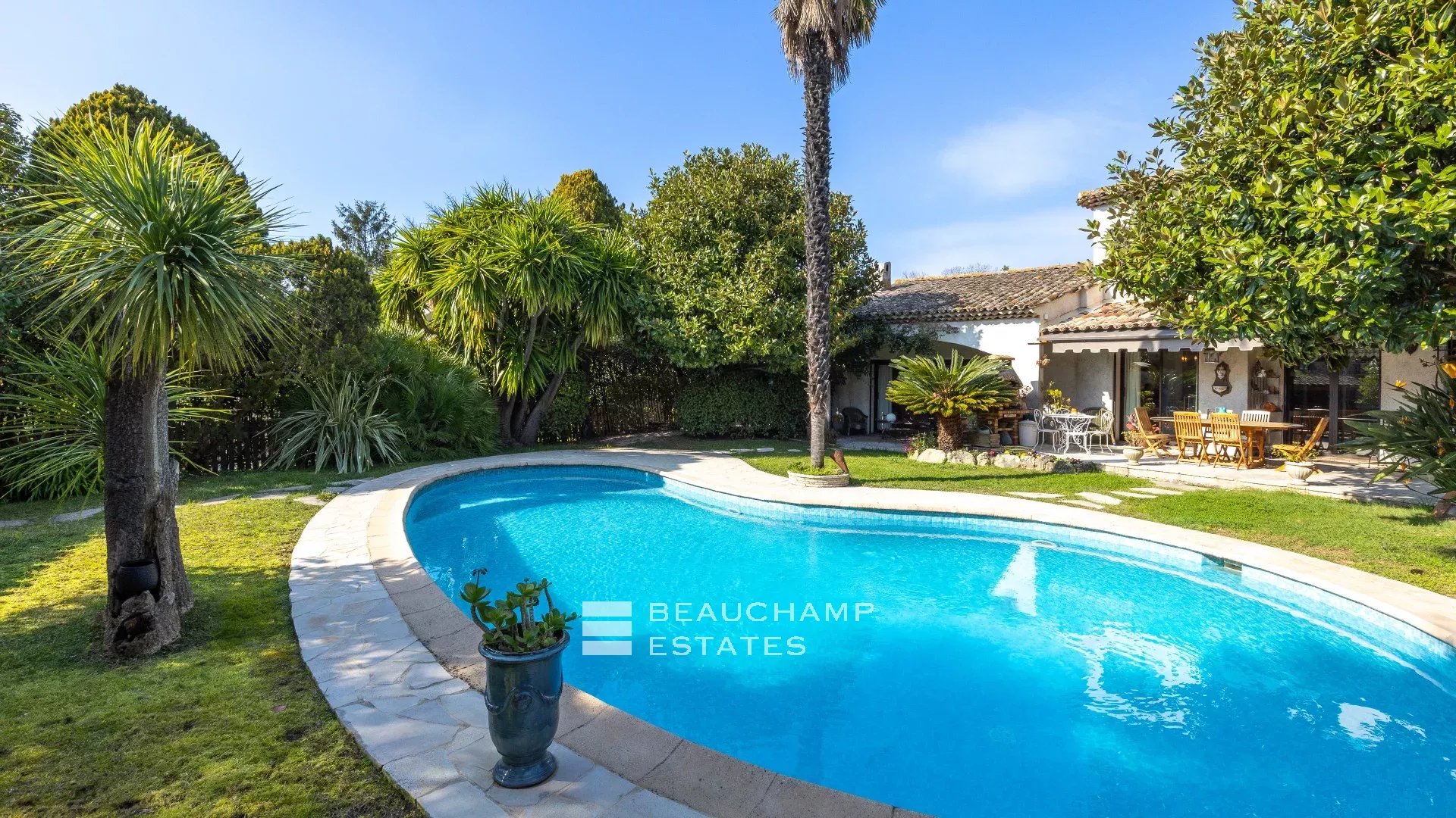 Located in the residential area of Les Cabrières in Mougins, close to amenities, this charming Provençal villa of approximately 245 m² sits on a beautifully wooded flat plot of 1,300 m² with a swimming pool, furnished pool house, and splendid shaded pétanque court.