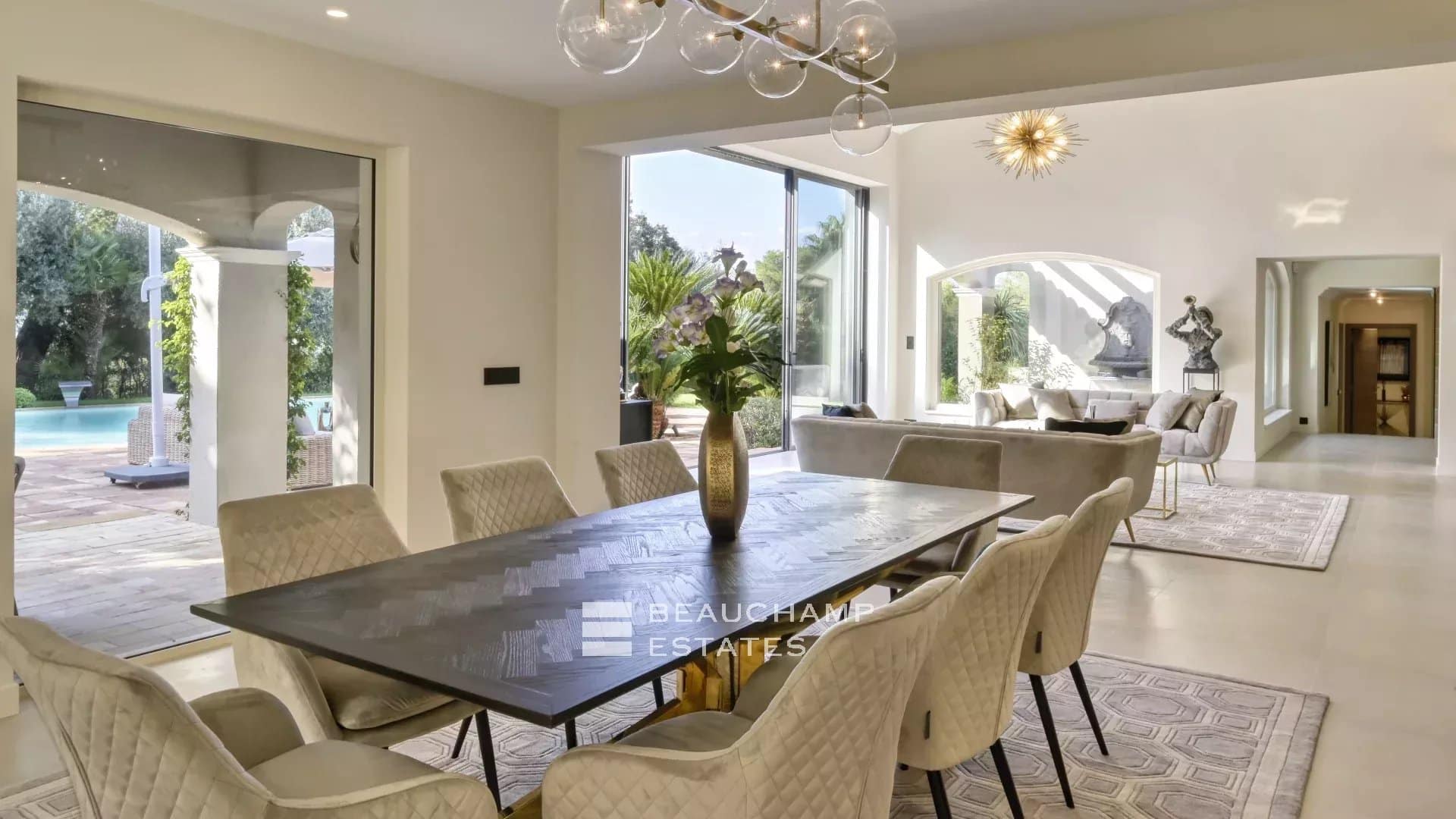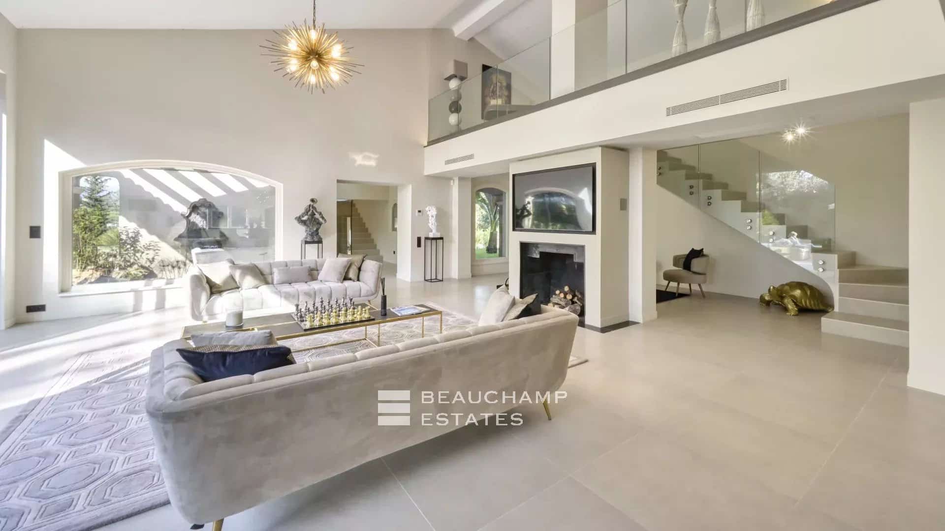 This villa, located in a green setting with views of the old village of Mougins, has been completely renovated. With a surface area of approximately 430 sqm, it comprises an entrance hall, a superb cathedral-ceilinged living room with fireplace and library area, a dining room and a large kitchen with utility room.