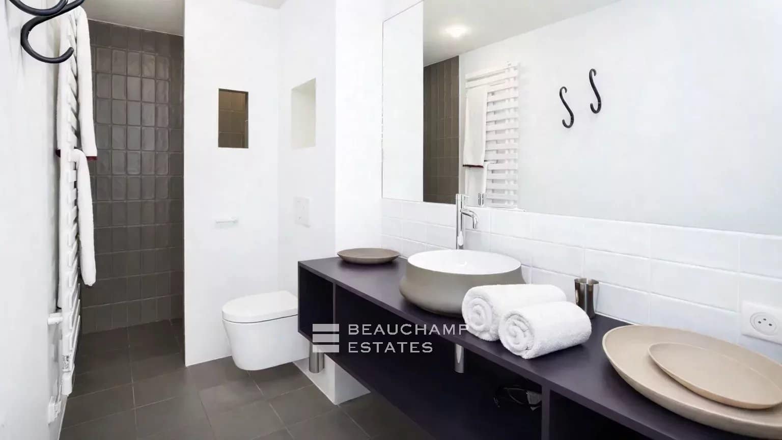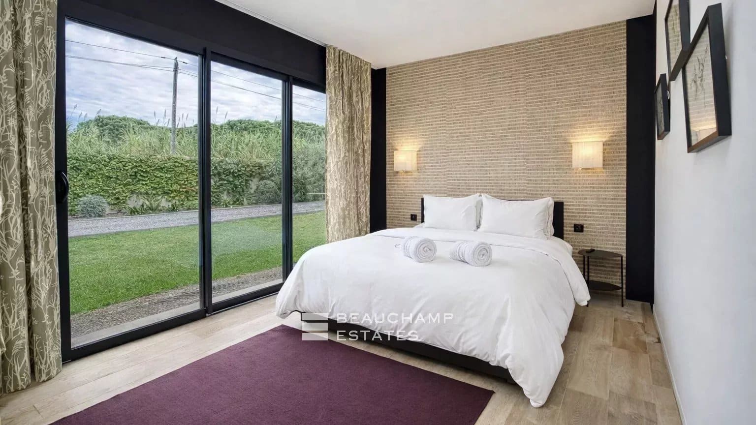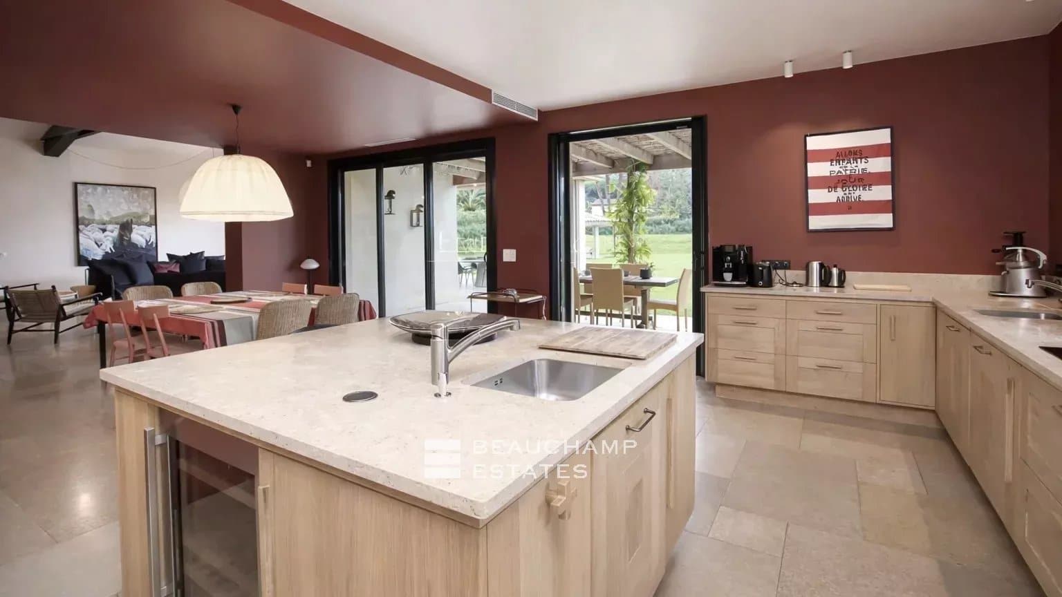 Outside, the villa boasts a stunning 13-meter mirror swimming pool, accompanied by a pool house and a summer kitchen fitted with a Weber barbecue and sink. Additional amenities include a wine cellar and an ice maker.