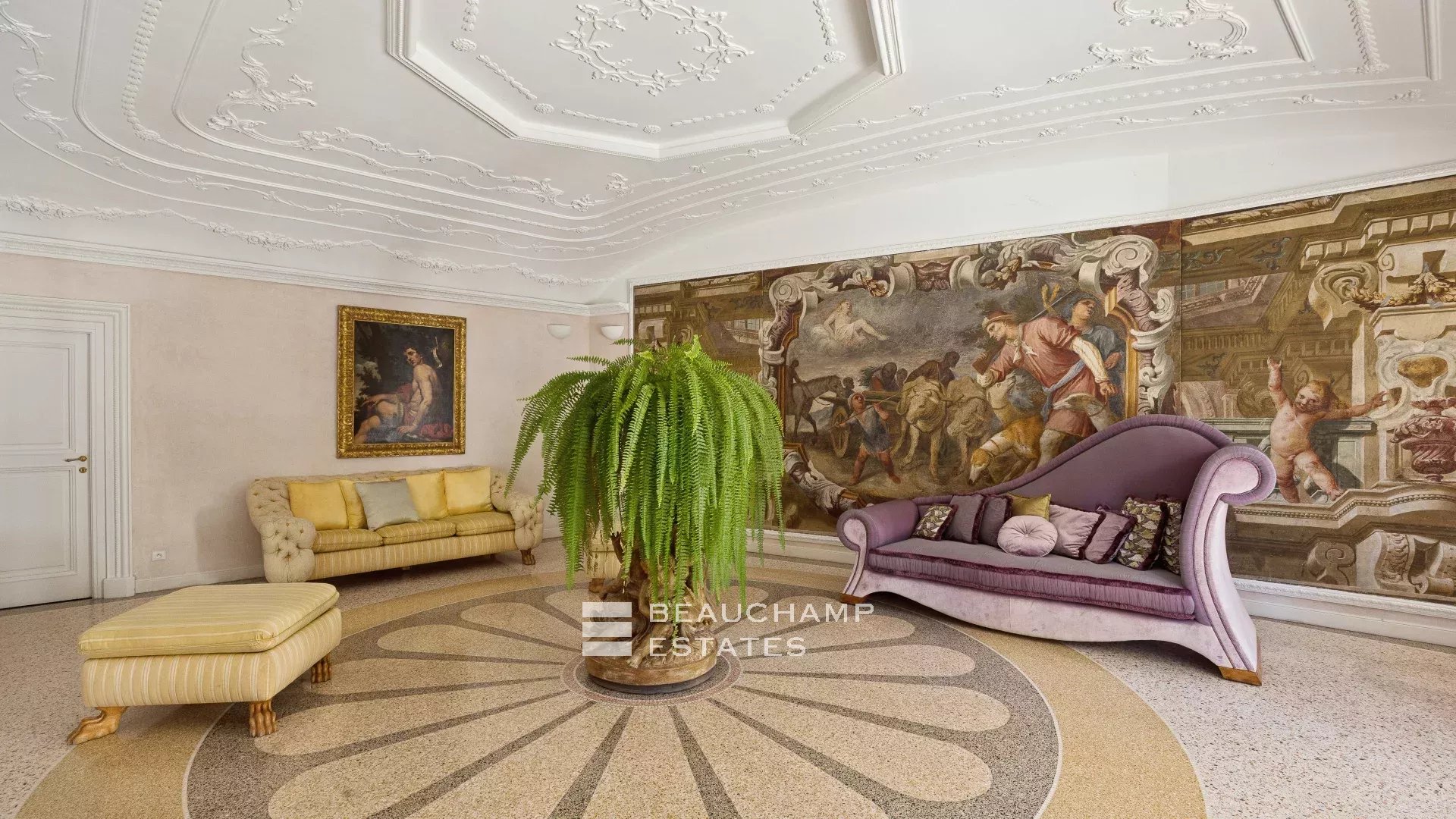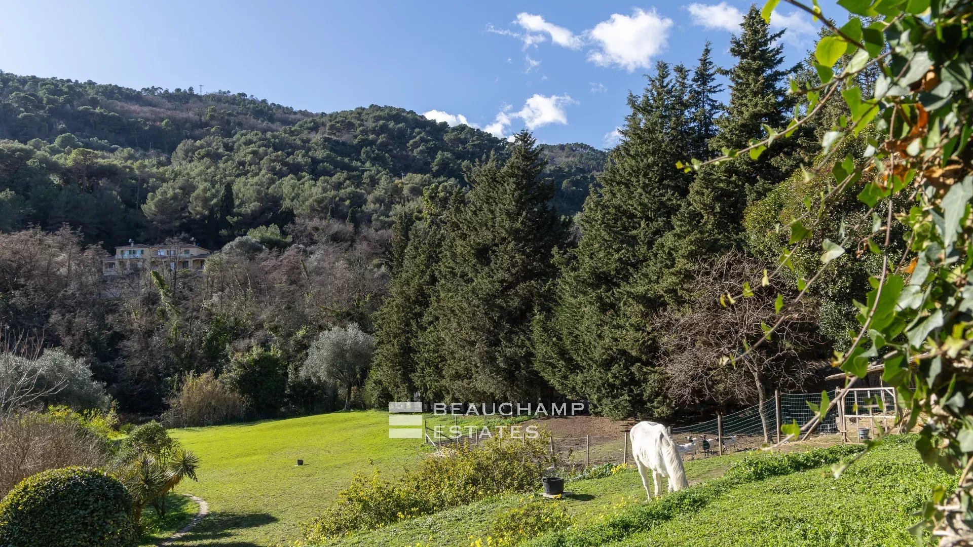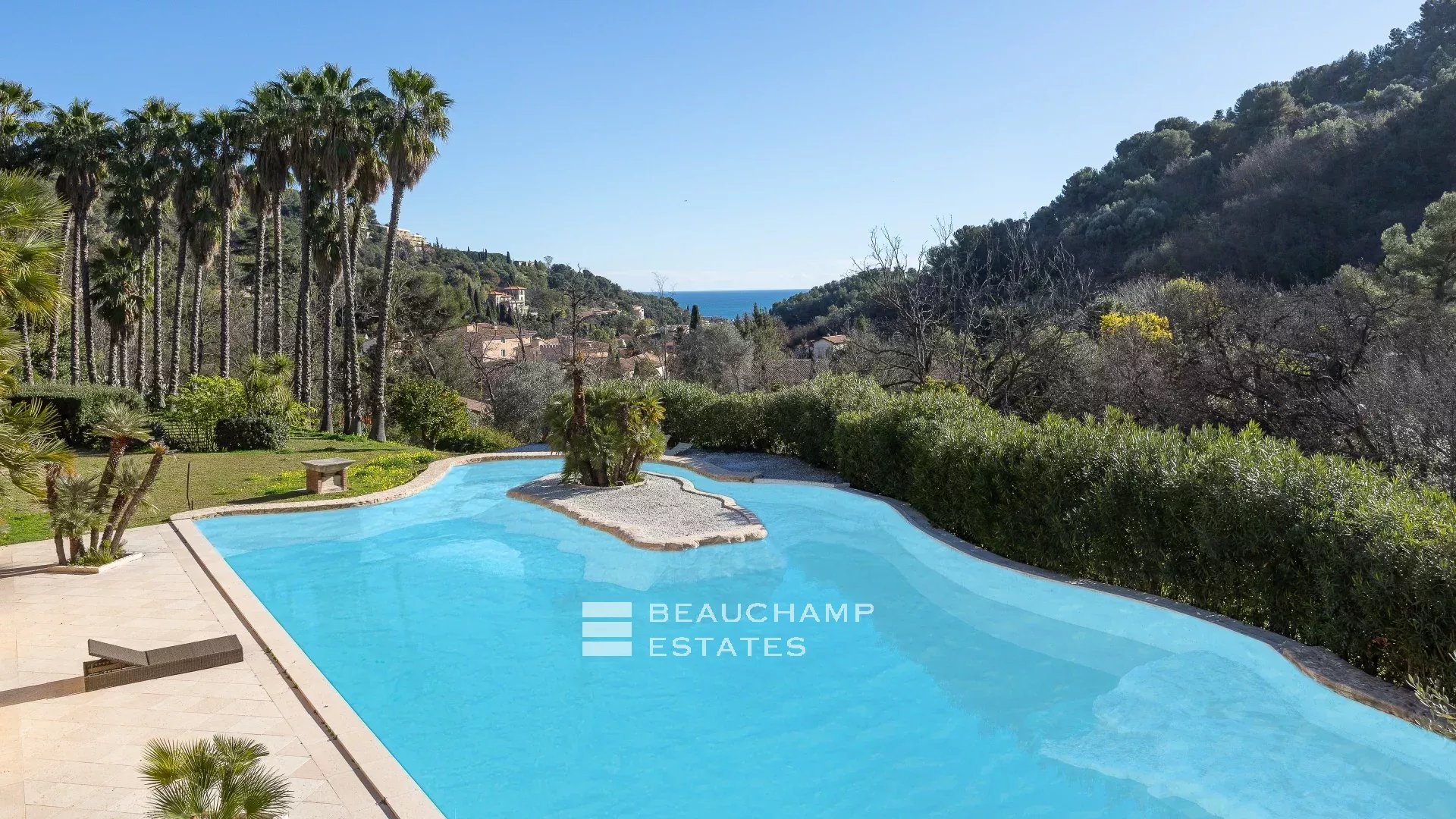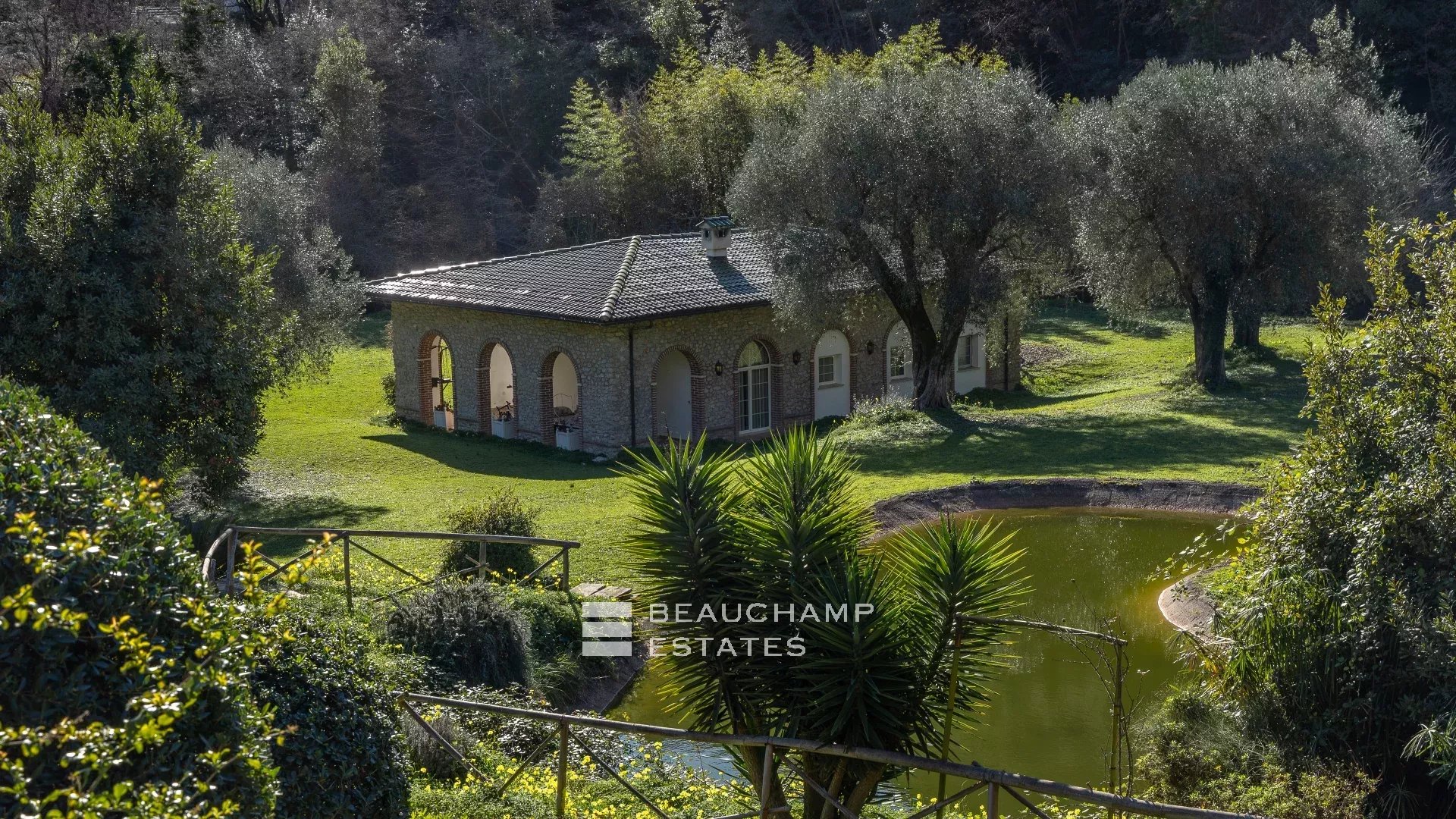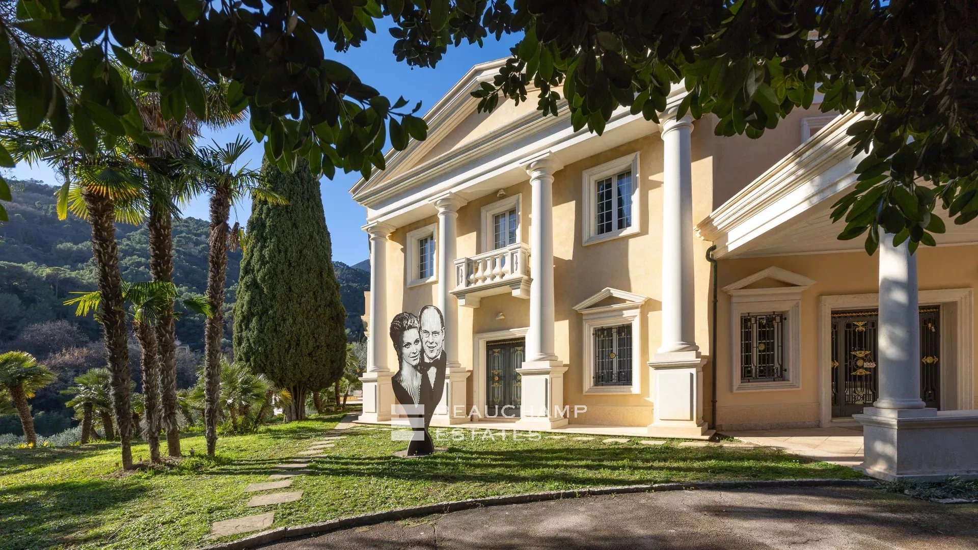 Just twenty minutes from the Principality of Monaco, this unique Palladian-style estate is set within 1.9 hectares of landscaped grounds, offering a glimpse of the sea and an exceptional natural environment. The property features a large 35×10 m swimming pool with an island, as well as a stream fed by a natural spring.