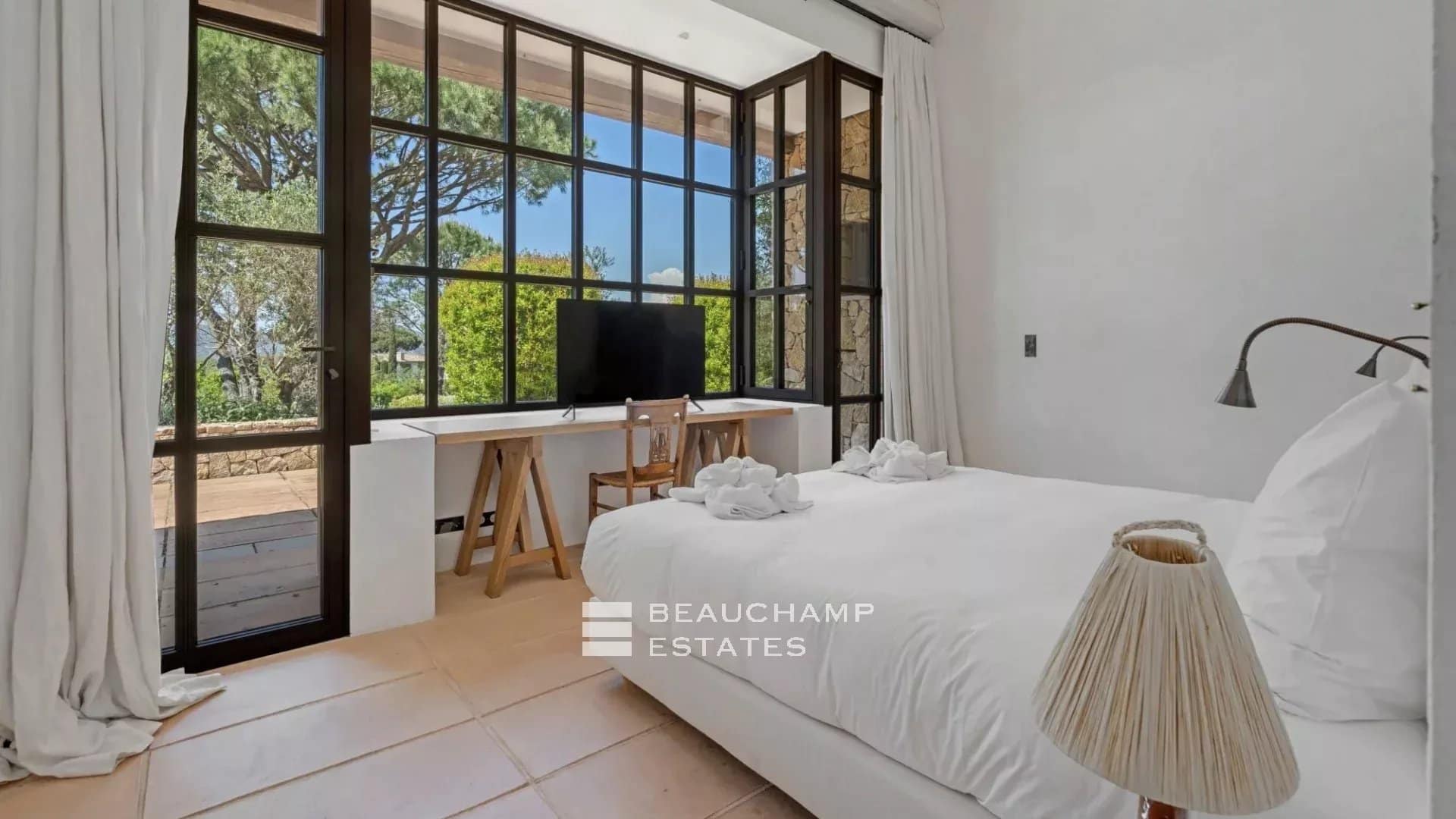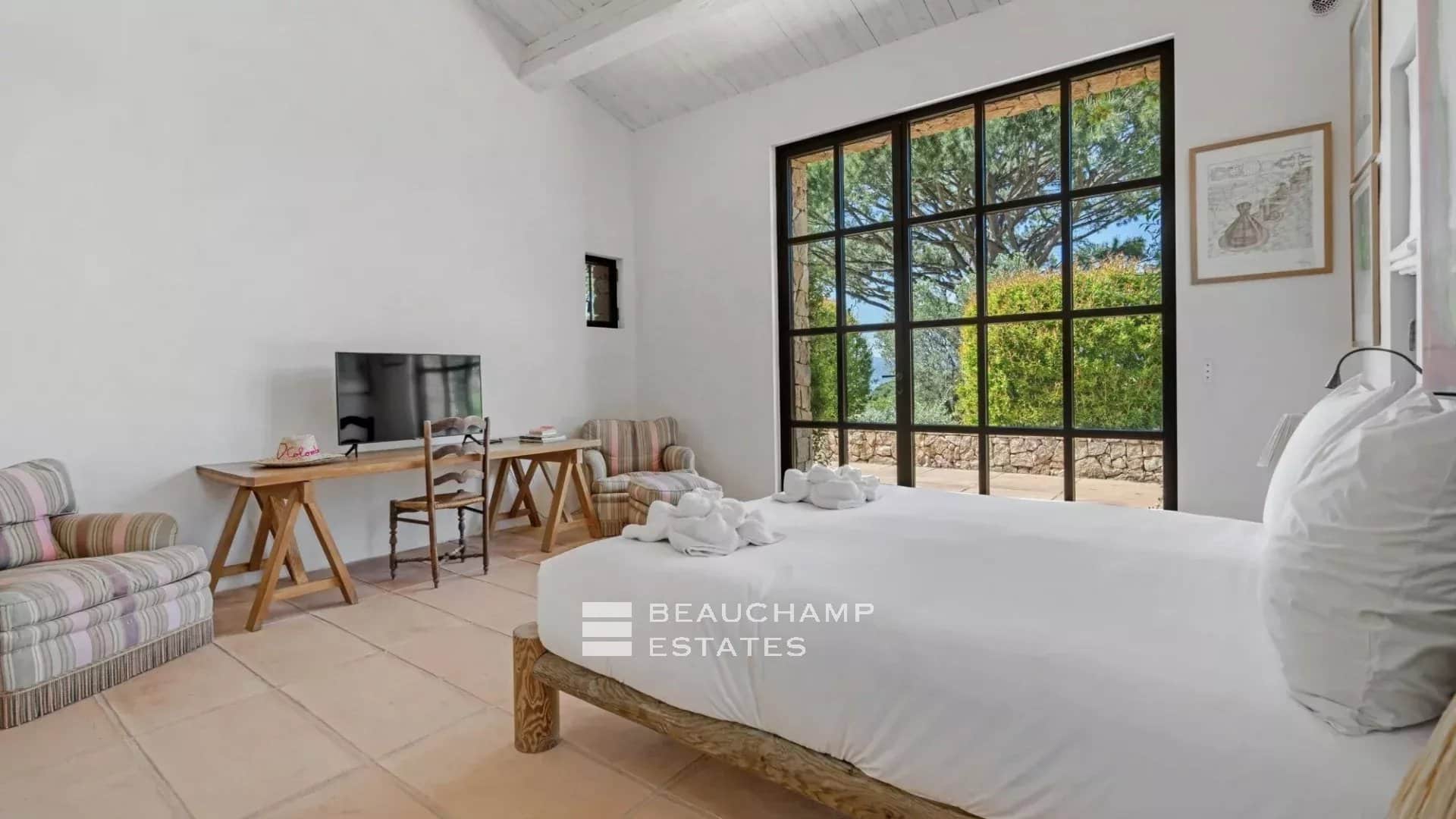 - Bedroom n°3: Double bed, shower room, WC, TV, dressing room, sea view and private terrace.