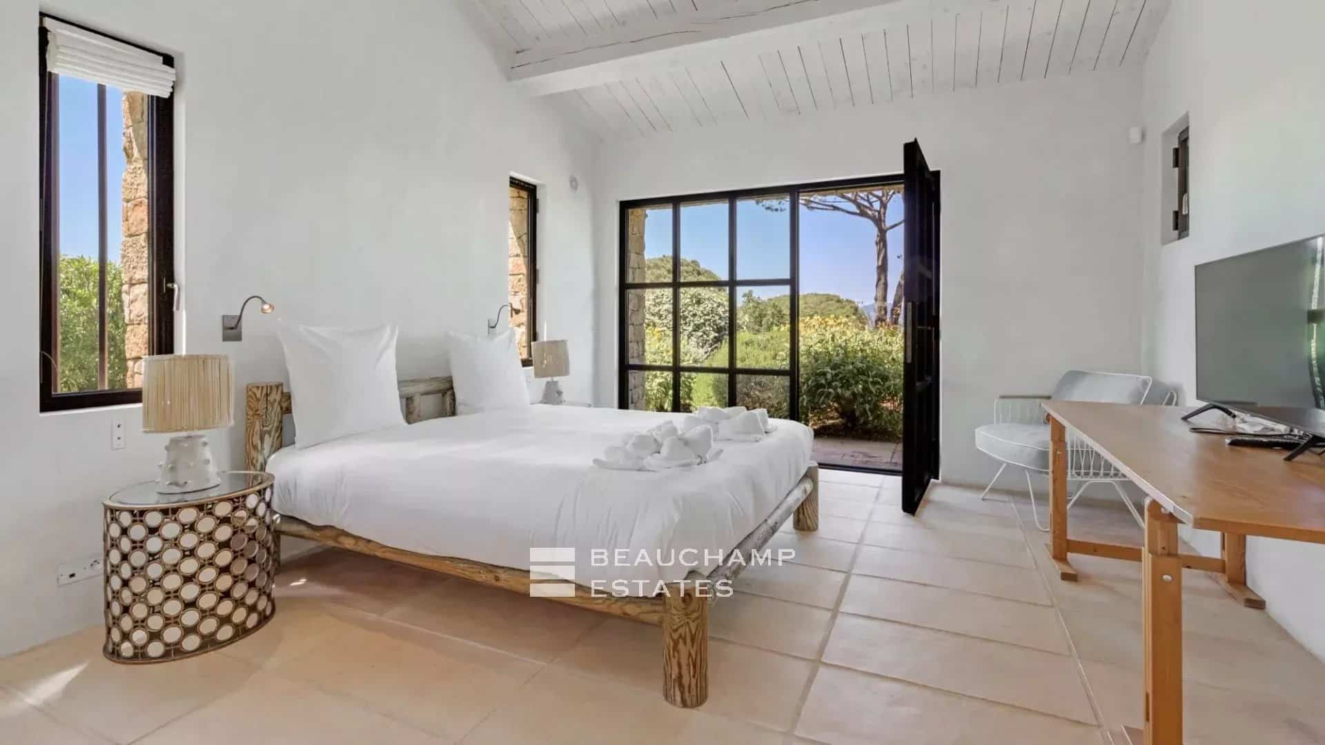 - Bedroom n°5: Double bed with TV, shower room, WC, sea view, dressing room and private terrace.