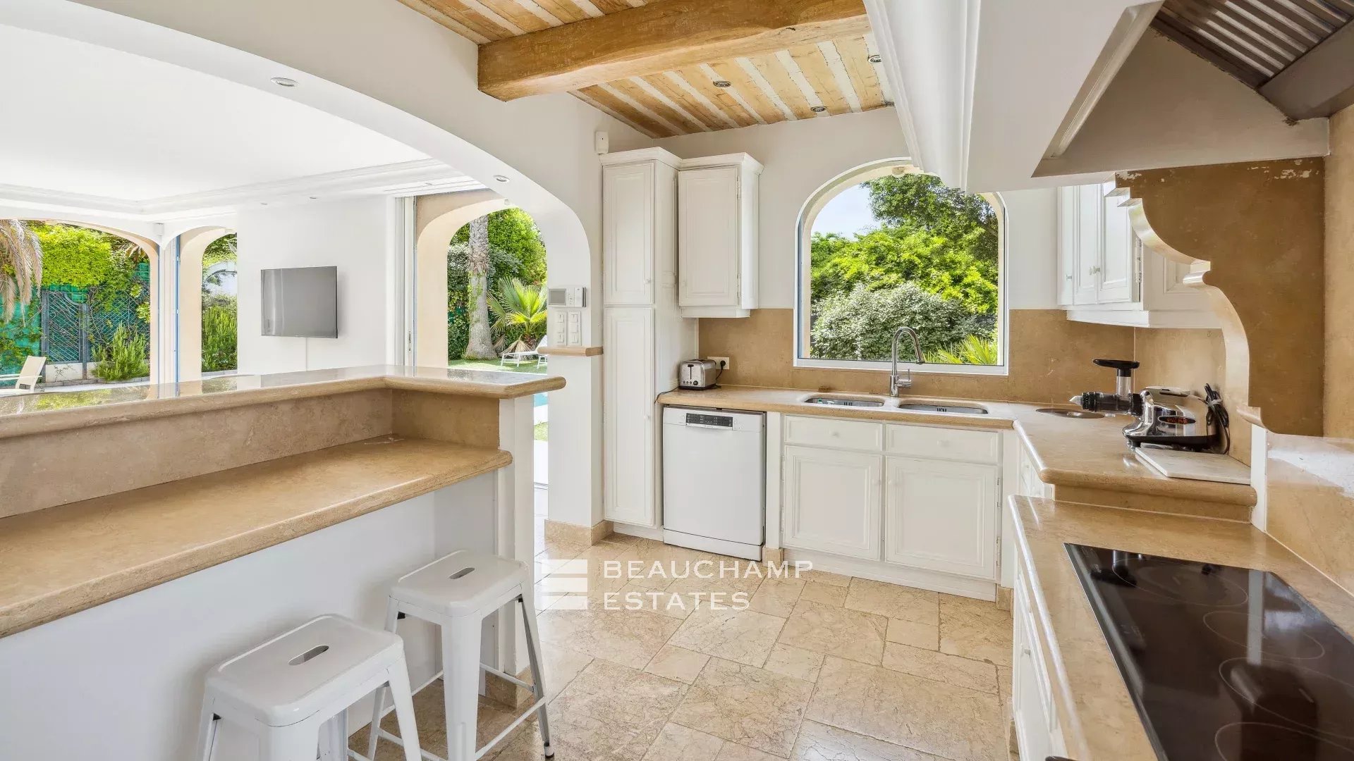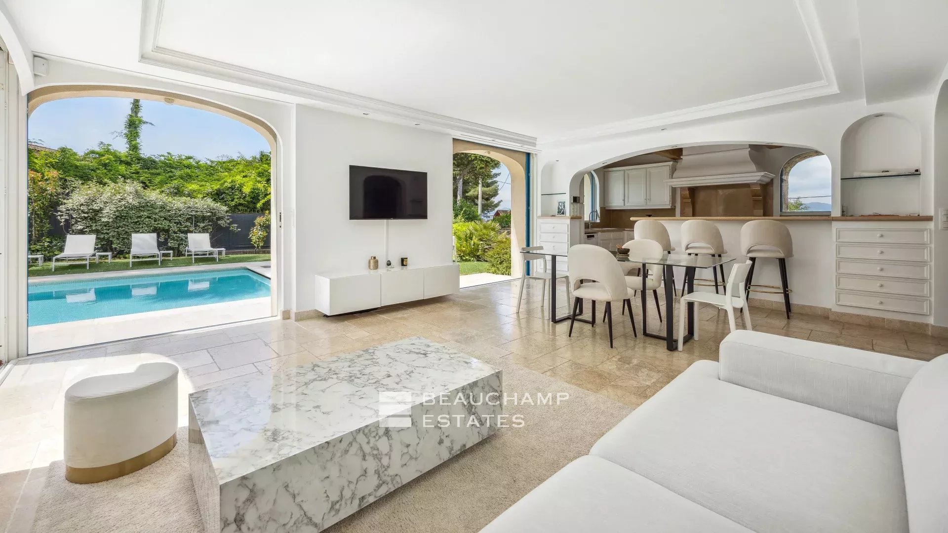 The ground floor comprises a beautiful and spacious entrance hall, a large living/dining room extending into a fitted kitchen, all opening directly onto the garden and swimming pool. The master bedroom, which spans the entire width of the house, has an en-suite bathroom and a dressing room. A stone staircase leads to the first floor with its two bedrooms and bathroom.
