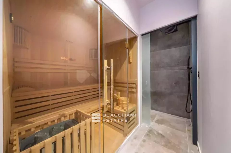 The ground floor, below the main level, includes an indoor swimming pool opening through large bay windows onto a terrace, a sauna and a shower room. Possibility of fitting out a sports area at this level.