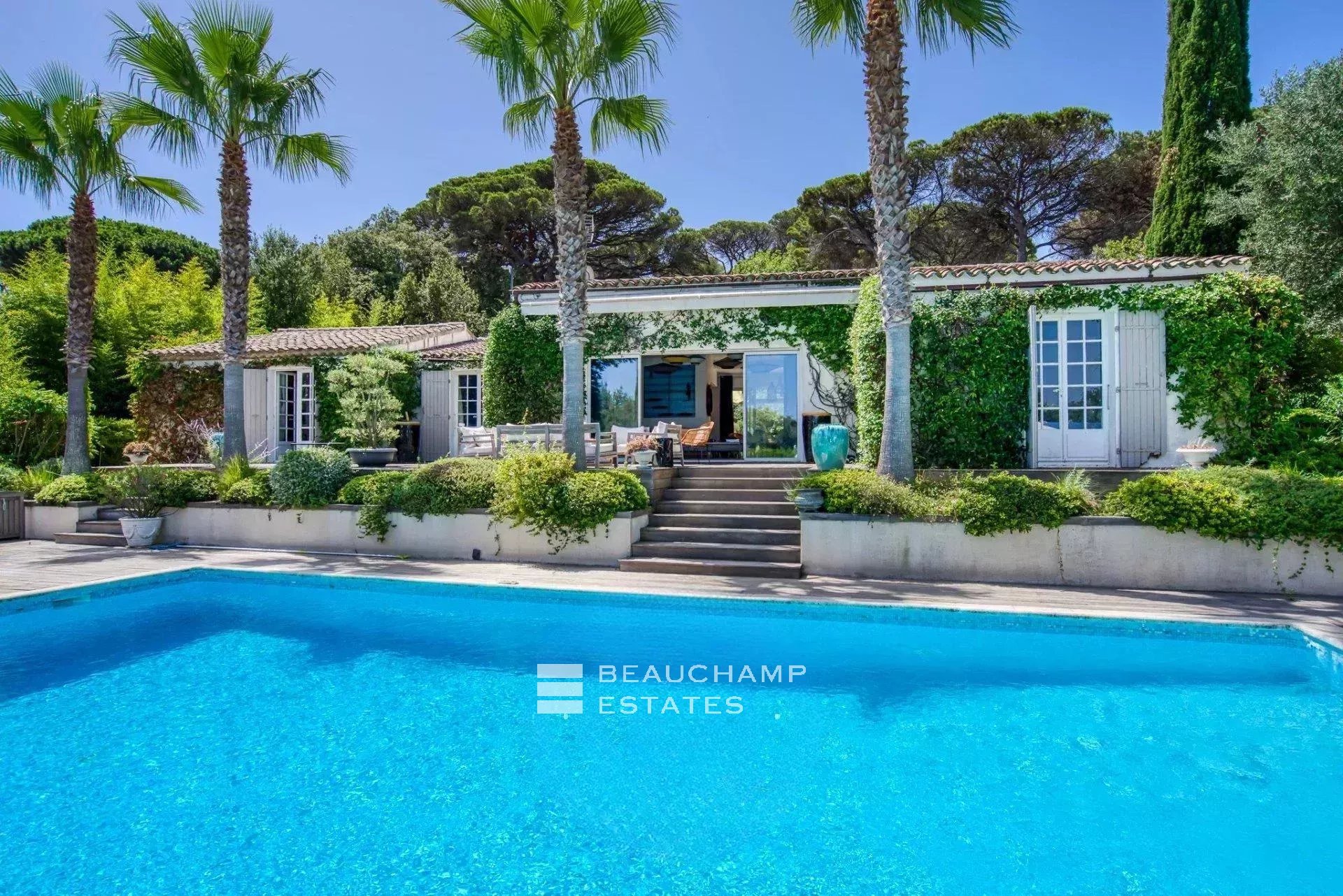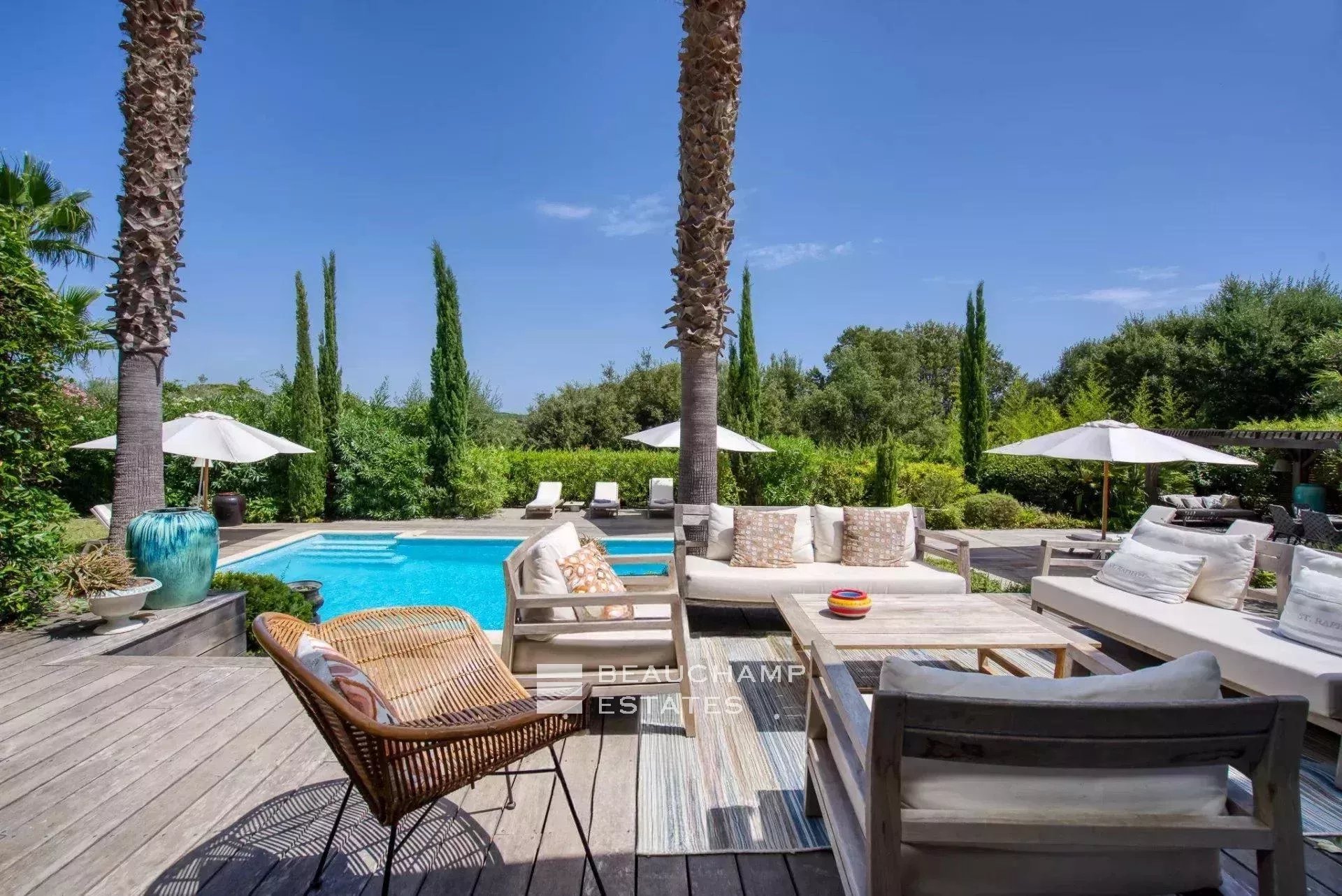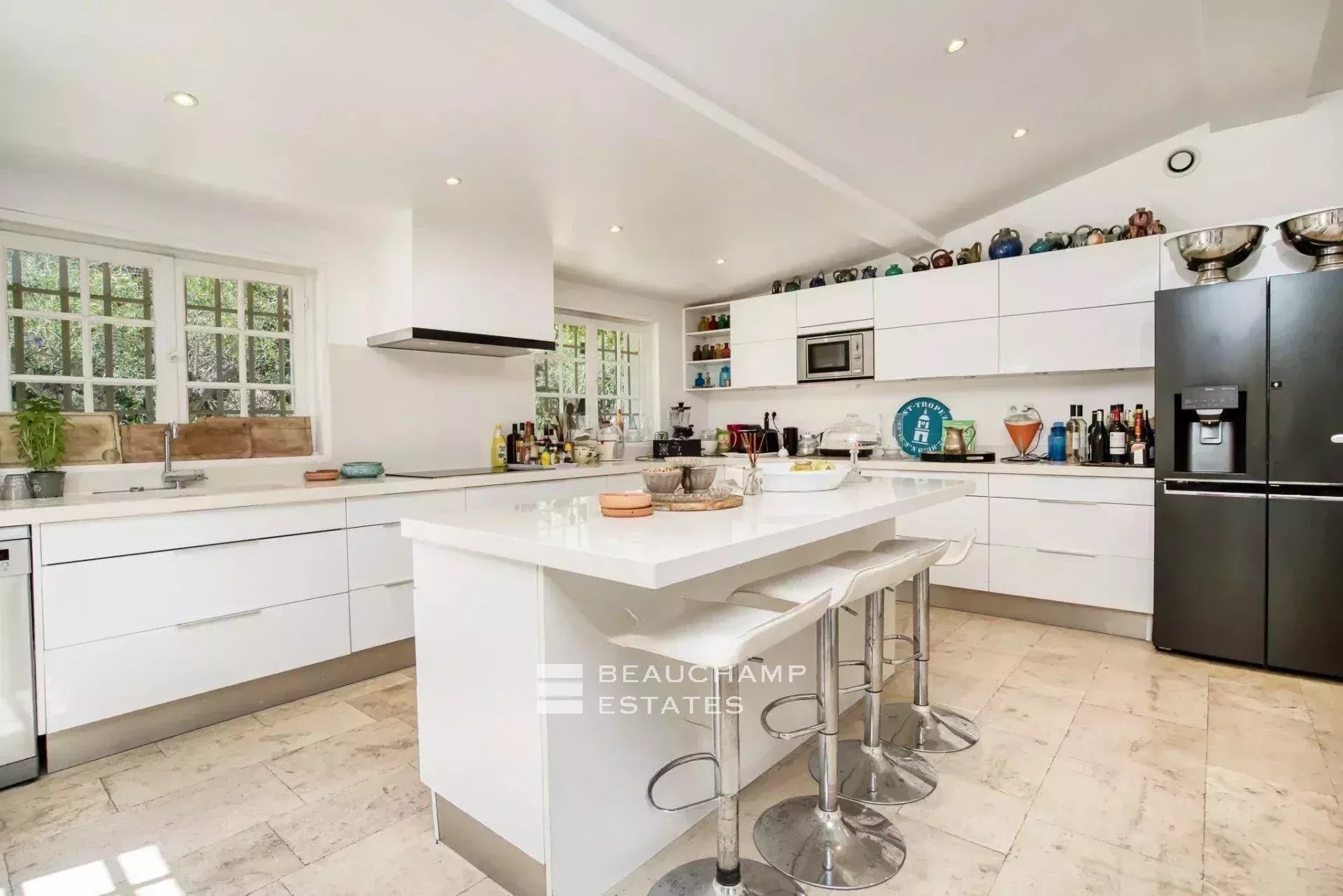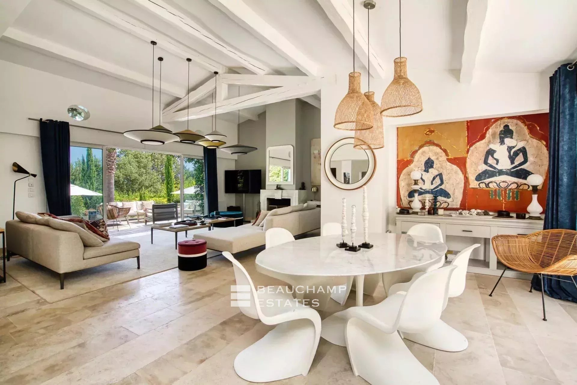 In a peaceful environment with an unobstructed view of the Borelli castle in the Parcs, access to this single-level villa of approximately 250 m² is through the vineyards. It consists of an entrance, a spacious open living area including a lounge with a fireplace and high ceilings adorned with beams, a dining room, and an equipped kitchen. The sleeping area boasts 7 bedrooms.