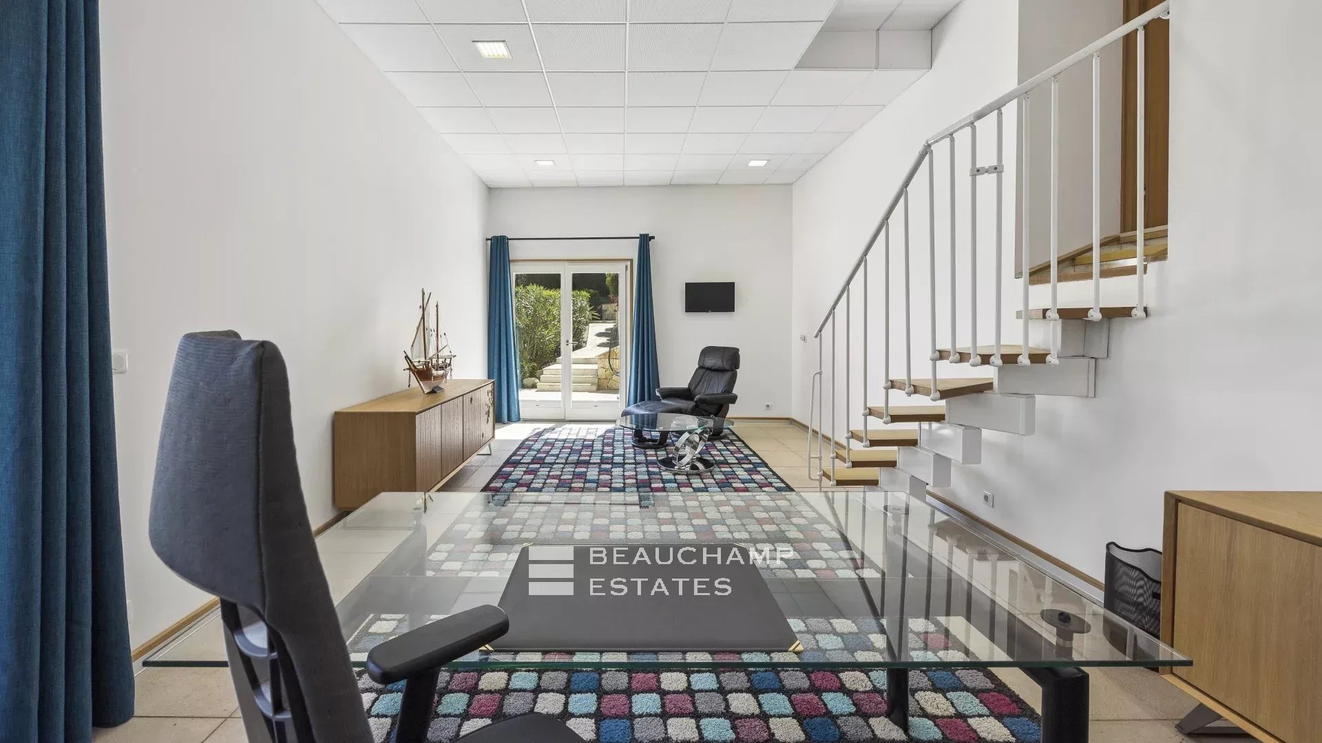 With approximately 380 m² of elegant living space, the property features a light-filled reception area with impressive ceiling heights, four bedrooms, each opening onto private terraces — including a master suite and an independent guest studio — as well as a separate office with its own entrance and a secondary lounge.