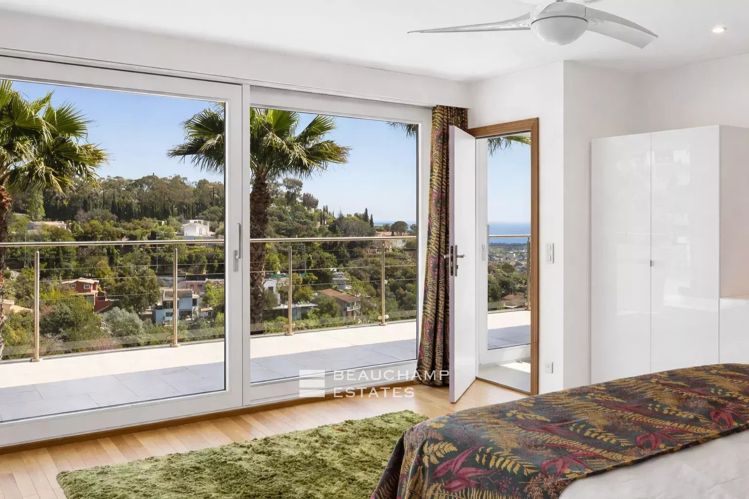 Nestled in the sought-after residential area of Les Termes in Mandelieu, this comprehensively upgraded, move-in-ready contemporary villa offers panoramic sea views over the surrounding hills and a peaceful, established hillside environment.