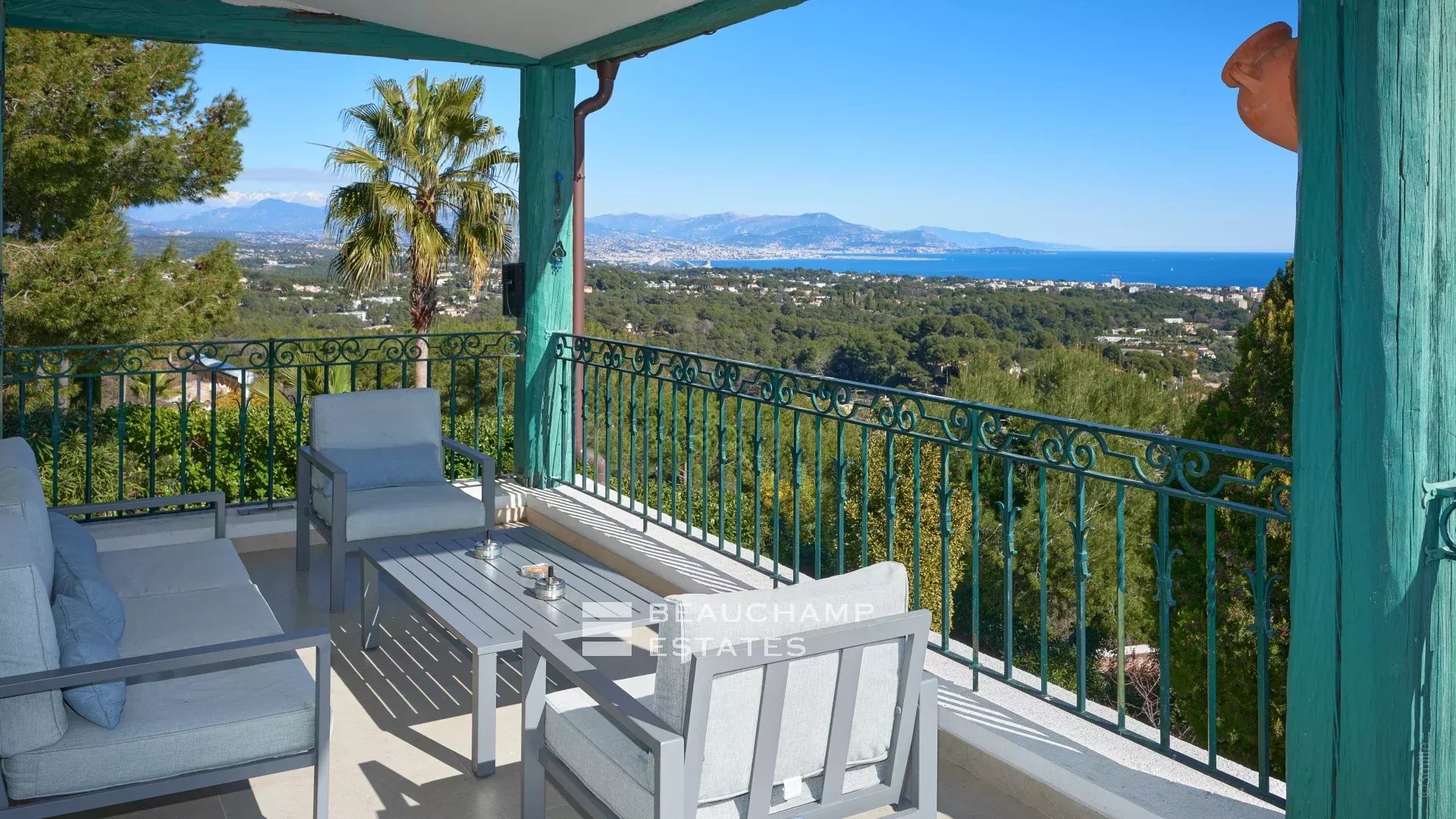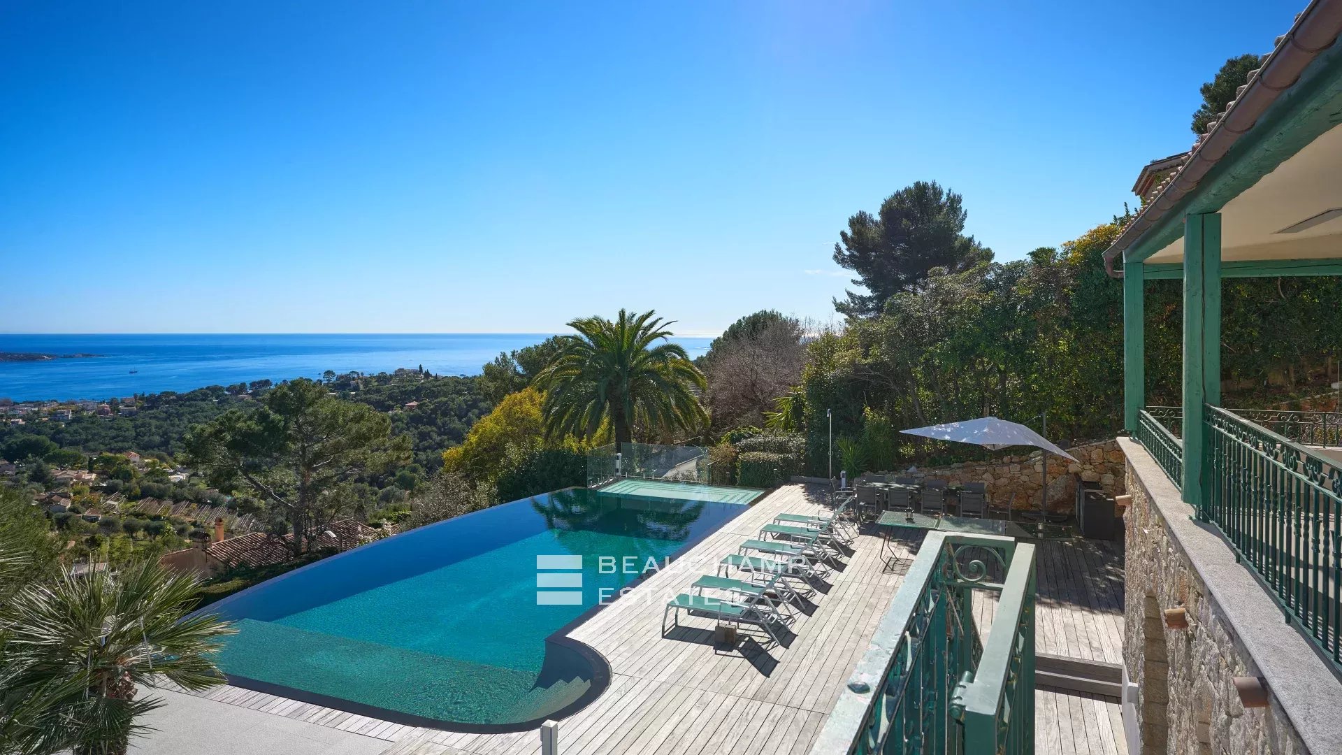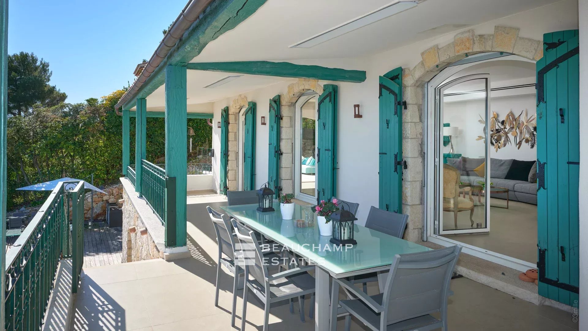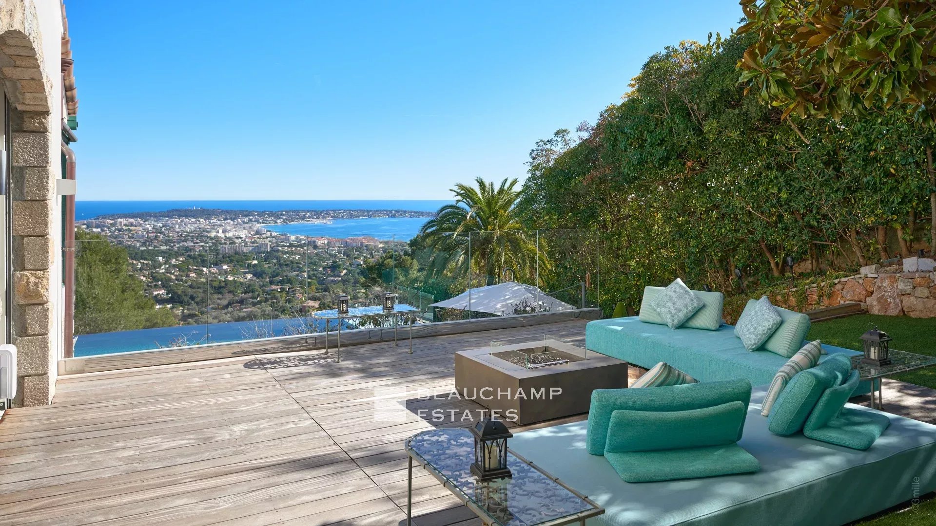 Nestled at the top of a hill overlooking the bay of Golf Juan, this superb Provencal style and completely renovated property offers a magnificent view of Cap d'Antibes and the sea.