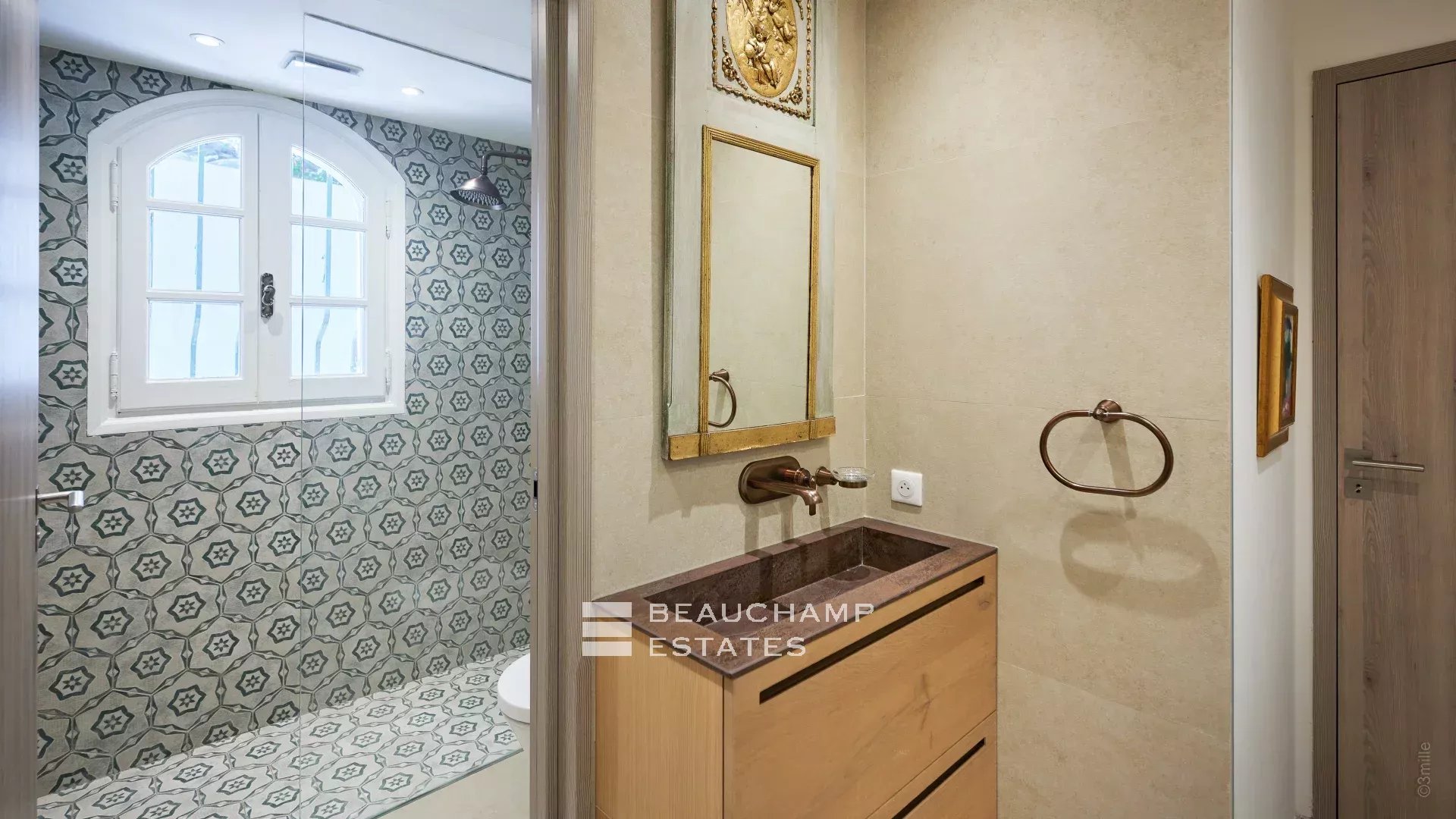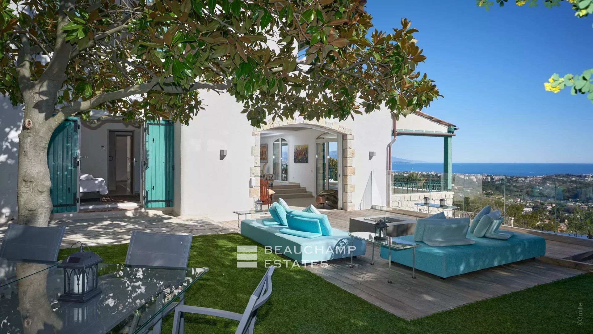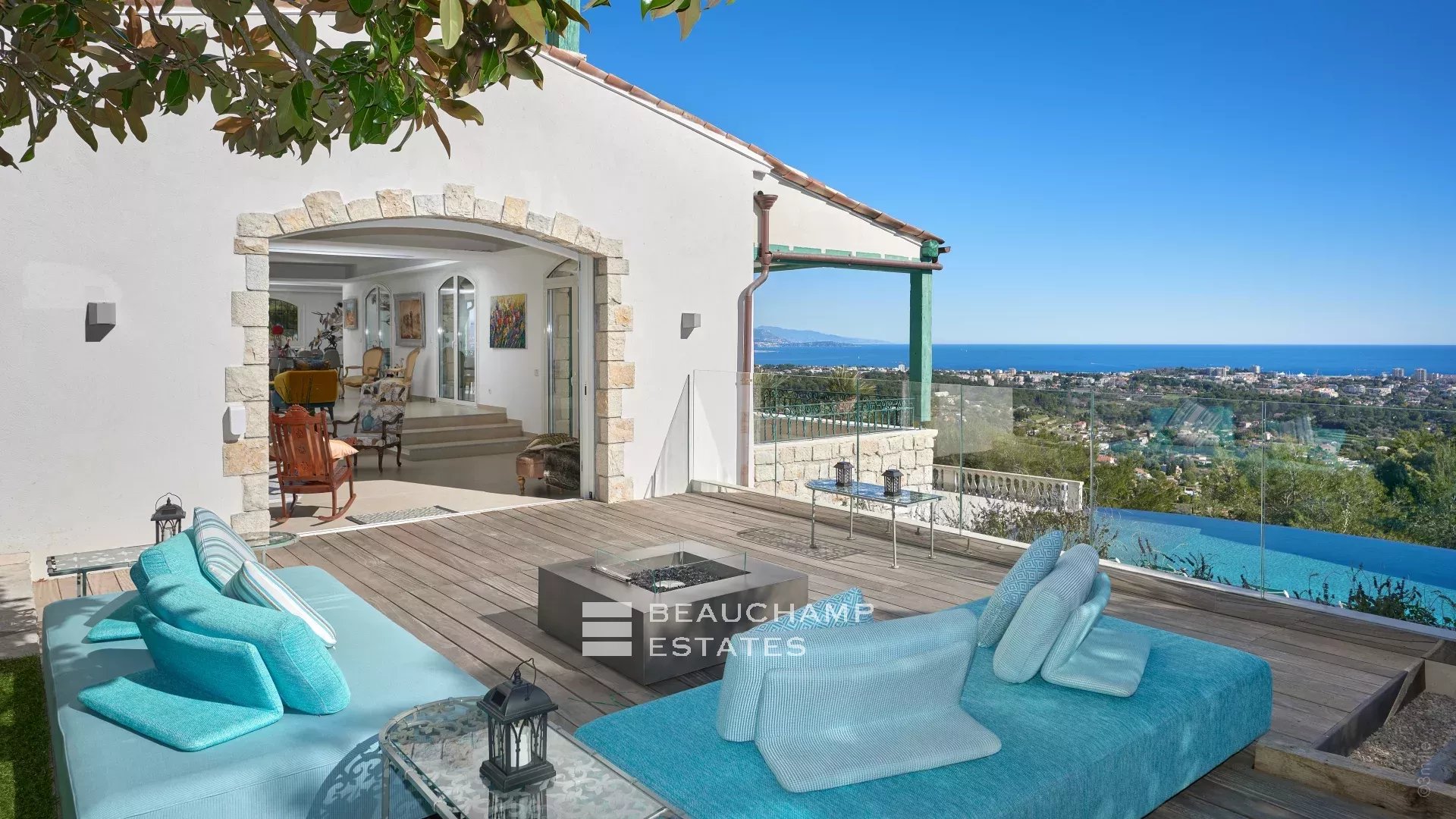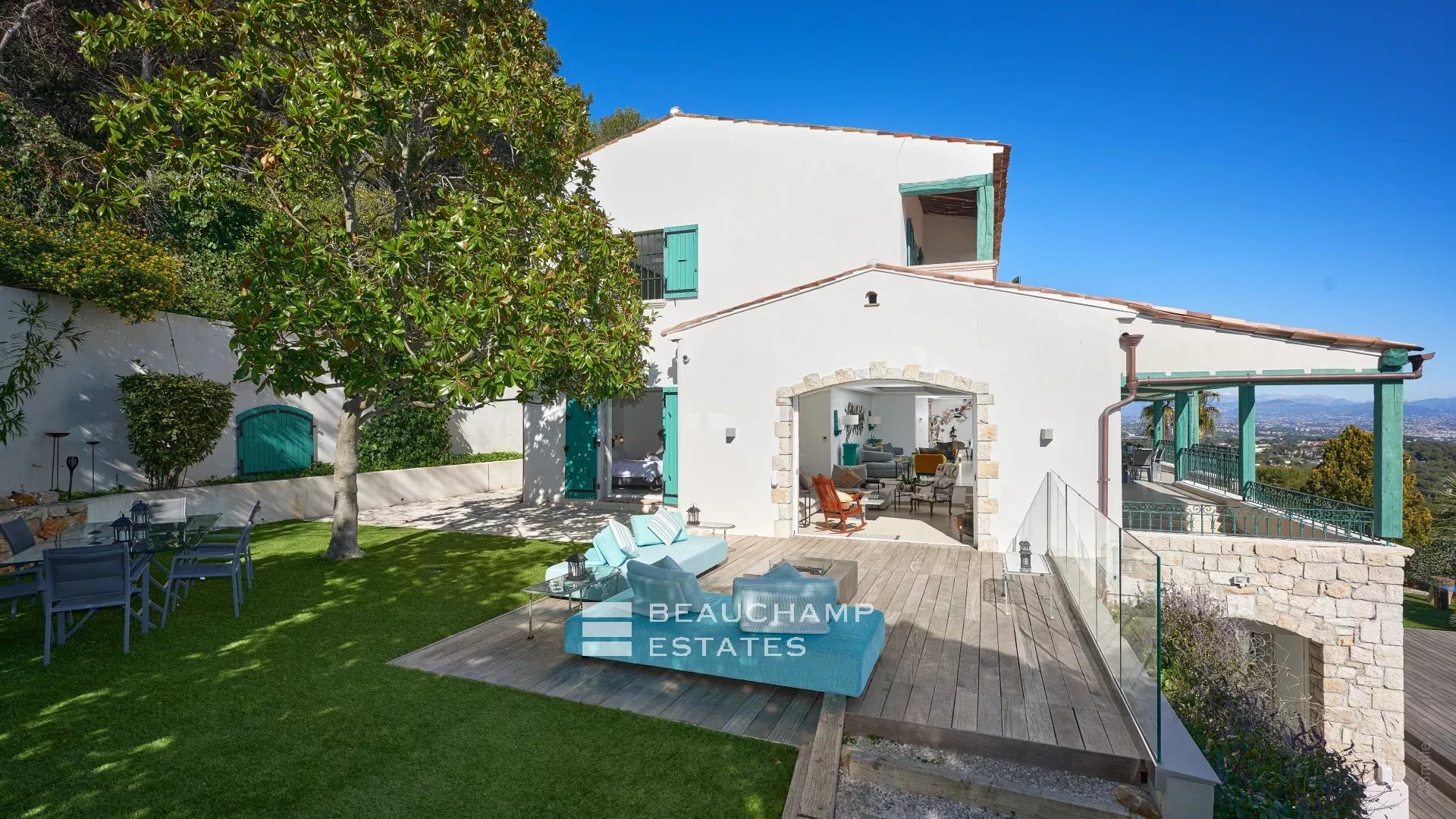 Nestled at the top of a hill overlooking the bay of Golf Juan, this superb Provencal style and completely renovated property offers a magnificent view of Cap d'Antibes and the sea.