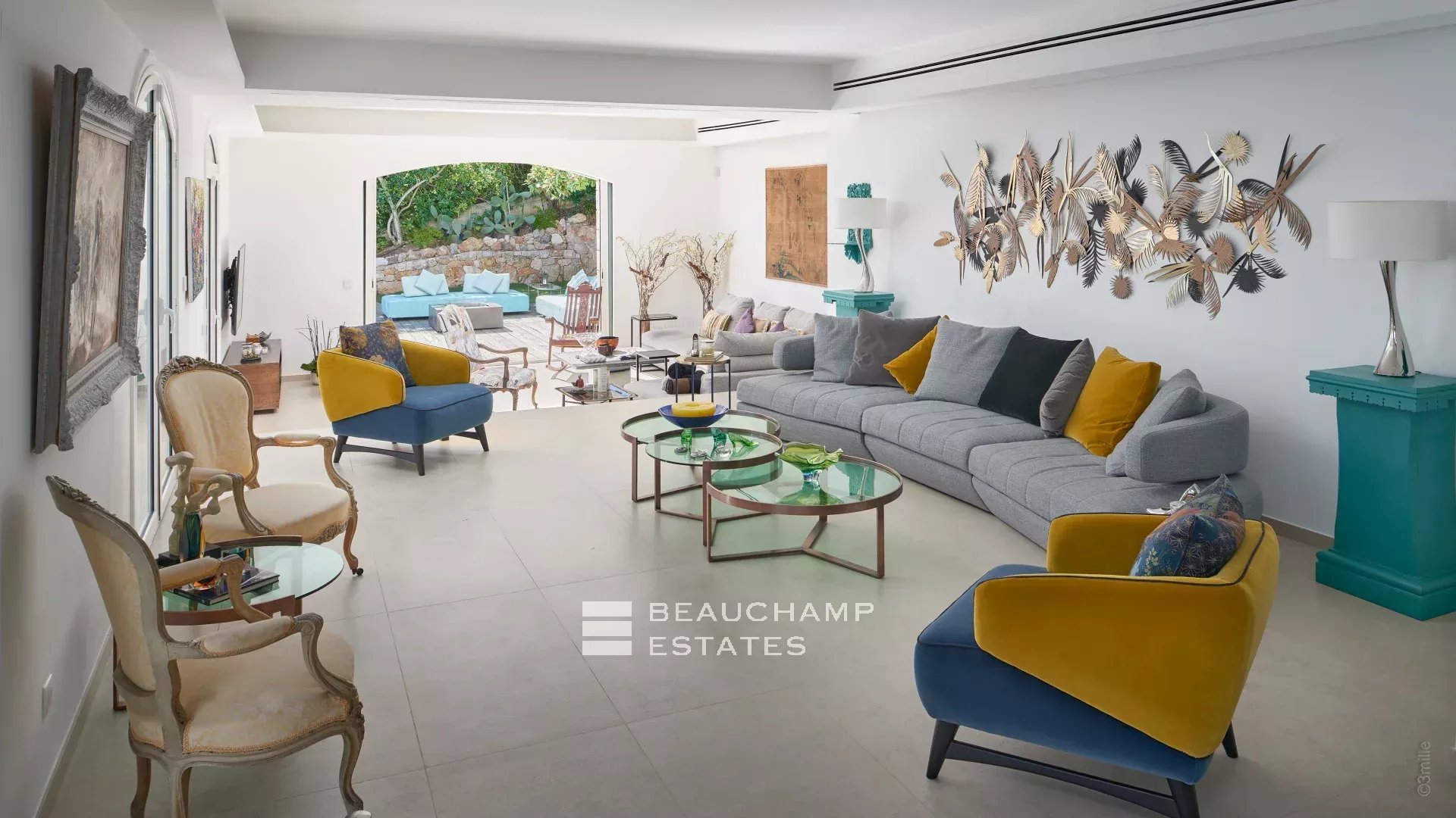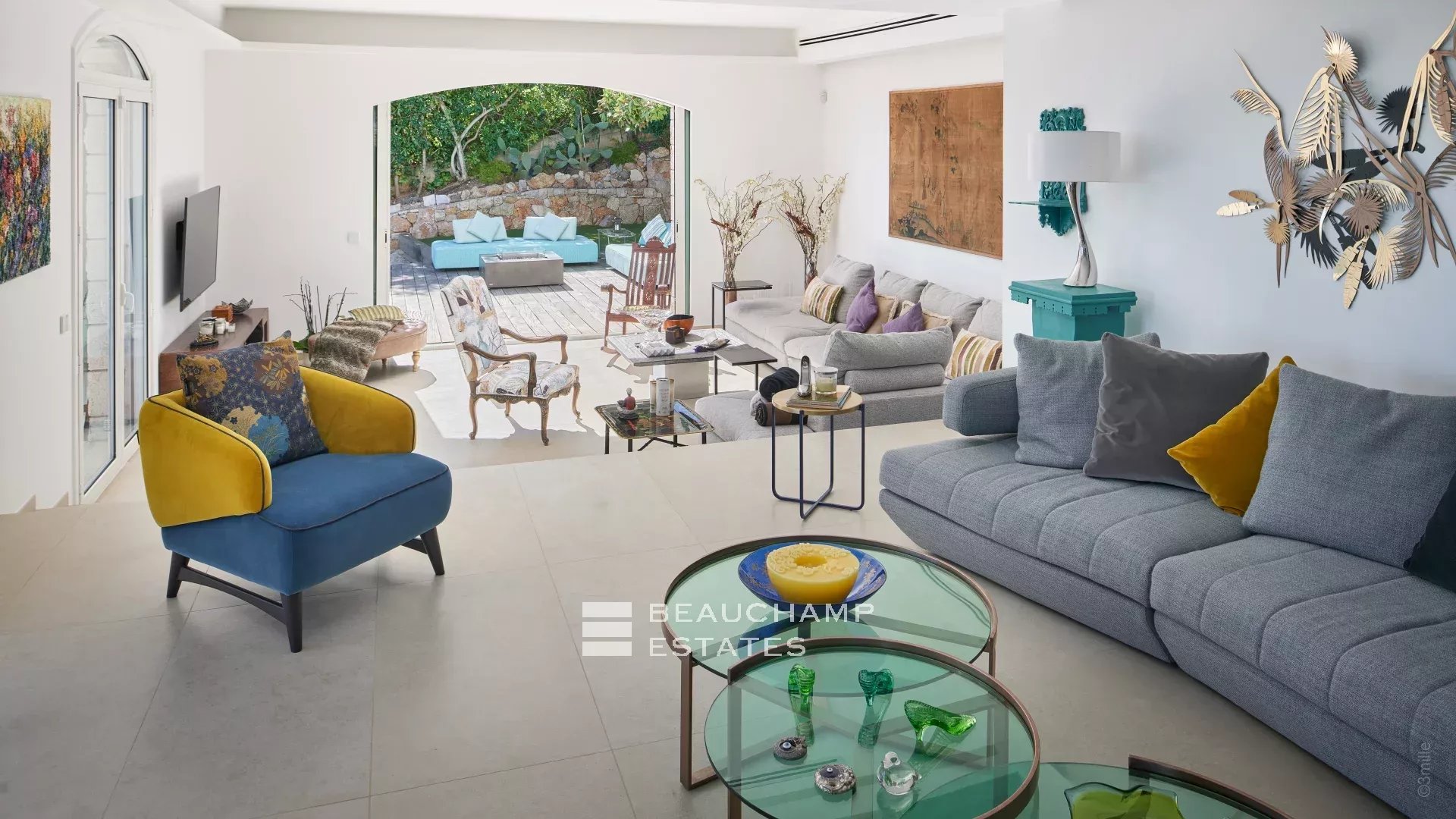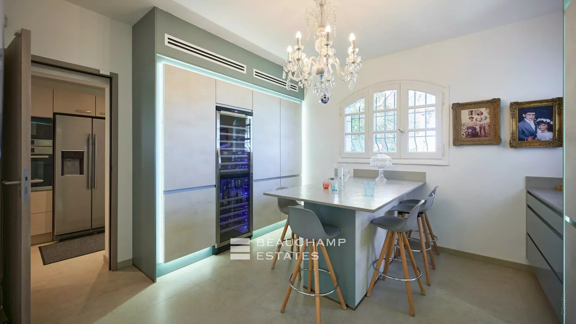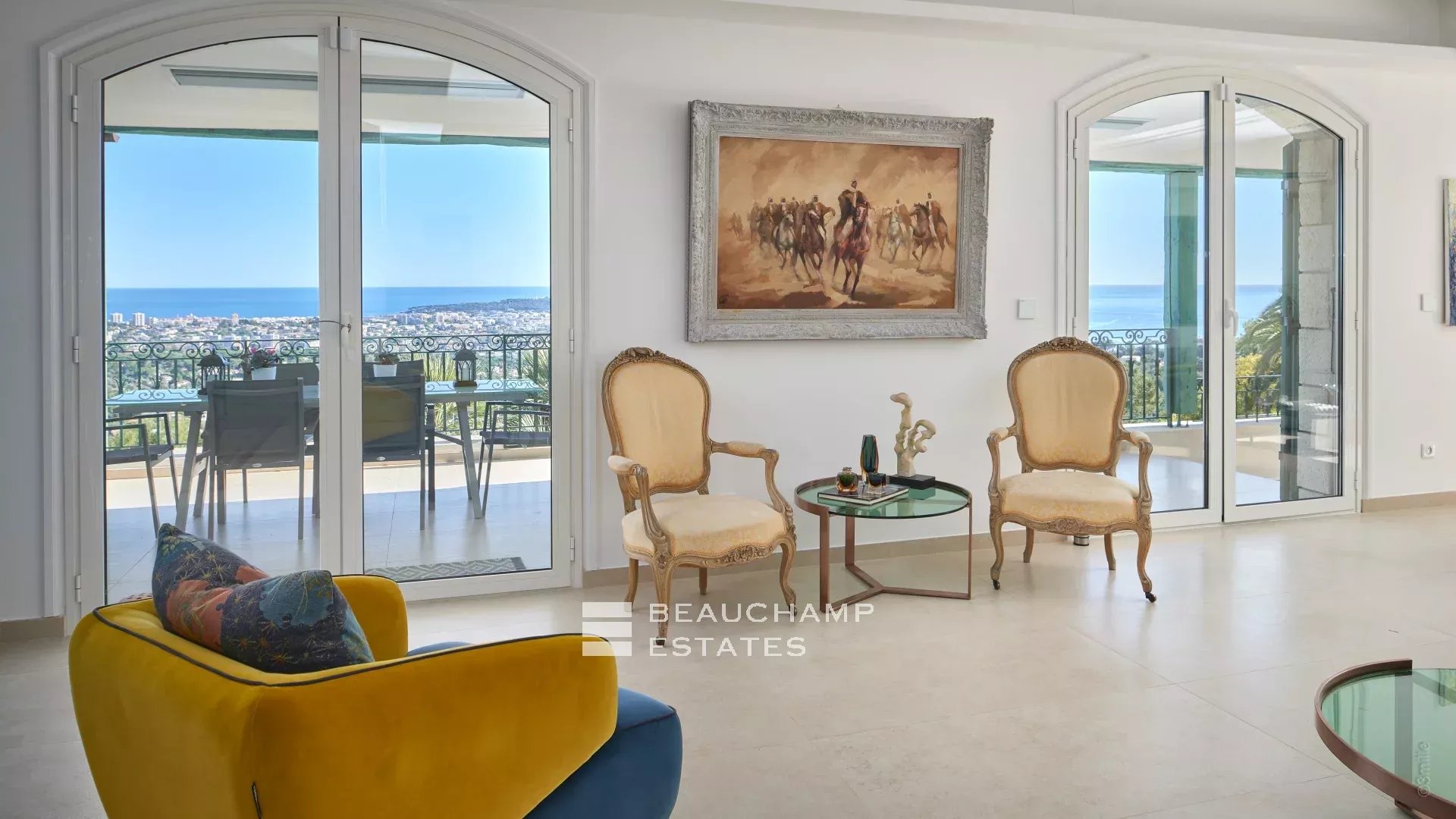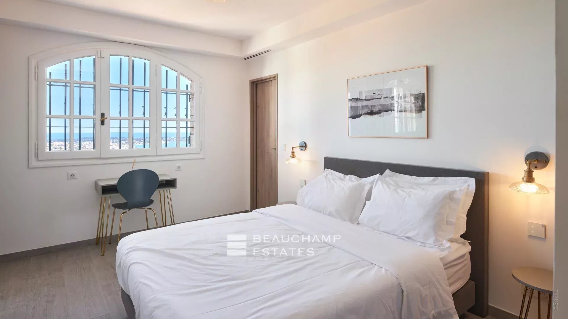 Nestled at the top of a hill overlooking the bay of Golf Juan, this superb Provencal style and completely renovated property offers a magnificent view of Cap d'Antibes and the sea.