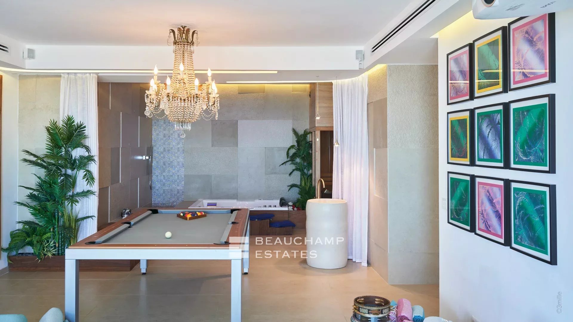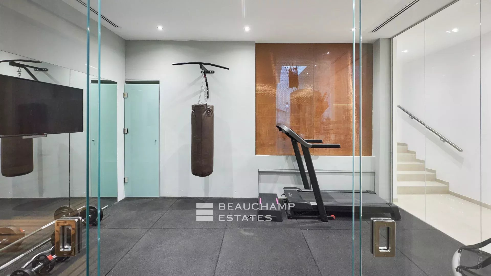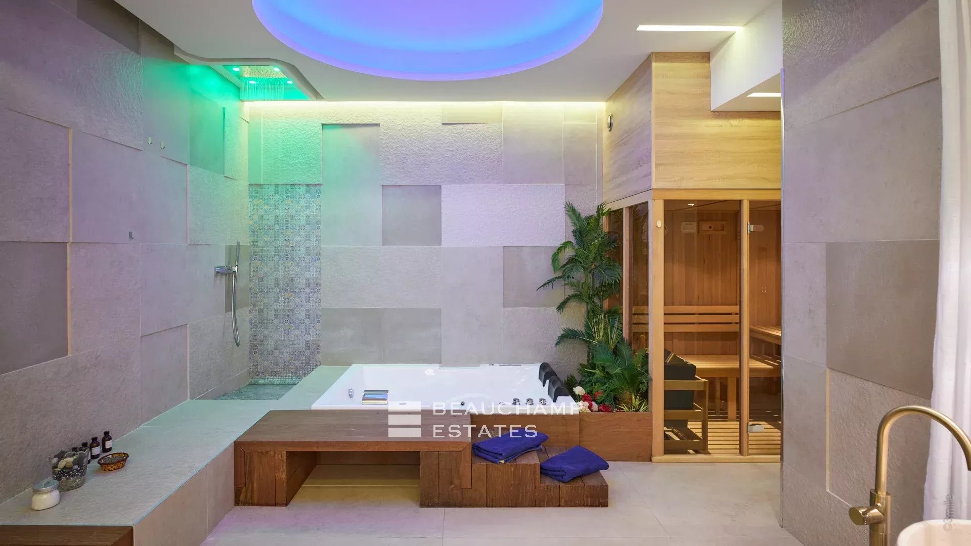 A nice entertaining space with a fitness room, a cinema, a billard space and a Spa area with Jaccuzi / Sauna / Shower and a toilet