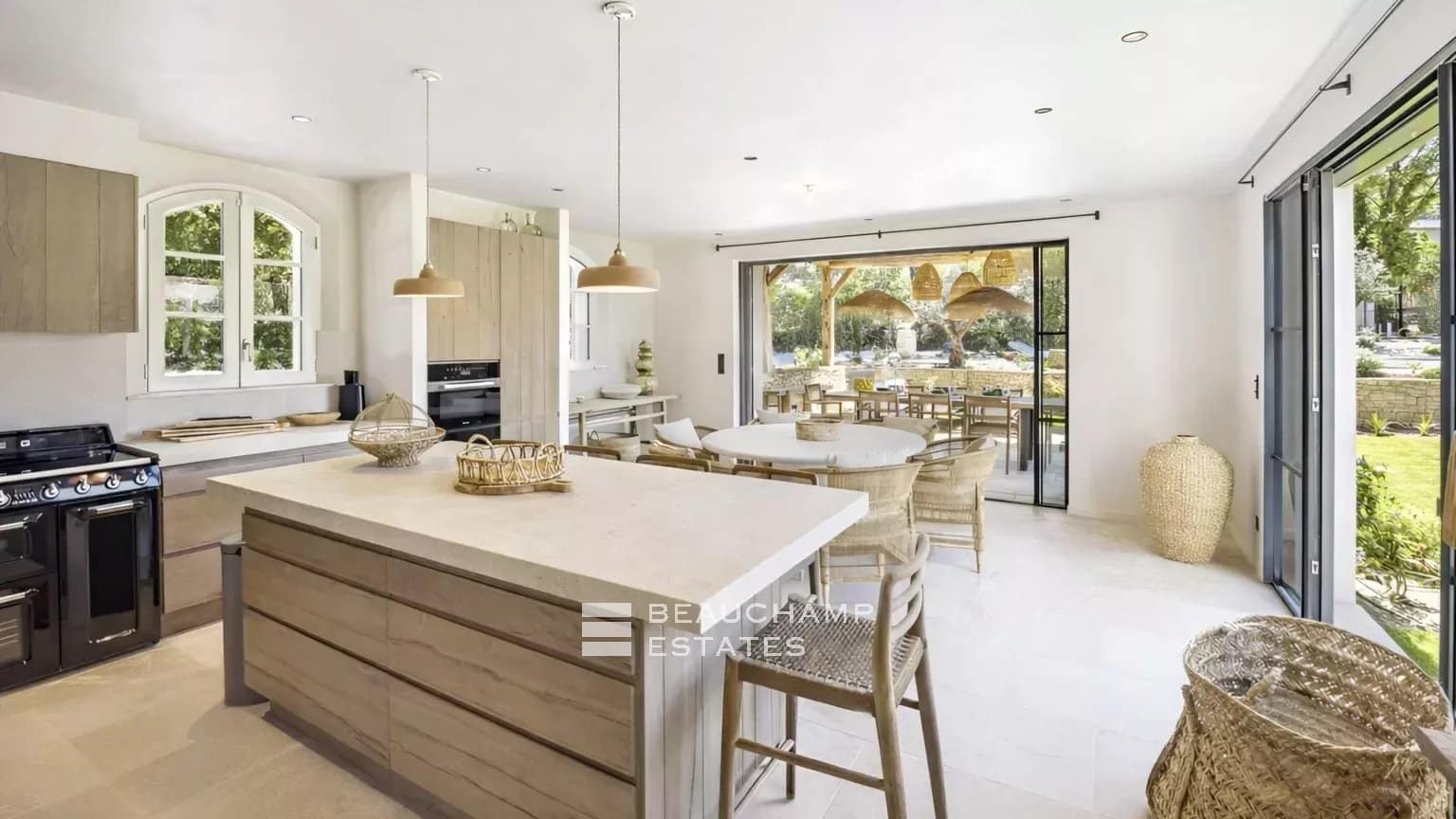 The spacious and bright living room opens onto a fully equipped open-plan kitchen, seamlessly connecting with the outdoors for effortless indoor-outdoor living.