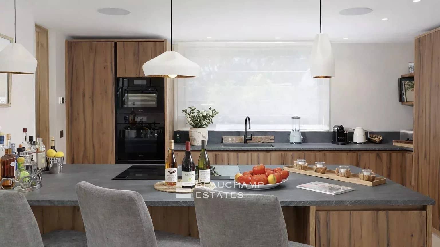 The sun-filled reception areas include an elegant living room and a dining area beneath a skylight, creating a warm and sophisticated atmosphere. The fully equipped kitchen meets the highest standards.