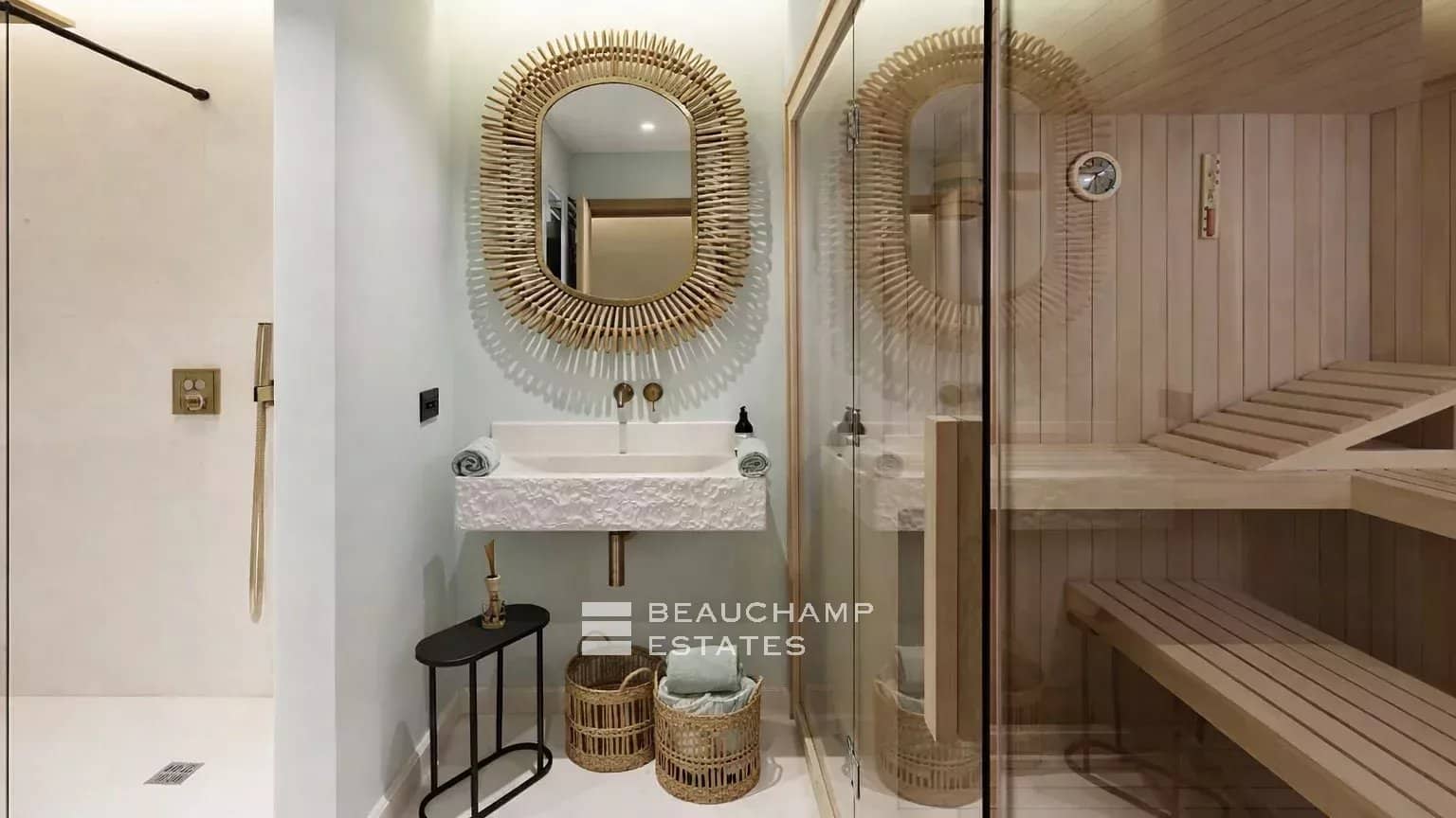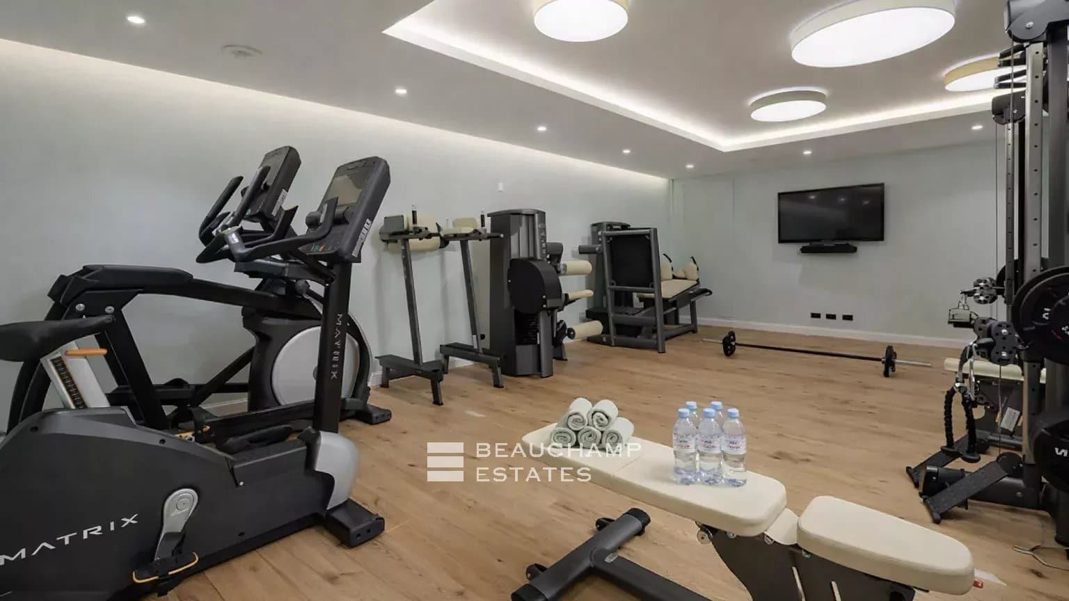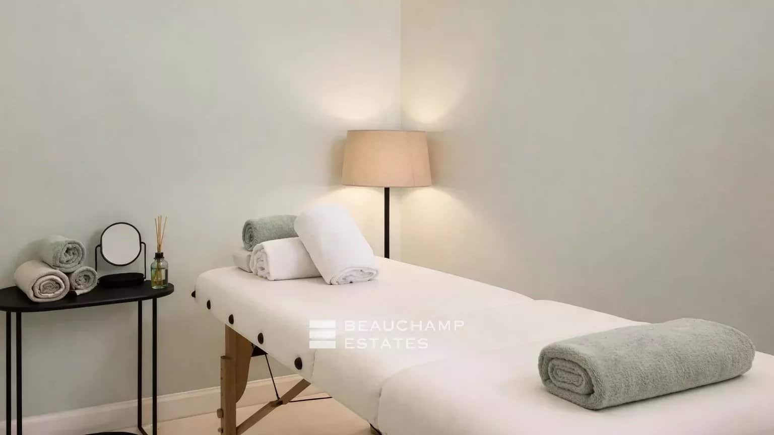 Designed with well-being in mind, the villa includes a professional gym fitted with Gym 80 equipment and a state-of-the-art fresh air circulation system, as well as a hammam and a massage room.