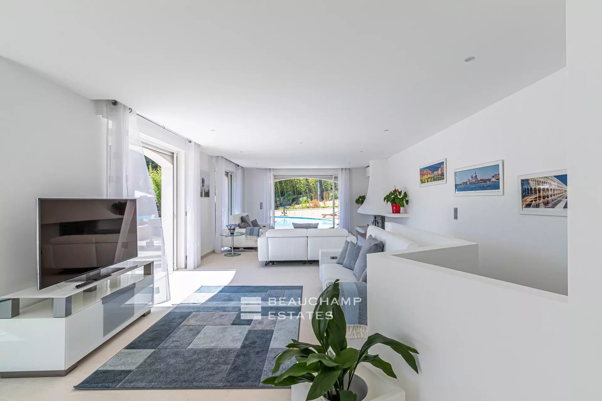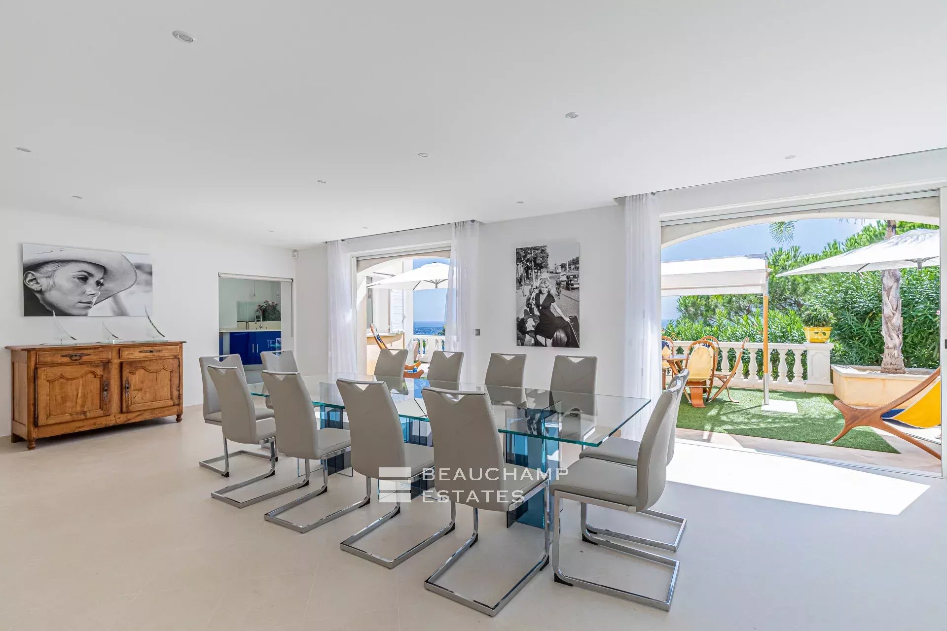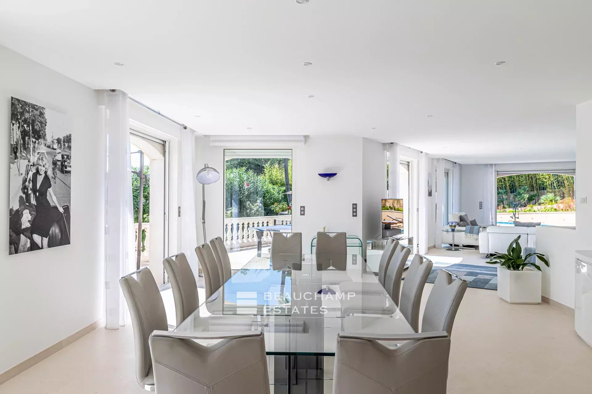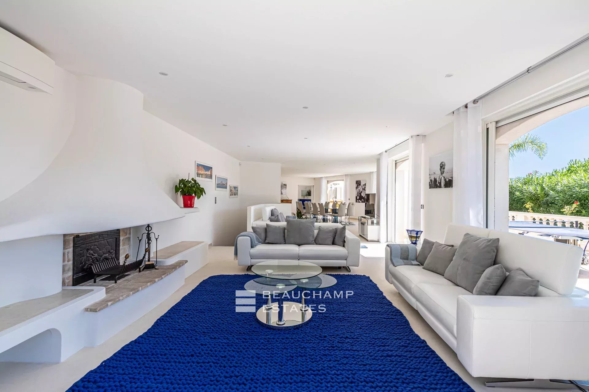• Living/dining room with access to pool terrace, fireplace, dining table with seating for 10.