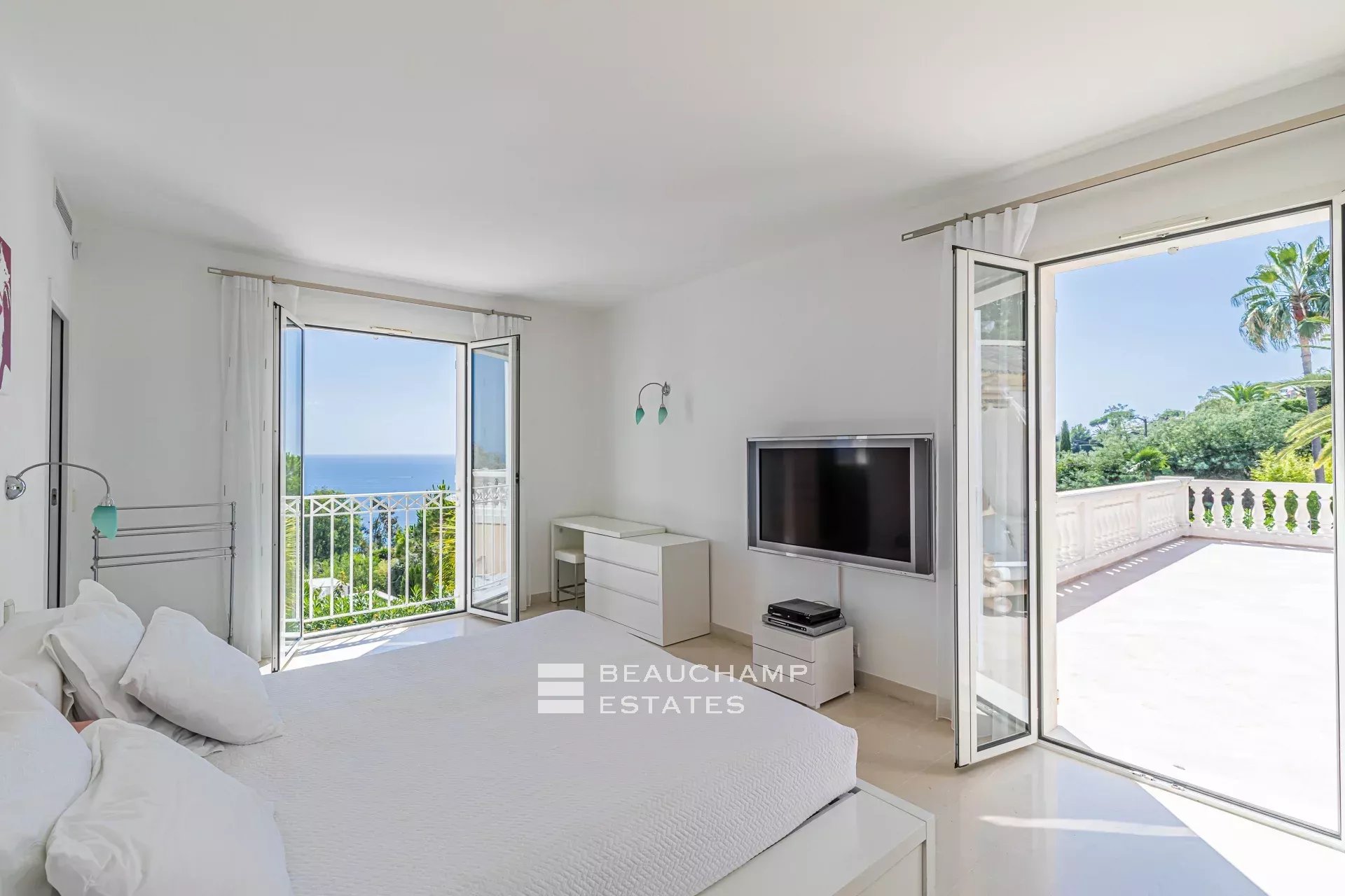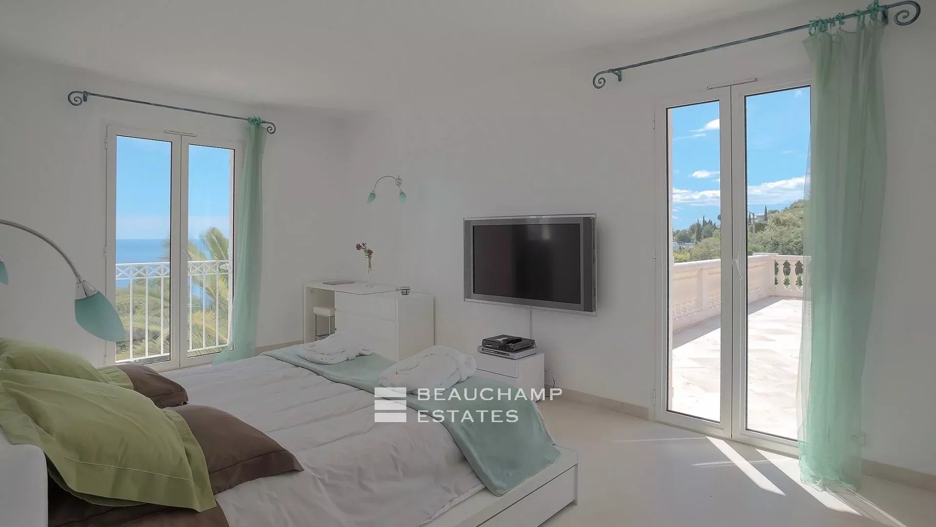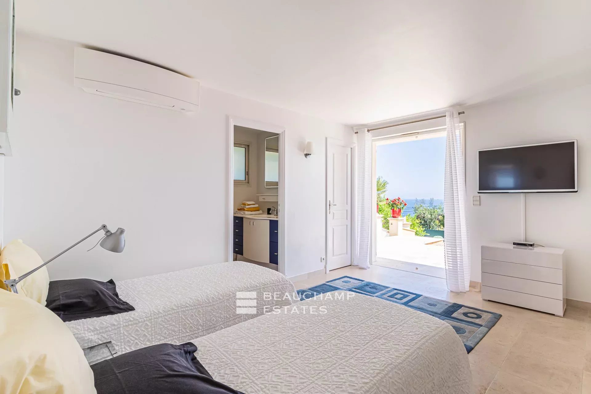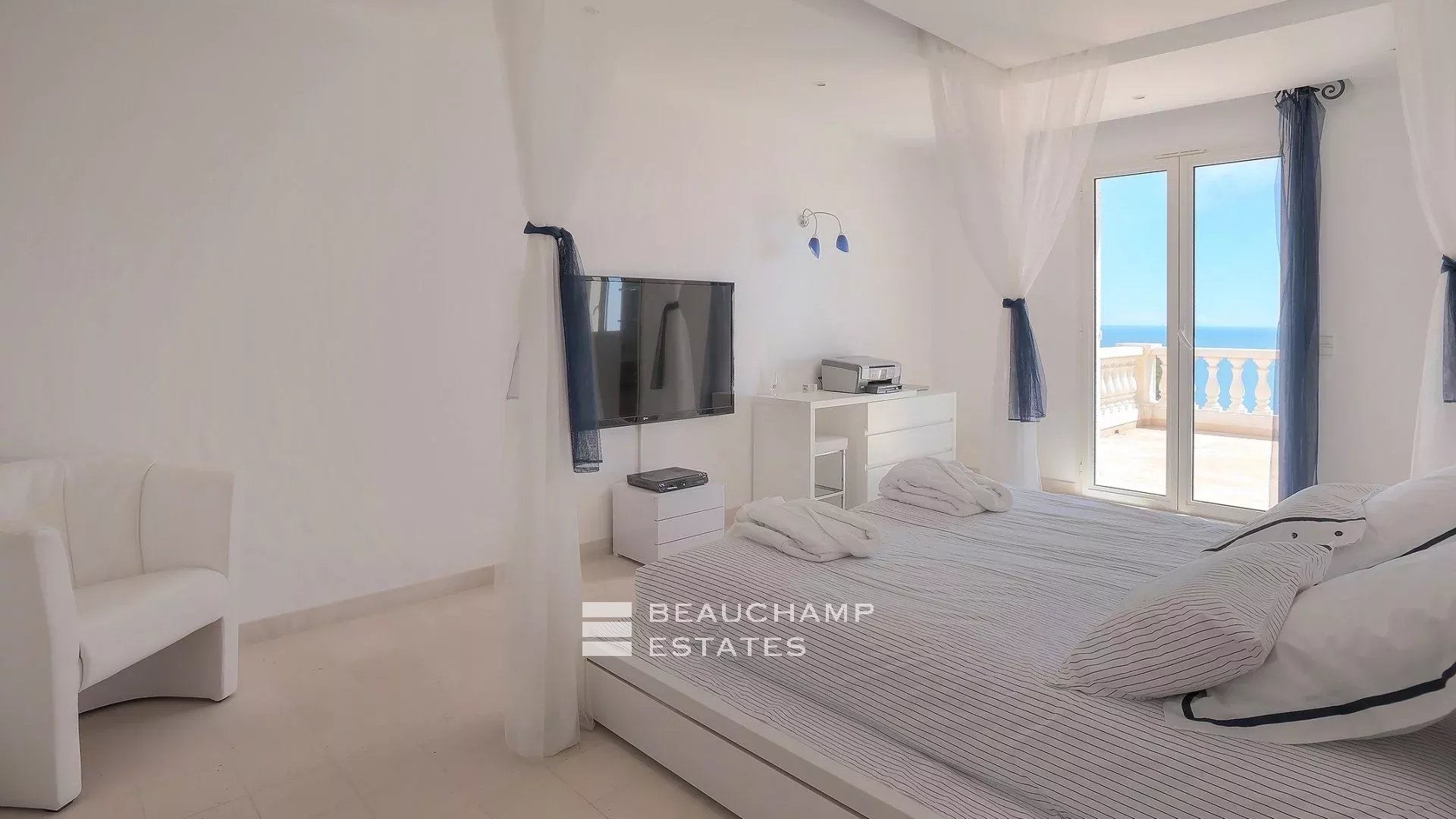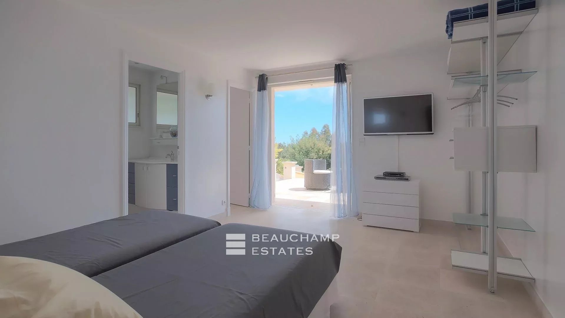 • Bedroom 3 (Master) : King-size bed (200 cm), en suite bathroom with bath, shower and WC, writing table, dressing room, private terrace and sea view.