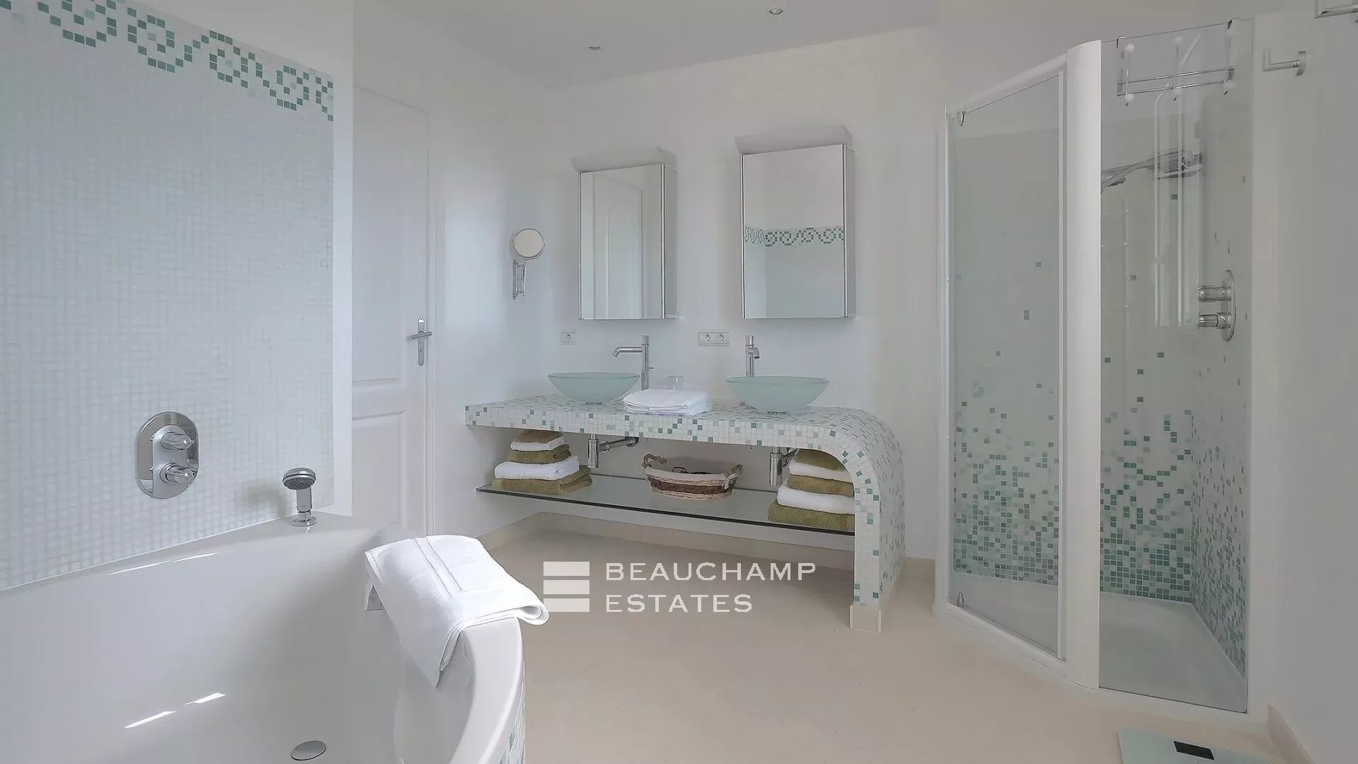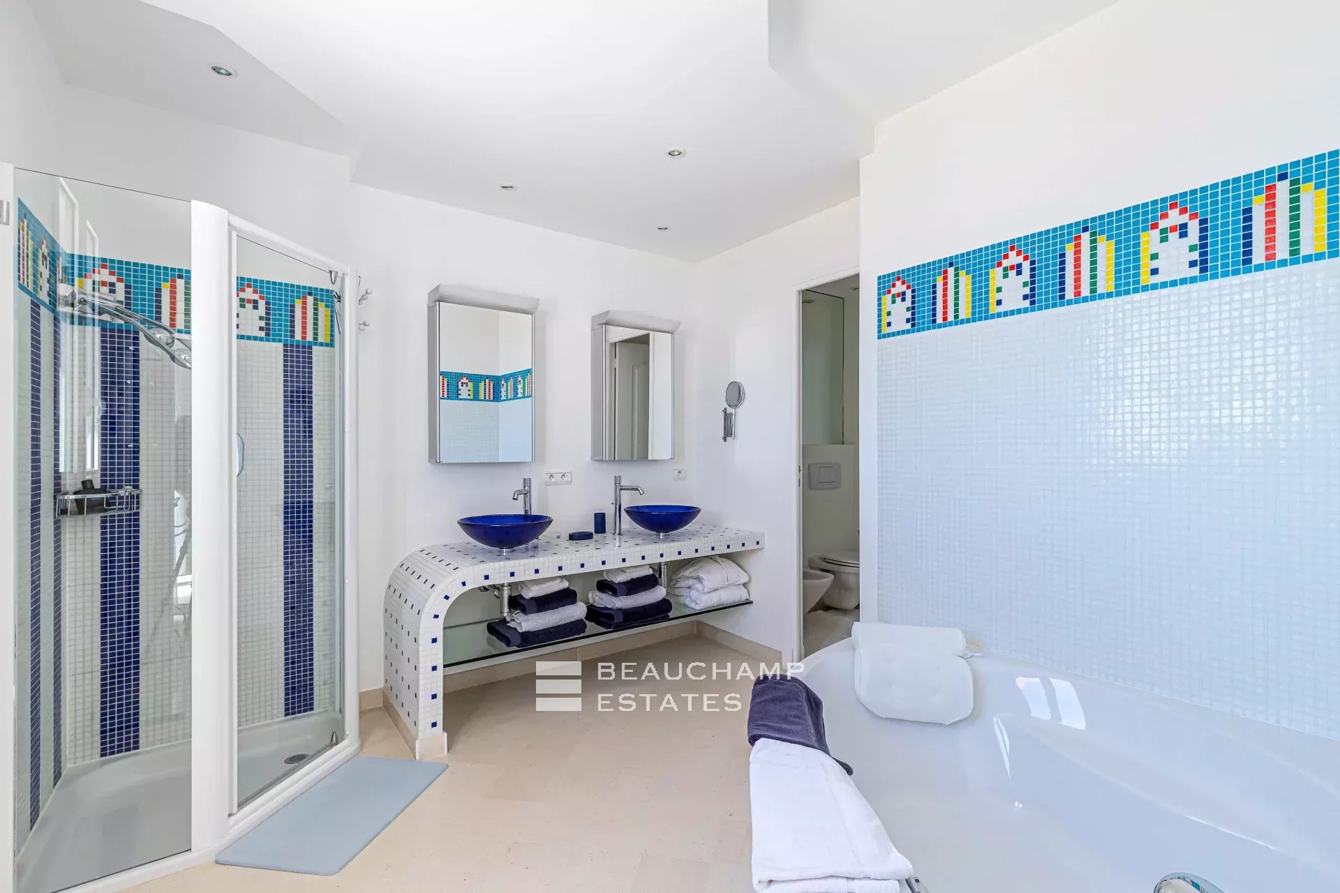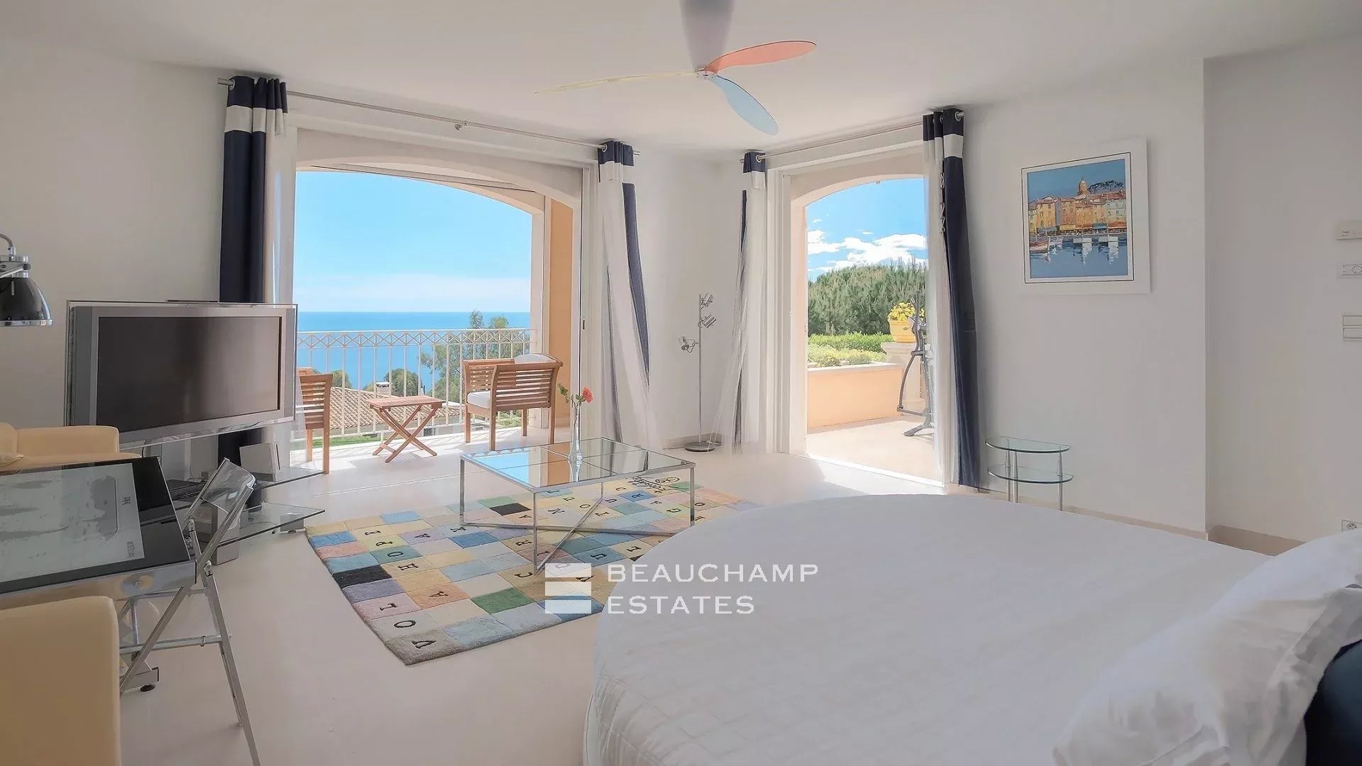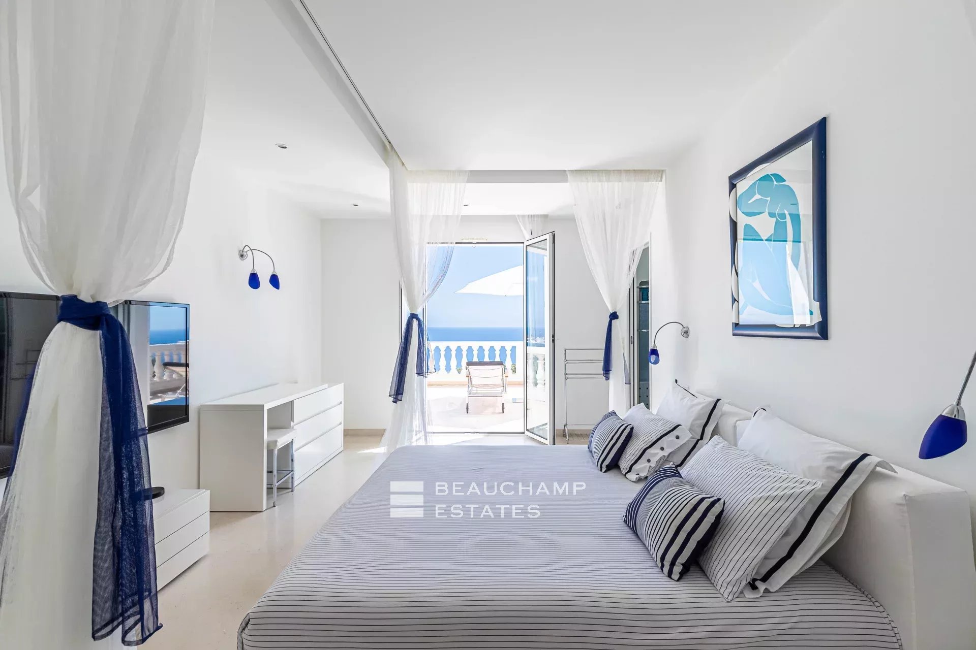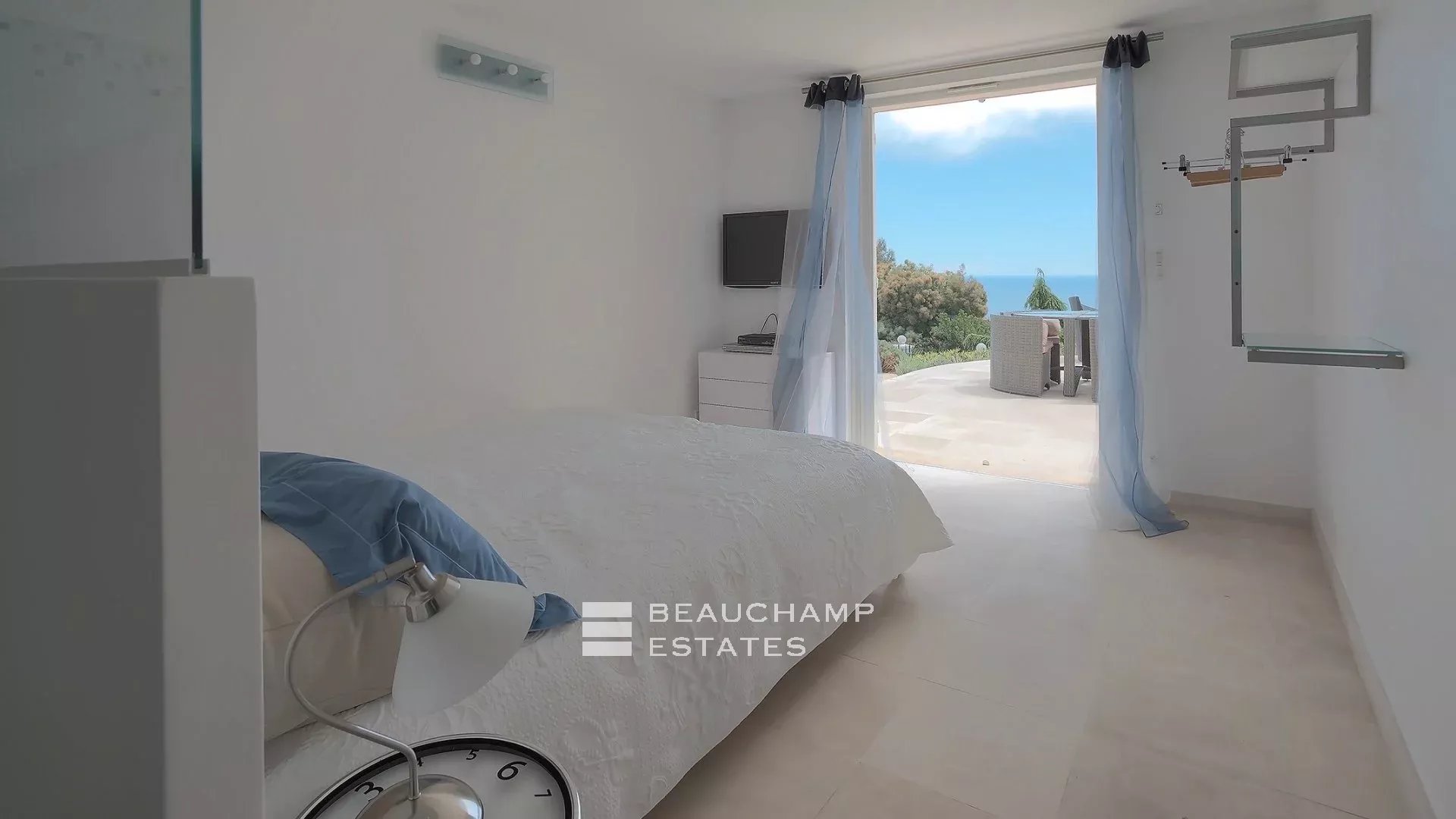 • Bedroom 3 (Master) : King-size bed (200 cm), en suite bathroom with bath, shower and WC, writing table, dressing room, private terrace and sea view.