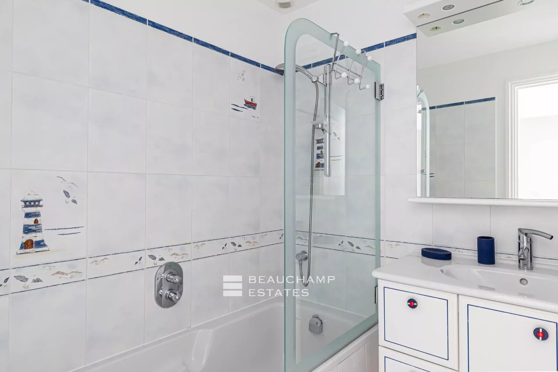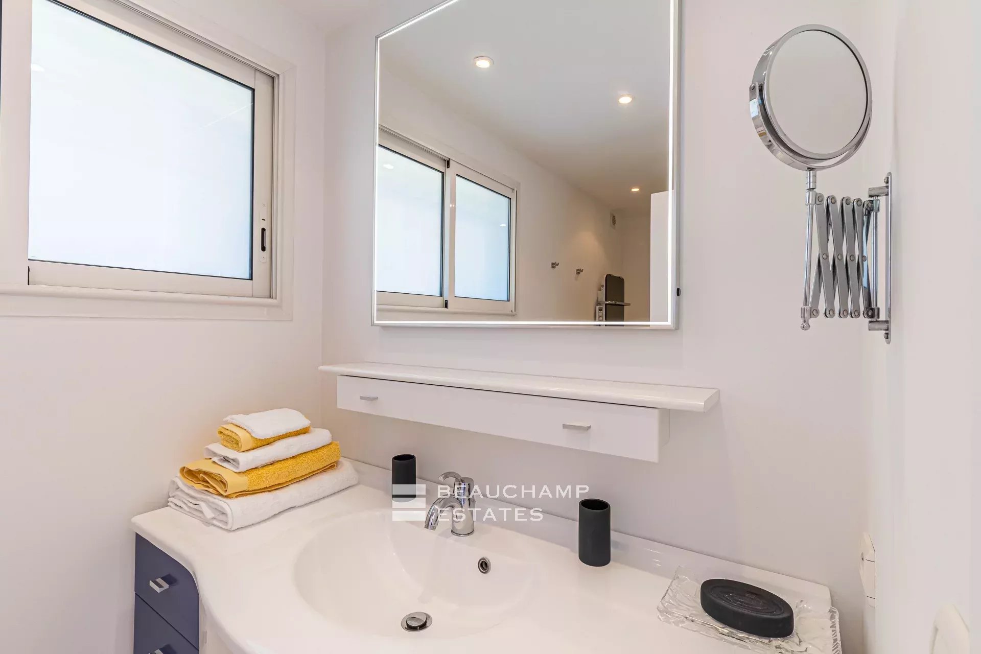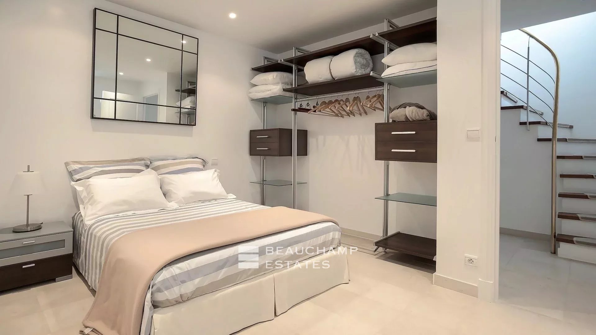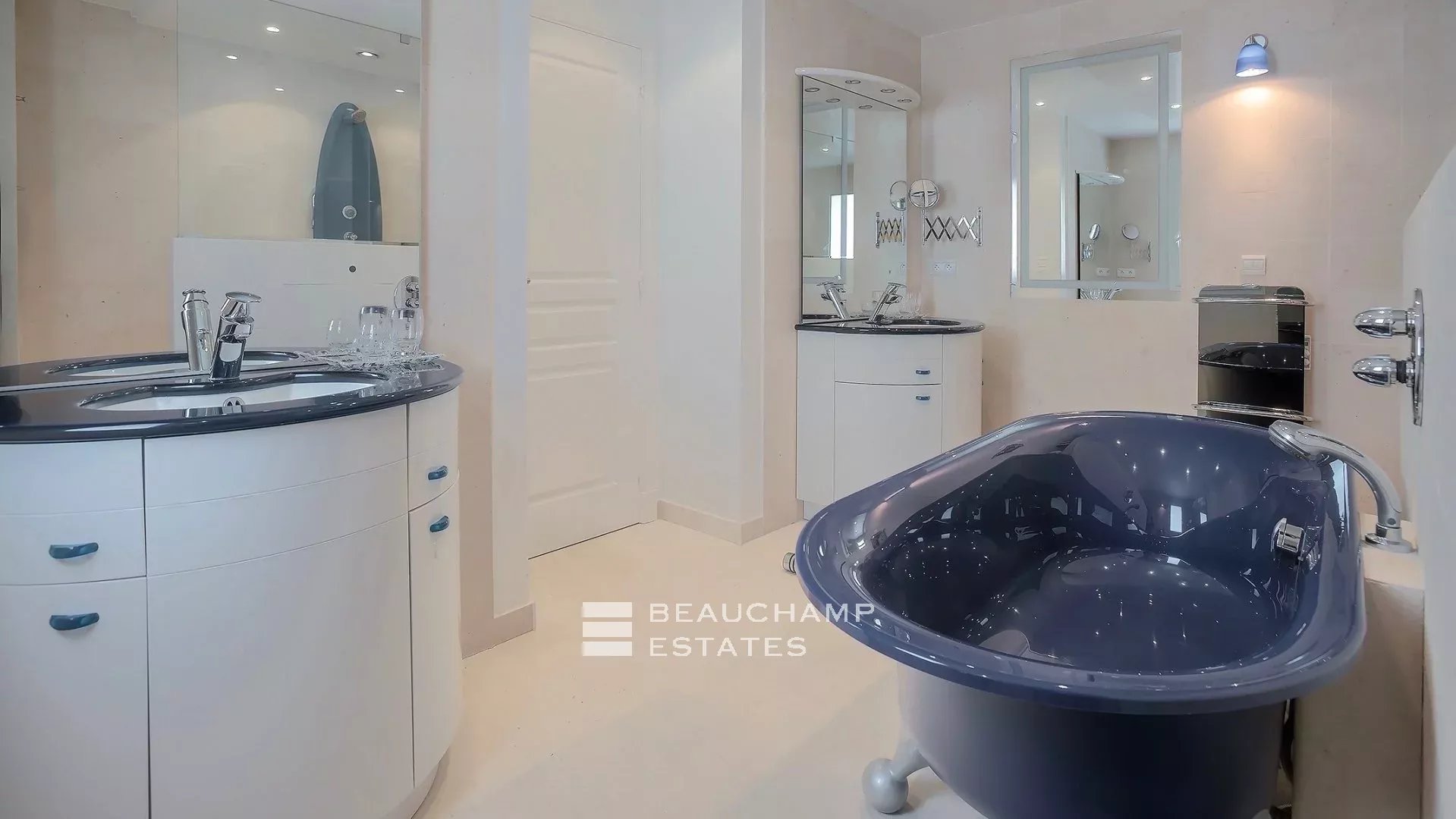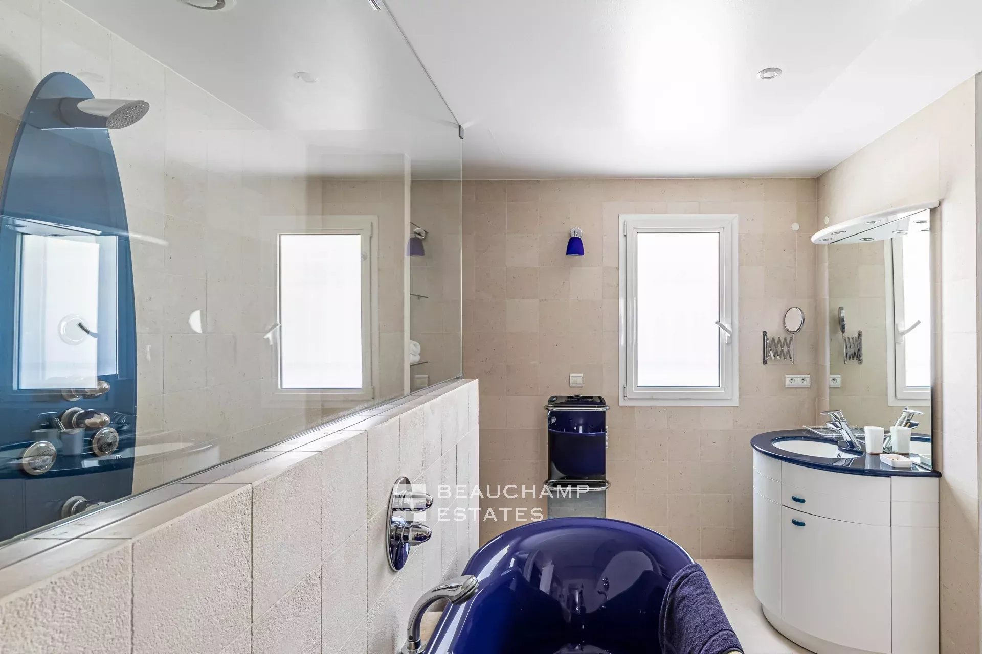 • Bedroom 3 (Master) : King-size bed (200 cm), en suite bathroom with bath, shower and WC, writing table, dressing room, private terrace and sea view.