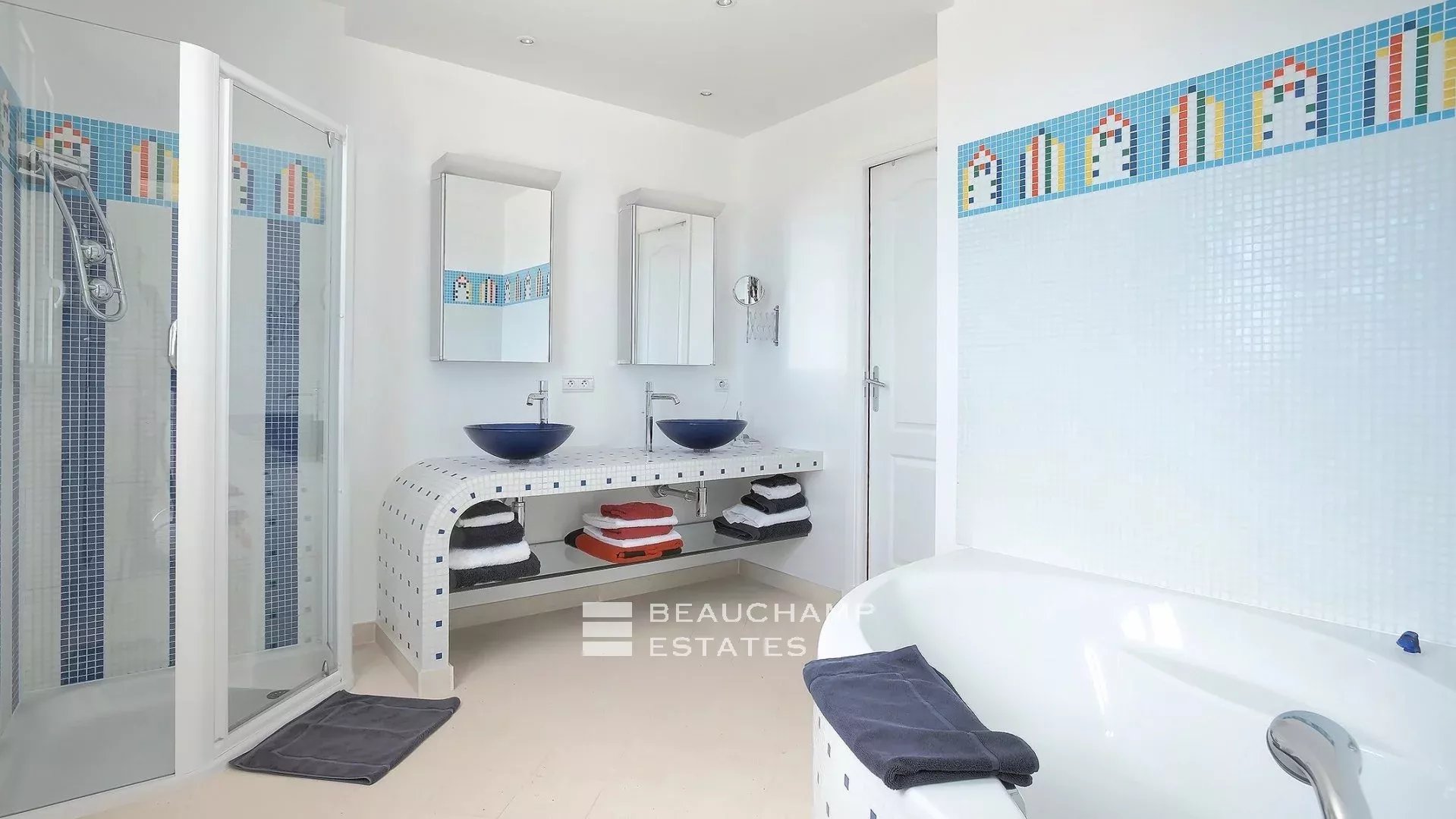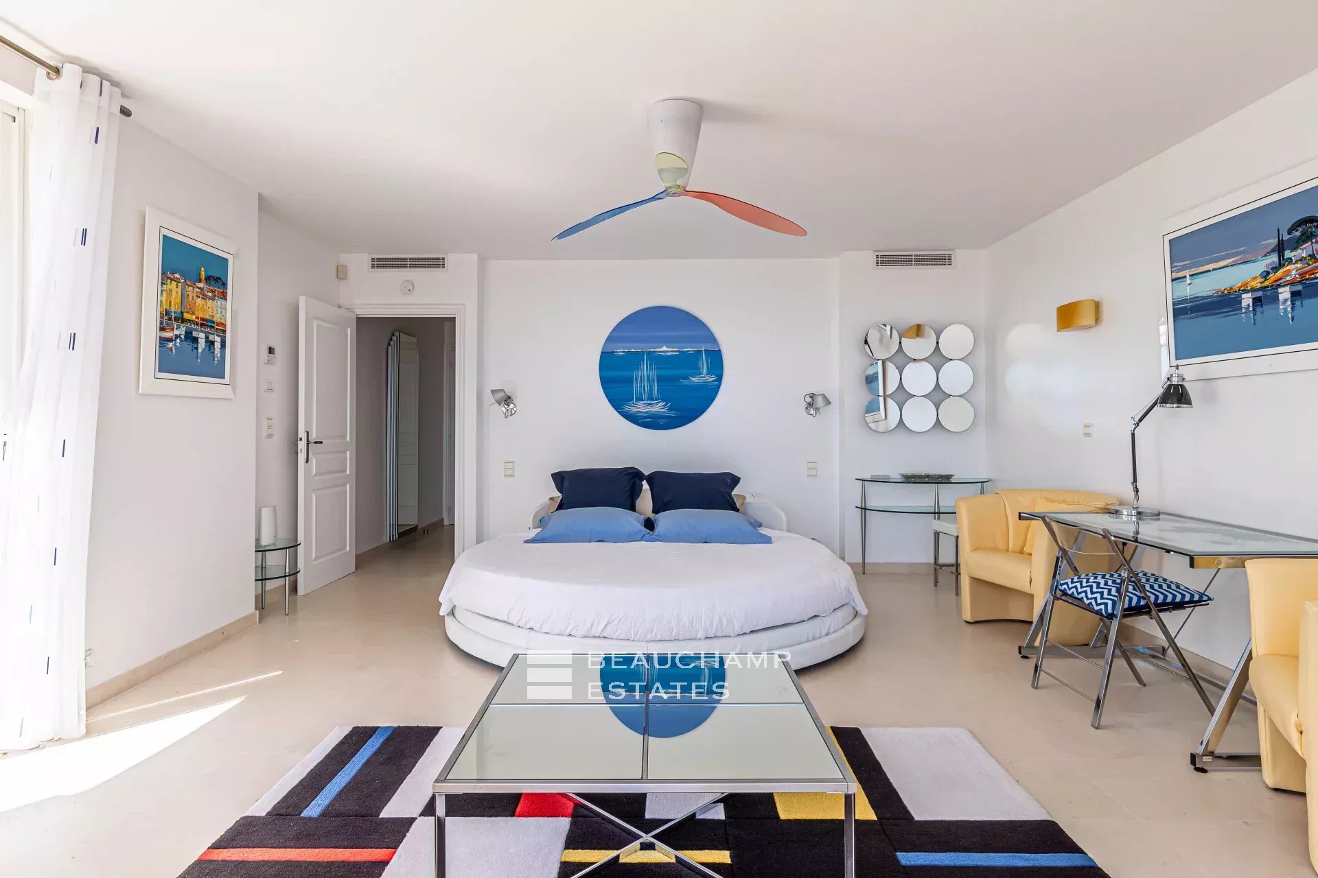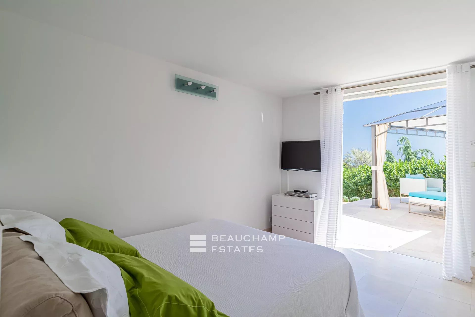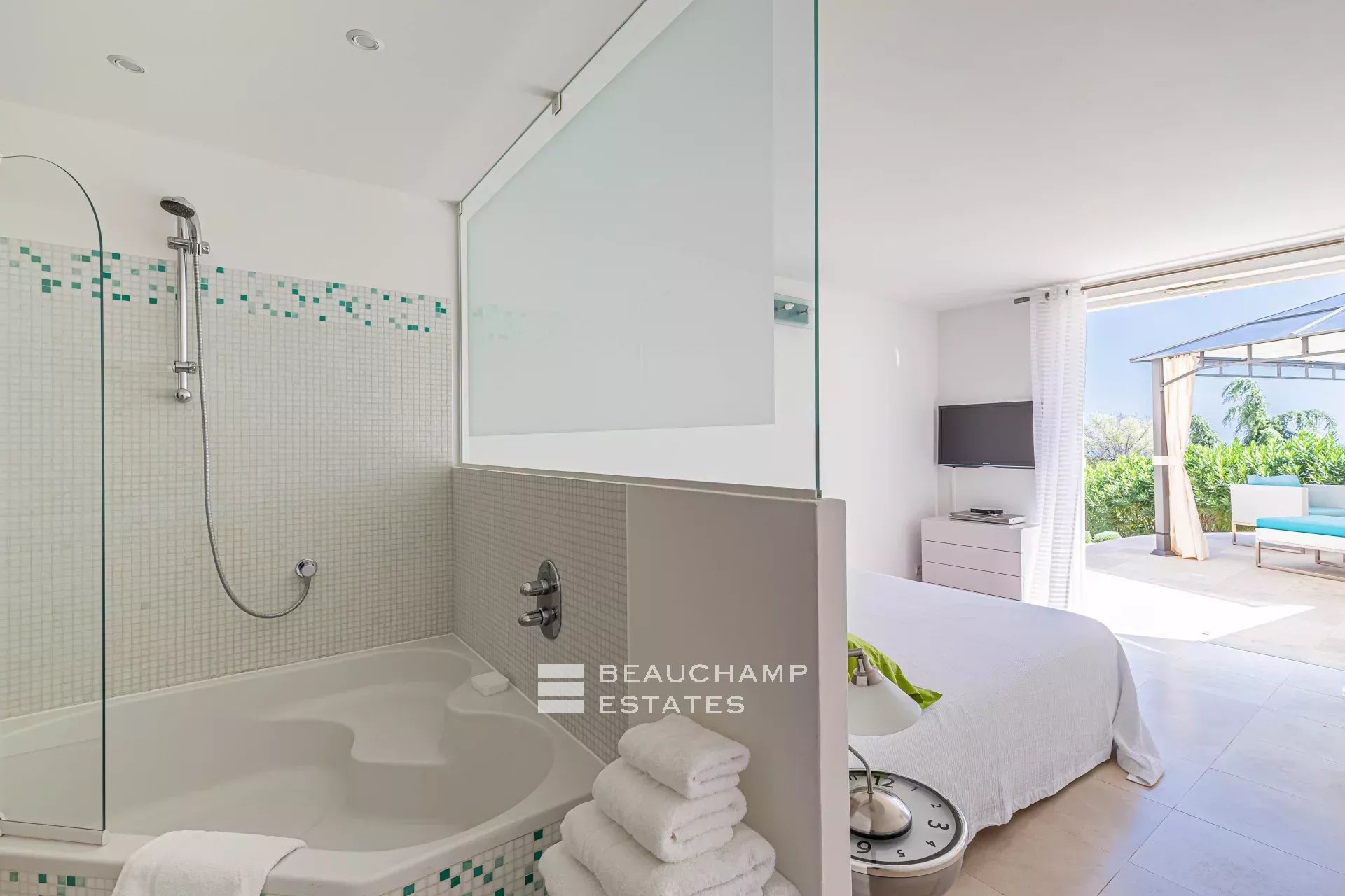 • Bedroom 1 (Master) : 35m2 suite with round King-size bed (200 cm), dressing room, ensuite bathroom with bath and multi-jet shower, television, balcony, sea view and large private terrace with large gazebo