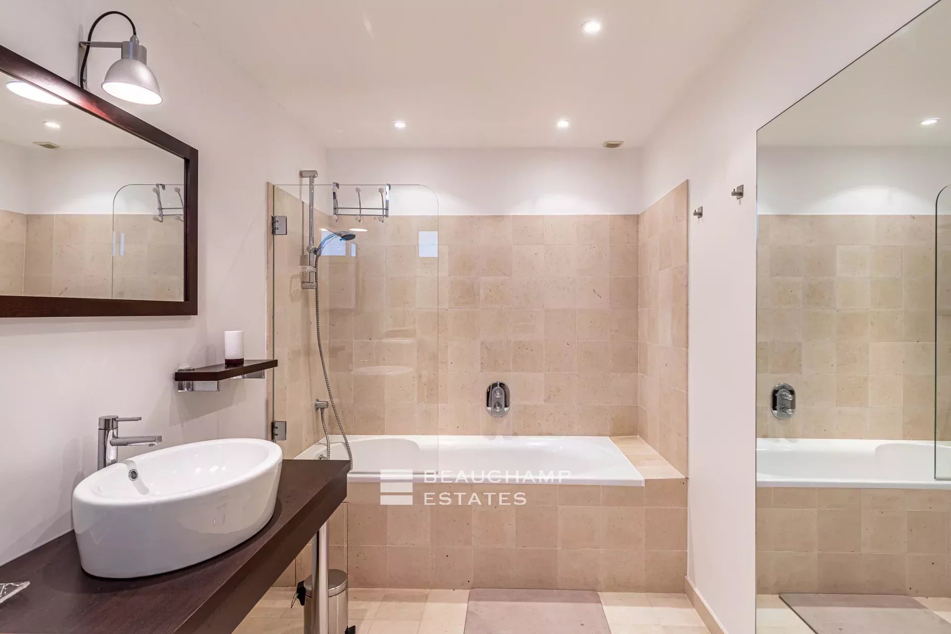 • Bedroom 6: Queen-size bed (140 cm), en suite bathroom with bath, shower and WC, Access to lower terrace.