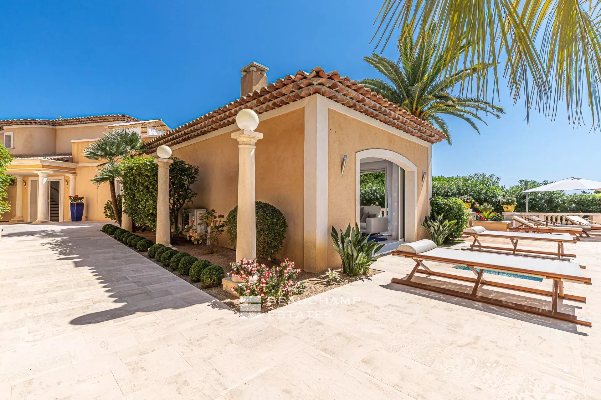 • Pool terrace with sun loungers and a cabana