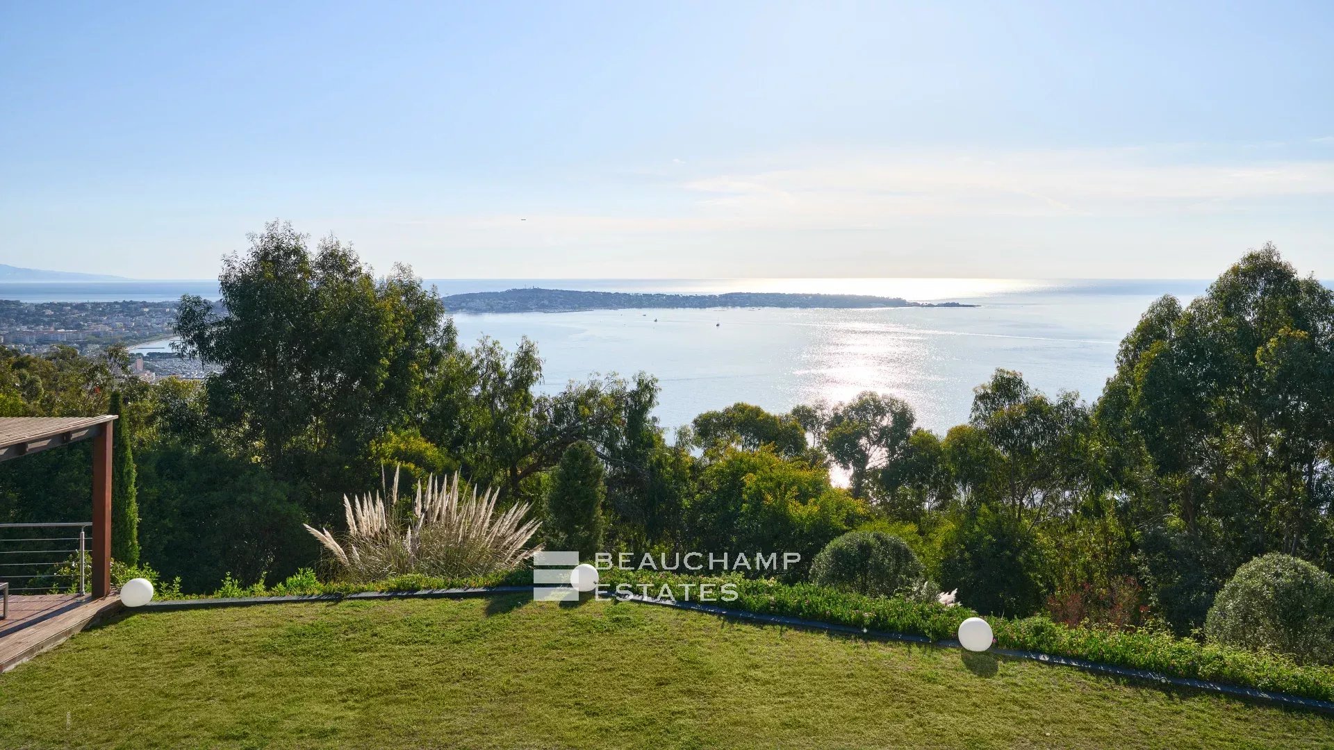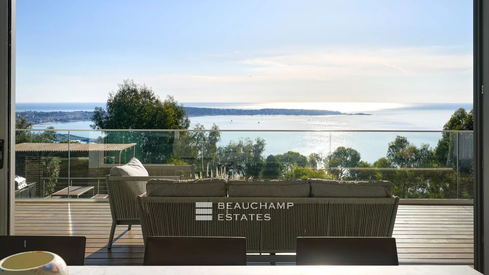 In the heart of the Super Cannes estate, a superb architect-designed villa covering approximately 426 sq.m, offering exceptional panoramic sea views stretching from the Lérins Islands to Cap d'Antibes.