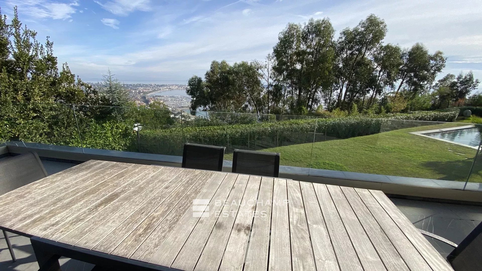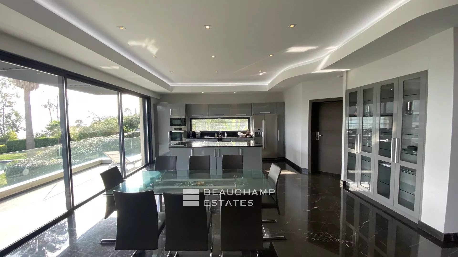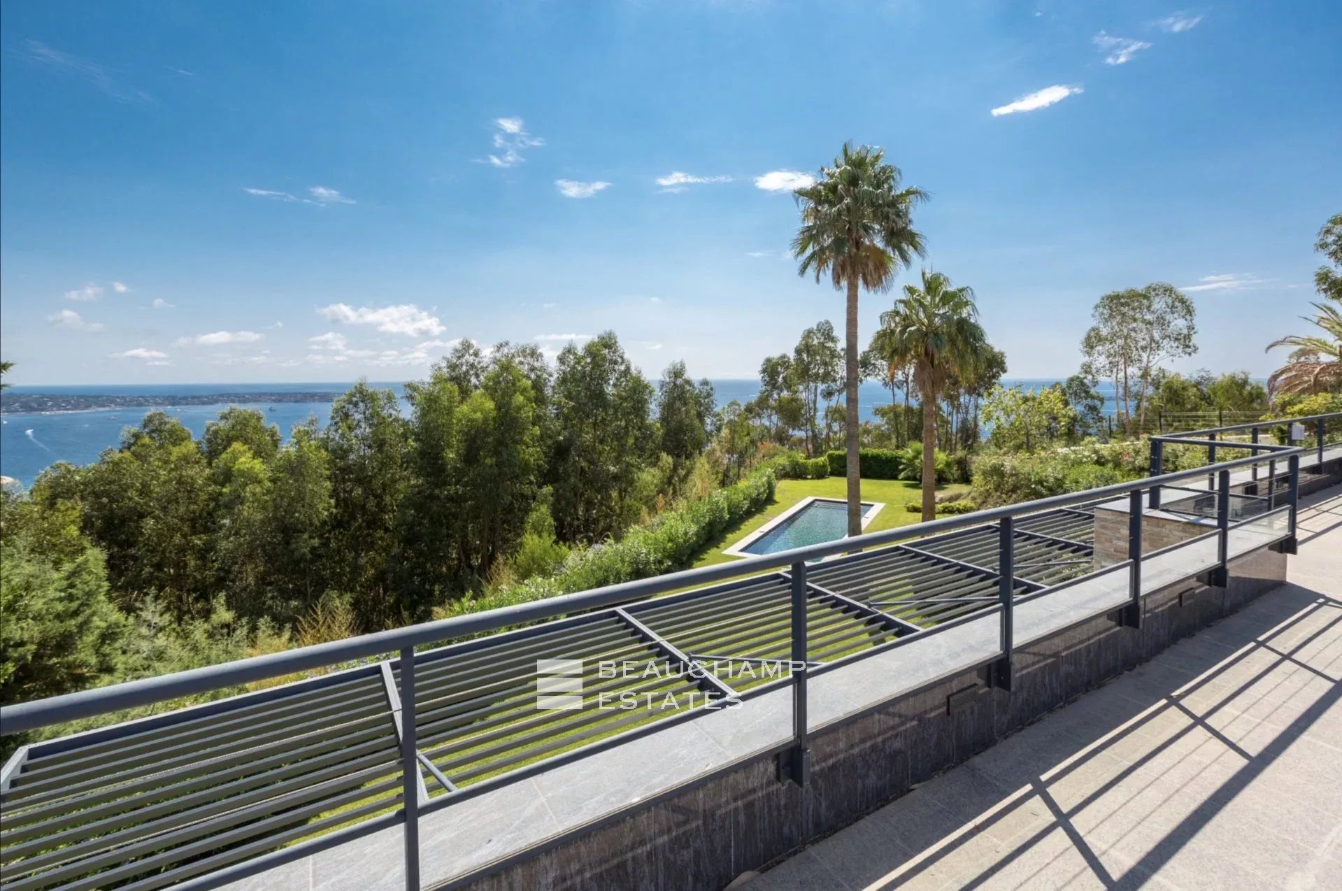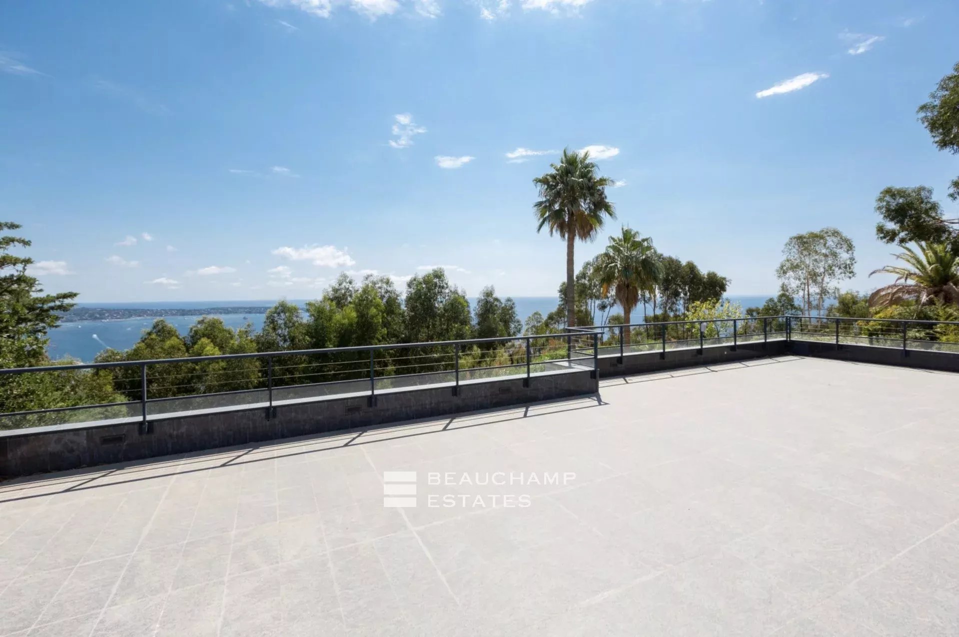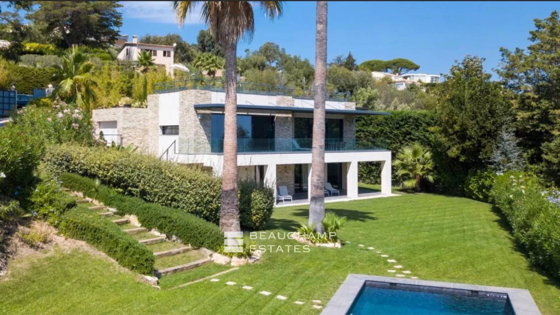 This sumptuous contemporary villa offers a panoramic sea view up to Cap d'Antibes while being nestled in a verdant setting. It benefits from top-of-the-range materials and finishes. Carefully decorated in a modern and refined style, the villa is composed as follows: